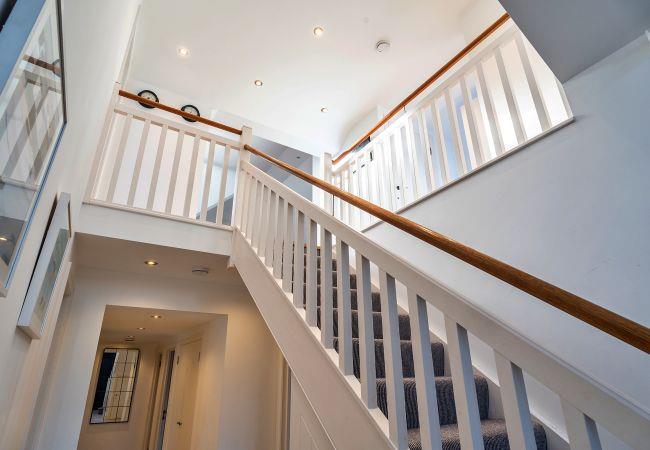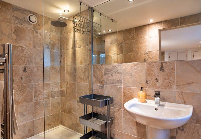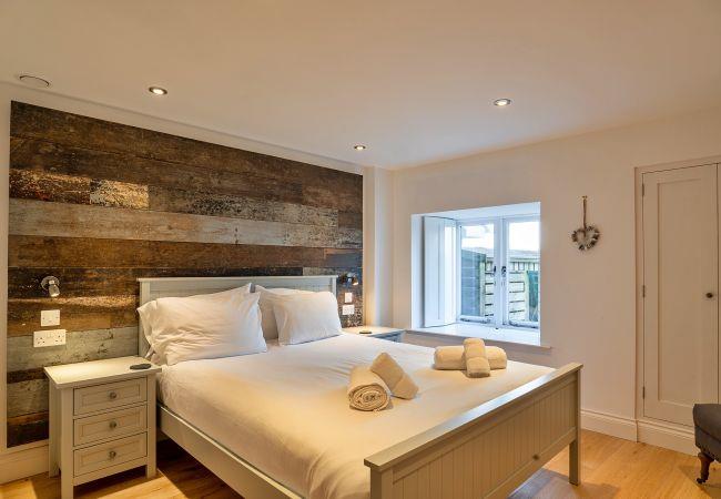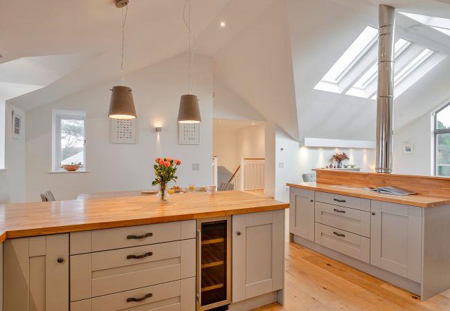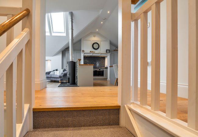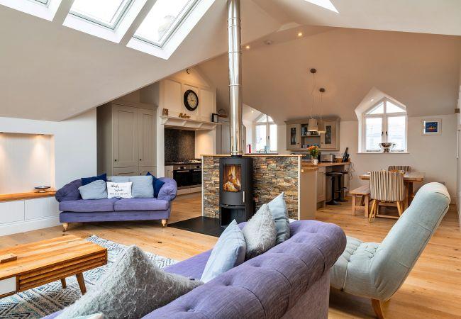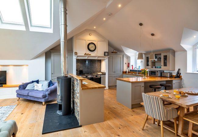 For the adults, you’ll find a spacious first floor open plan living area, undoubtedly a highlight of Dingles Cottage, with its super light and airy space. The fully equipped kitchen and large dining area are perfect for long lazy lunches, while the huge glass windows provide an ever-changing view. The lounge-area features comfy sofas, a wood burner and is equipped with Smart Tv and Wi-Fi during your stay.