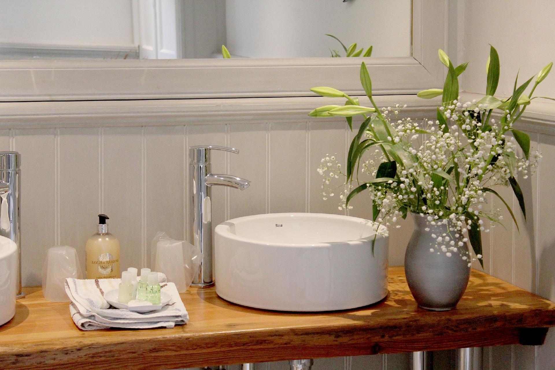 The master bathroom is a work of art. Two lovely round ceramic handbasins perched on a large chunk of recycled ship's timbers in front of the largest mirror. The freestanding bath is the centrepiece made for luxuriating in steamy splendour. Across the vast space is the shower enclosure with fixed monsoon shower and hand held shower as well. And tucked discreetly around the corner is the loo with soft close lids.