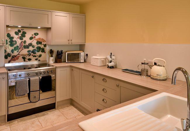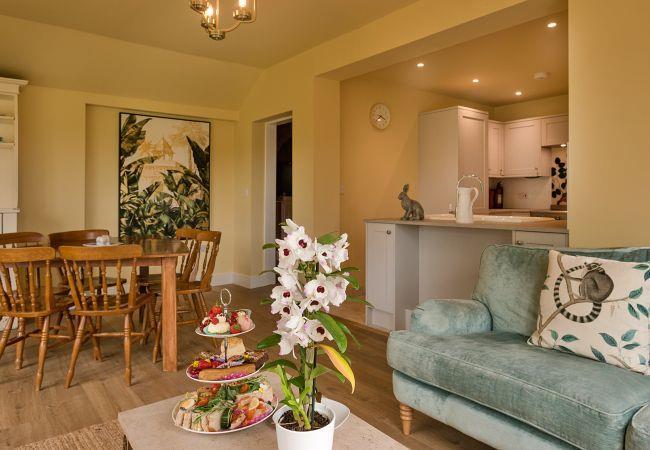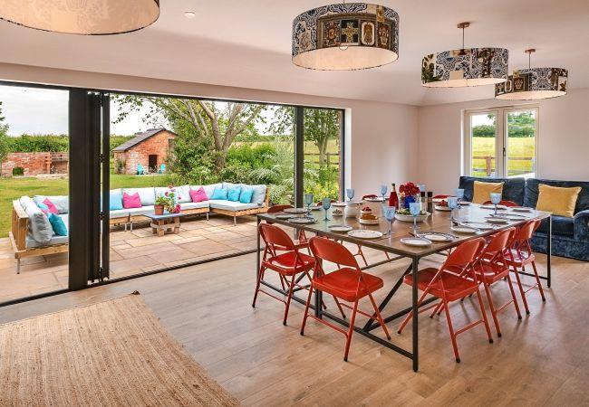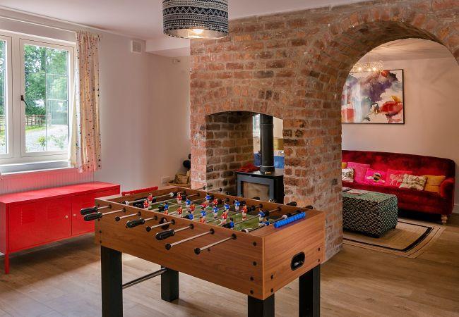 The open plan garden room in Hare Cottage is large enough for all 16 guests to socialise and sit down to eat together and features a double-sided wood burner, range cooker, wine fridge, smart tv and table football room.