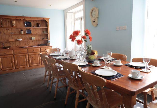 The spacious, fully equipped kitchen includes a Rangemaster oven, dishwasher, American fridge-freezer, and microwave. The large dining table seats up to 14, and the adjoining laundry/utility room is fully stocked for convenience.
