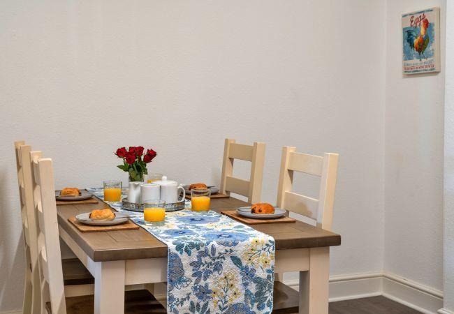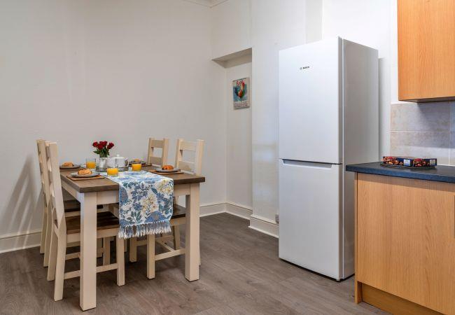 The apartment features a comfortable king-size bed and a bathroom with a shower, WC, and basin. A large, well-equipped kitchen complete with a fridge, freezer, oven, and dishwasher allows you to prepare delightful meals, accompanied by a 4-seater dining table and chairs.
