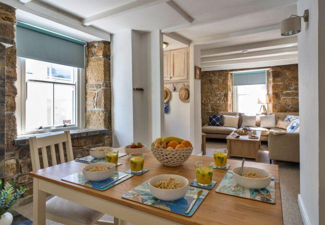 Walking in through the front door, guests will be greeted with the open living dining area. Further into the cottage you will find a fully equipped kitchen, perfect for cooking up a meal after a day of exploring St Ives. Upstairs you can find the master double bedroom, a second twin bedroom and a family shower room.
