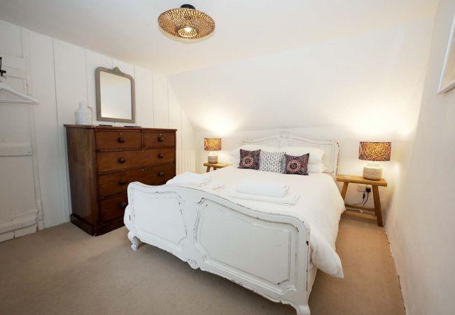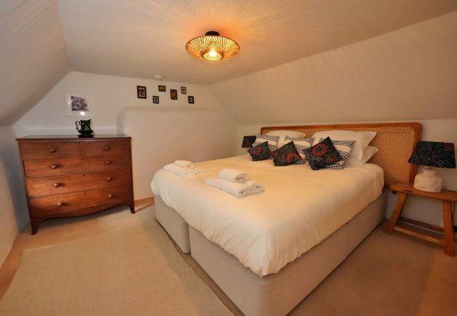 The double bedroom offers views of the garden from a window seat. The room includes a standard double bed, a chest of drawers, and wall-mounted hanging space for clothes. The second bedroom, a super king-sized can be converted into twin beds. The room includes a large chest of drawers, a built-in cupboard, and wall-mounted hanging space for clothes. An easy-to-assemble Nuna Sena travel cot is also available.