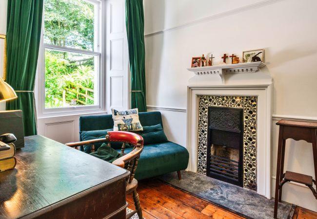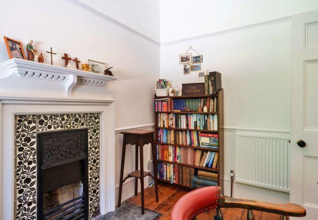 Upon entry, the vestibule showcases a traditional Victorian tiled floor that leads into a spacious hallway. The former vicar’s study still holds his original desk and religious artefacts, now repurposed into a functional study area. The living room features a stripped wooden floor, an open fireplace, and inviting leather sofas, along with scenic views of the garden through large bay windows. There is a pool table for guests to use during their stay.