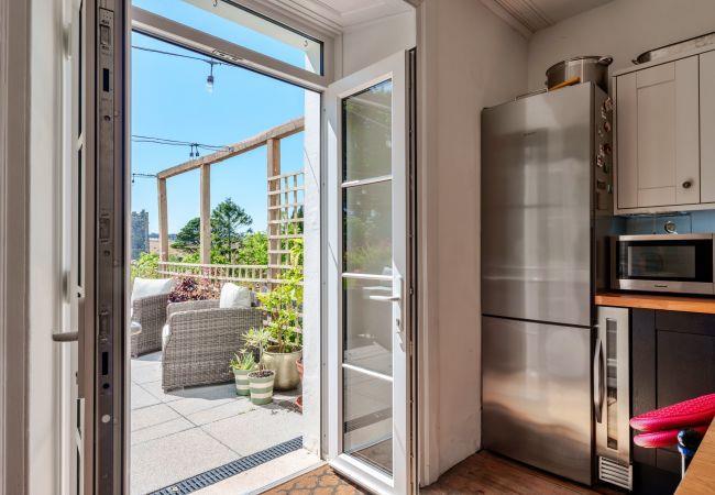 The generous kitchen and dining room are perfect for hosting, with a stripped wooden floor and French doors opening to the garden. The designer kitchen includes a SMEG double oven range with six burners and a griddle hot plate, a wine cooler, and two dishwashers—making meal preparation a pleasure. A central island with a wooden countertop and double Belfast sink completes this impressive space, ideal for family gatherings or special celebrations.