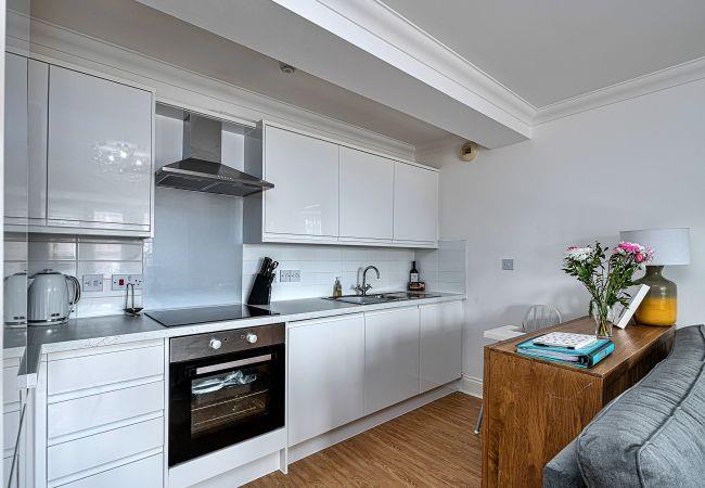 Walking inside, the property opens up to an open-plan kitchen, dining and living area which is ideal for families and friends to cook and socialise in. The large balcony doors let the light stream in and the balcony seating area is perfect to enjoy a morning coffee or evening glass of wine from. The kitchen is well-stocked with all the amenities required for a self catering stay and comes with a handy dishwasher and washing machine too.