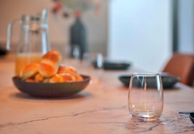 The fully equipped kitchen and large dining area are perfect for long lazy lunches, while the huge glass windows provide an ever-changing view. The open-plan design is perfect for entertaining, with modern black pendant lighting creating an inviting ambiance. The spacious, grey tiled floors add a touch of sophistication to this contemporary retreat.