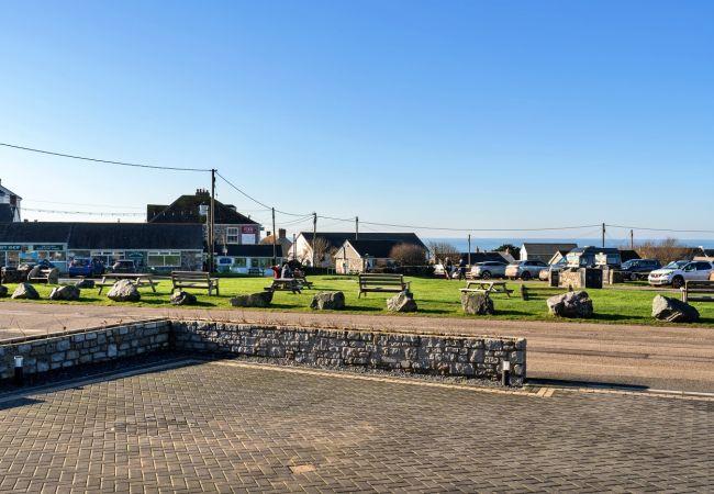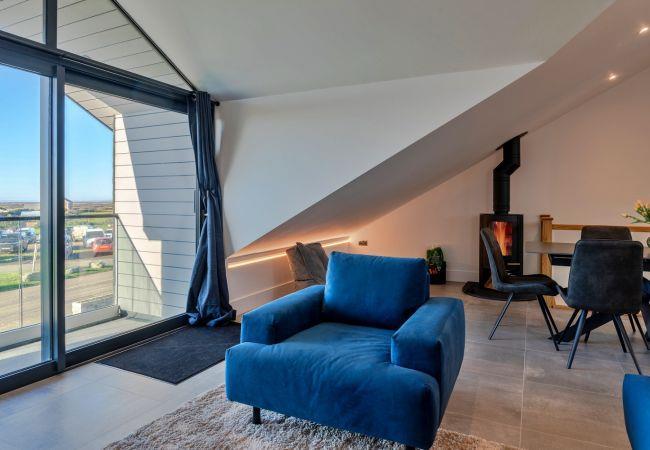 Relax by the log burner, perfect for cozy evenings, or take in the views through the expansive glass sliding doors. Step out onto the private balcony to enjoy the vibrant coastal atmosphere, with views of green lawns and the nearby parking area for easy access. This property features luxurious underfloor heating, ensuring warmth and comfort throughout the space.
