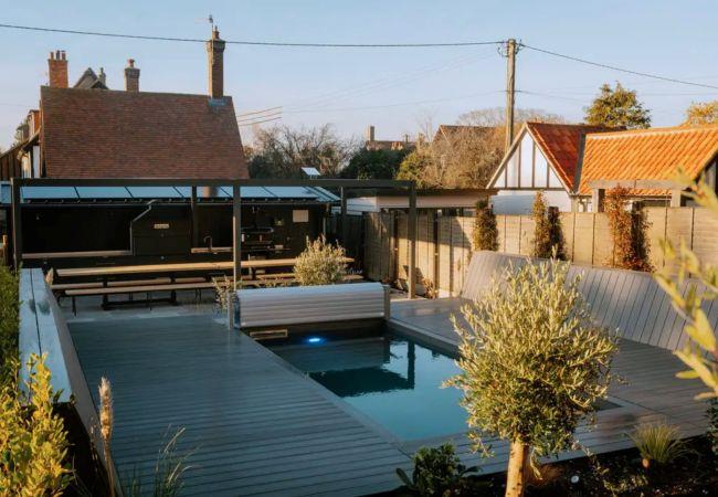 Outside, a private landscaped garden wraps around a heated pool, 8 seater wood-fired hot tub, and alfresco kitchen. Whether you’re gathering for firelit feasts, swimming under wide Suffolk skies, or finding a quiet moment in a deck chair, this space is designed for both rest and reconnection.