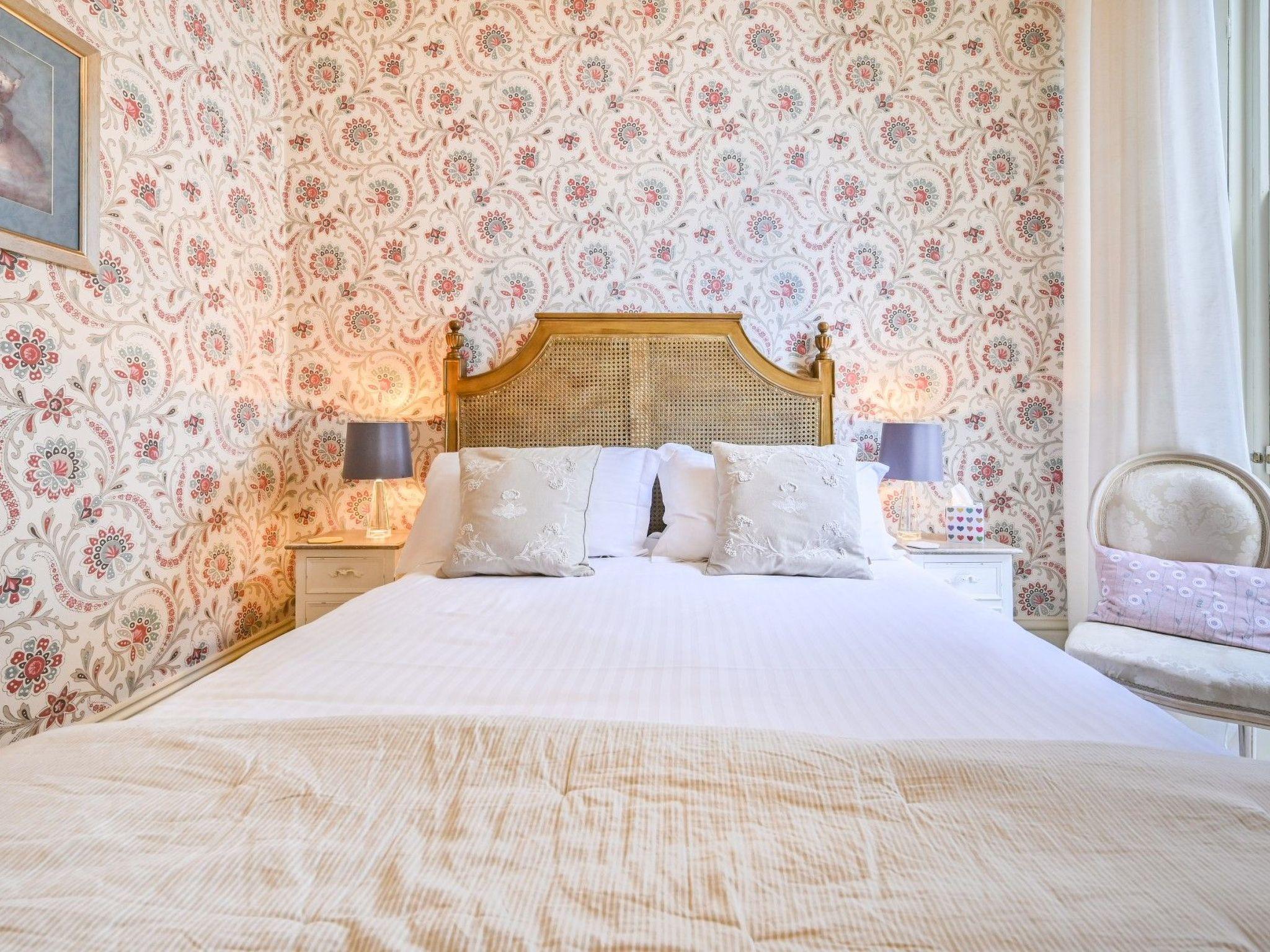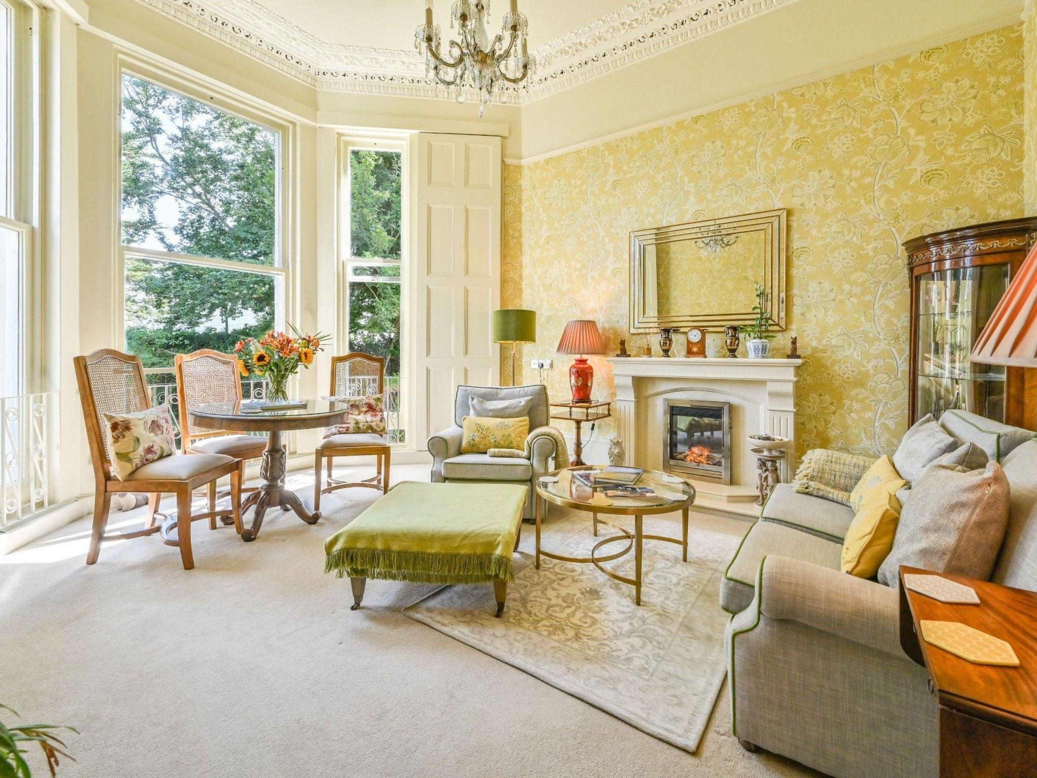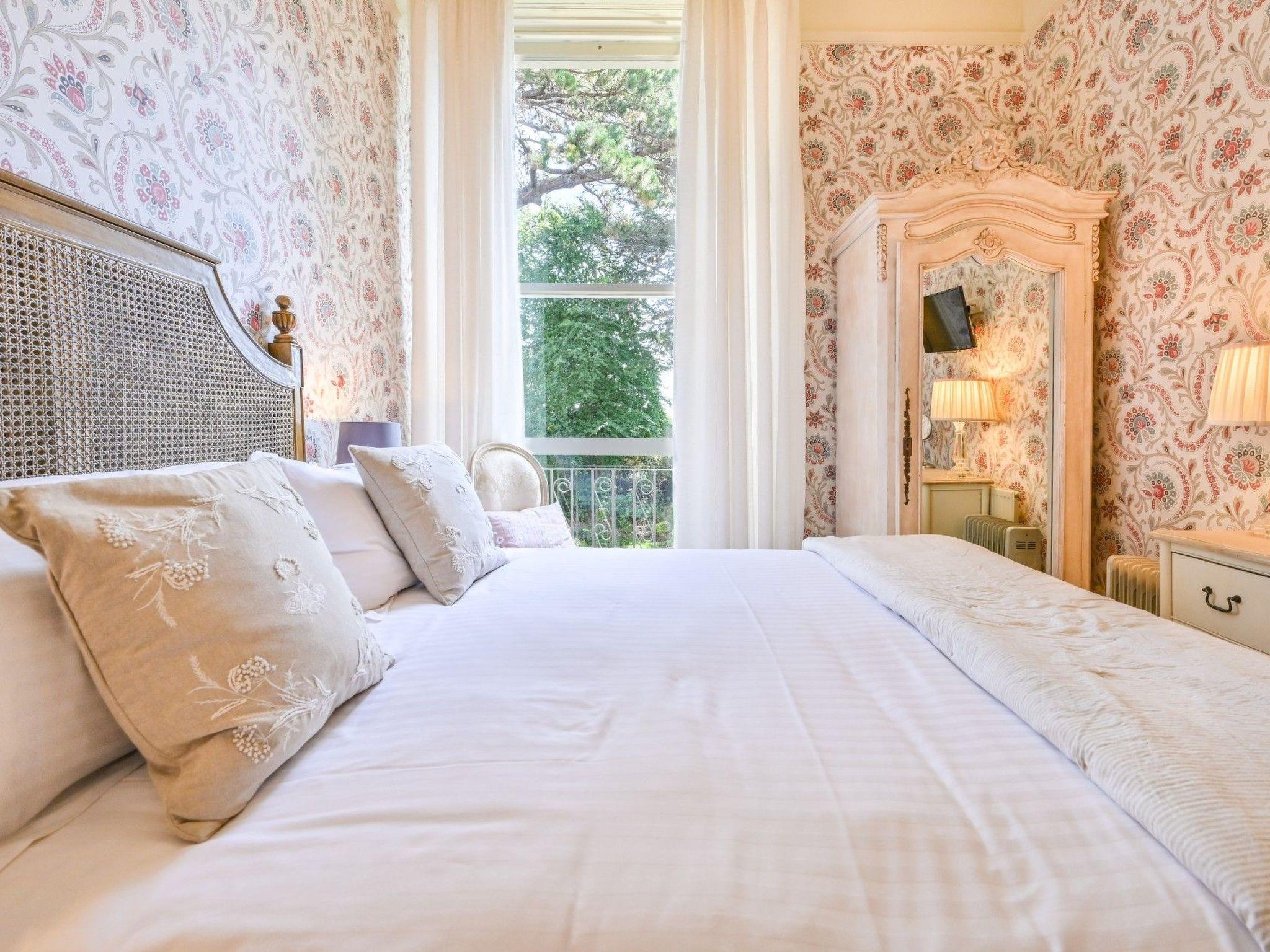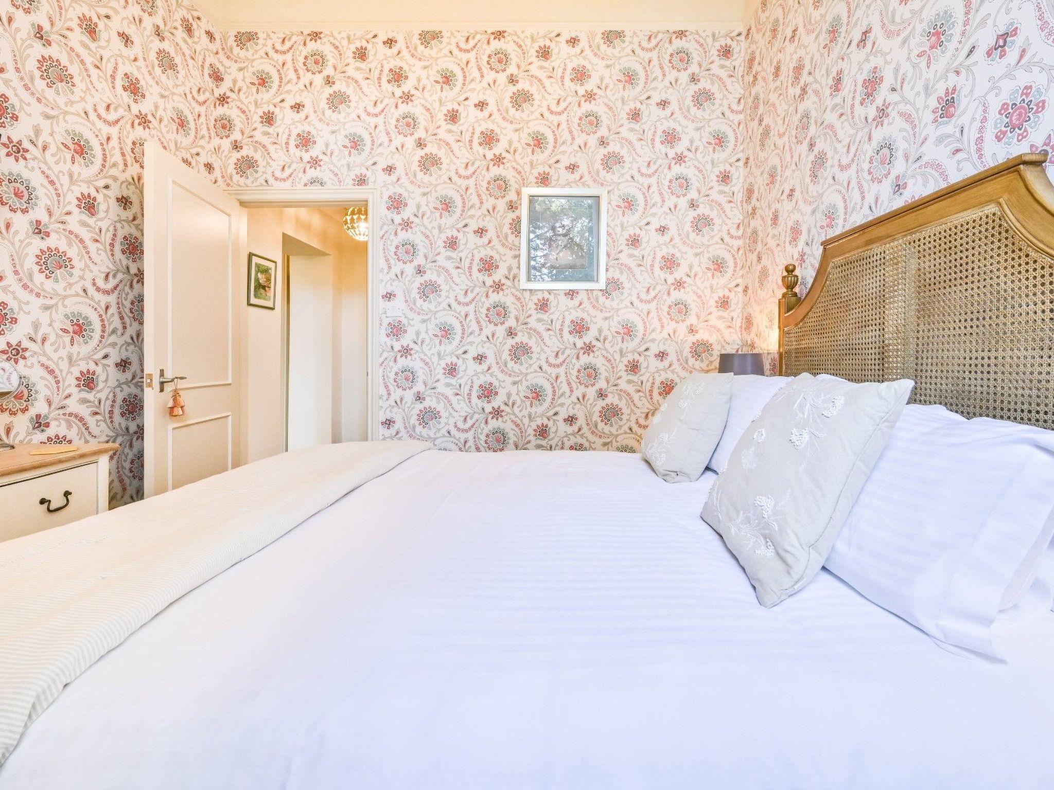 The apartment is on the ground floor of the property and overlooks the Rose Garden at the side of the building. It features an incredible living space formed from one of the original reception rooms of the villa. This space has enormous floor to ceiling windows in a bay. There is a seating area with sofa and arm chair as well as a dining area overlooking the garden. The room has a fire place with electric flame effect fire for cosy nights in. The apartment has a compact but modern and well equipped kitchen and there is a bathroom with over sized shower that has grab rails for guest who might need to steady themselves. There is also a shower seat. There is also a wonderful tranquil bedroom with a king sized bed (UK size 5 foot width). This room also overlooks the garden at the side of the property.