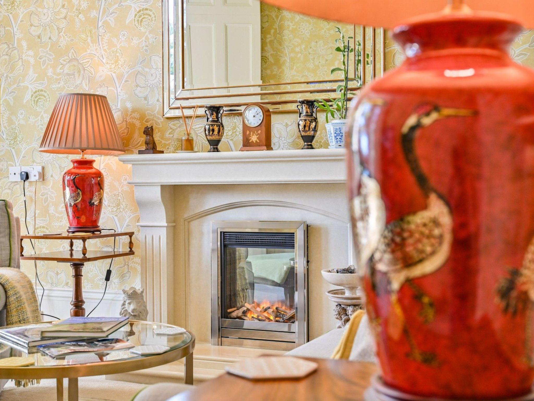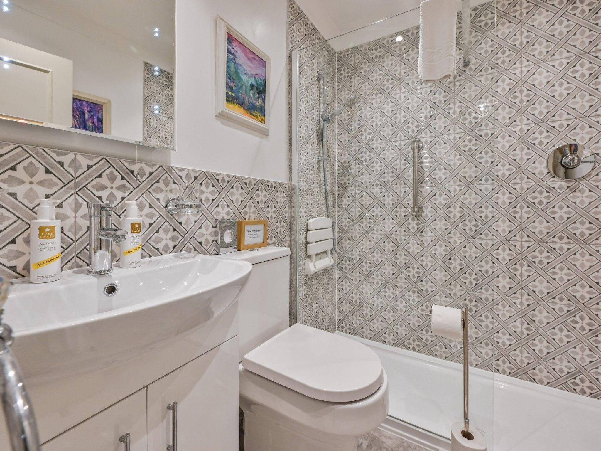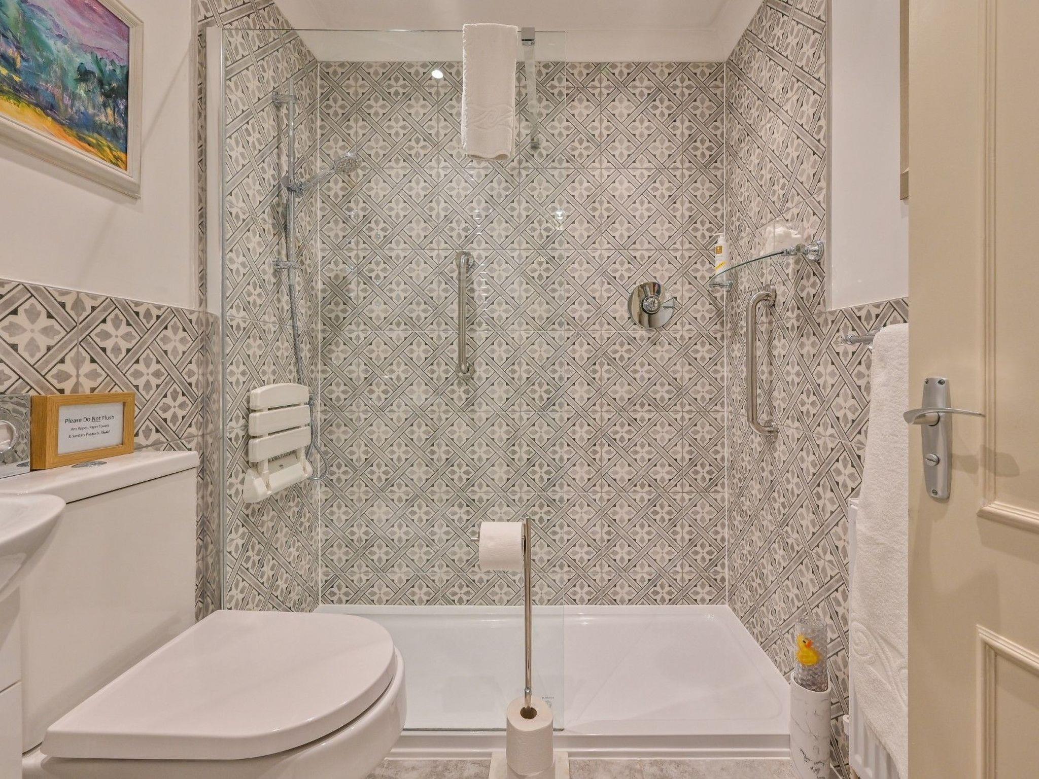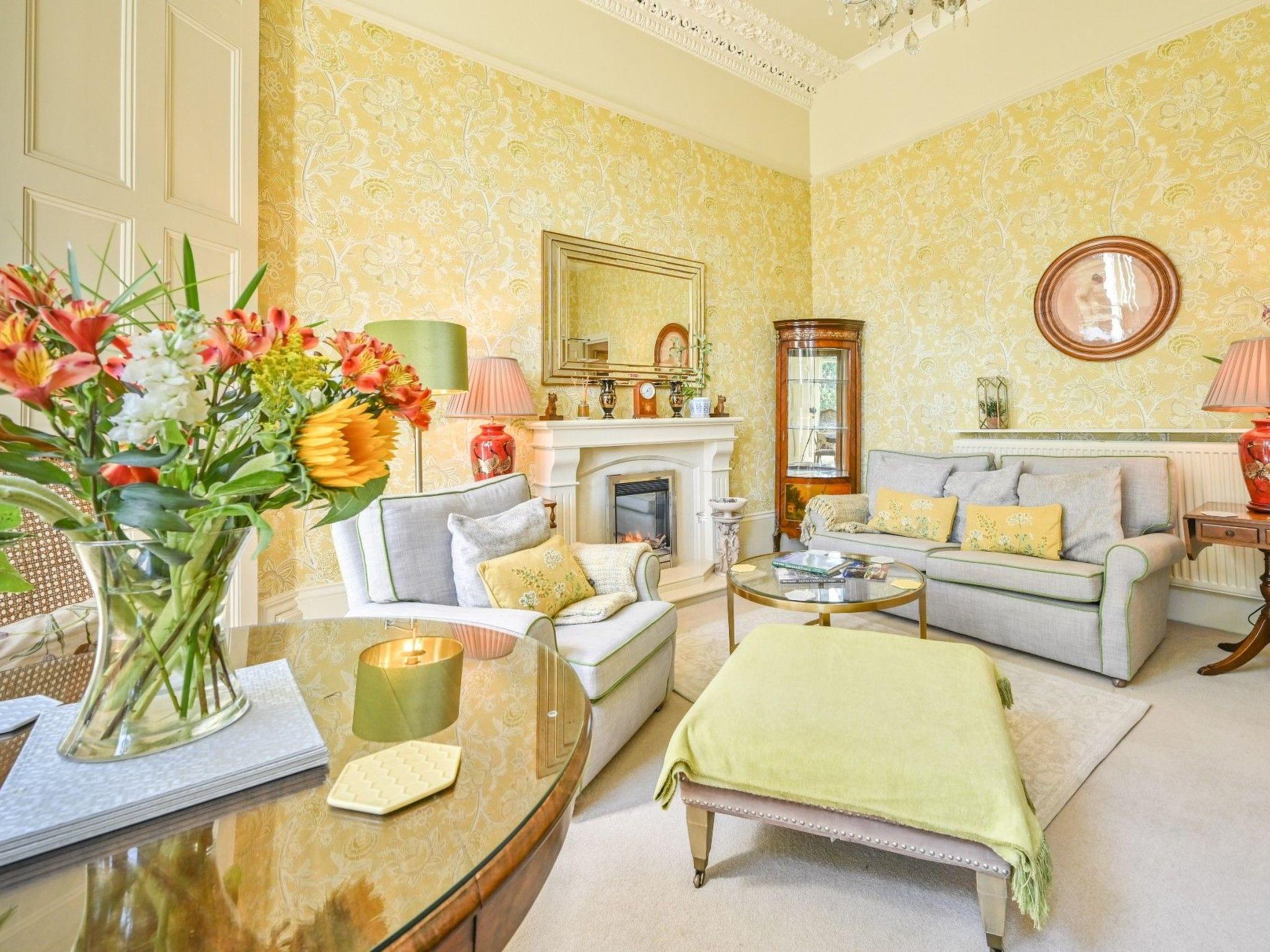 The apartment is on the ground floor of the property and overlooks the Rose Garden at the side of the building. It features an incredible living space formed from one of the original reception rooms of the villa. This space has enormous floor to ceiling windows in a bay. There is a seating area with sofa and arm chair as well as a dining area overlooking the garden. The room has a fire place with electric flame effect fire for cosy nights in. The apartment has a compact but modern and well equipped kitchen and there is a bathroom with over sized shower that has grab rails for guest who might need to steady themselves. There is also a shower seat. There is also a wonderful tranquil bedroom with a king sized bed (UK size 5 foot width). This room also overlooks the garden at the side of the property.