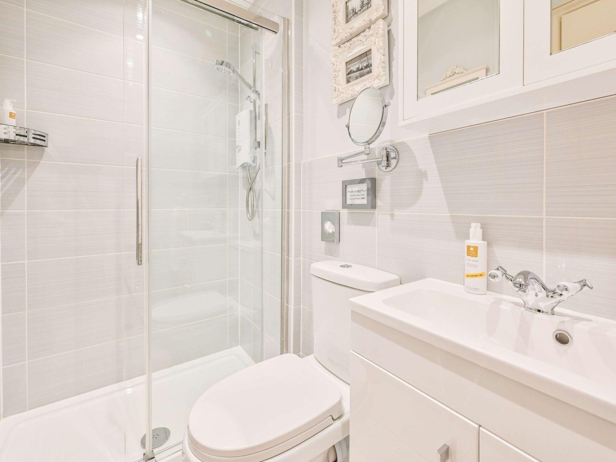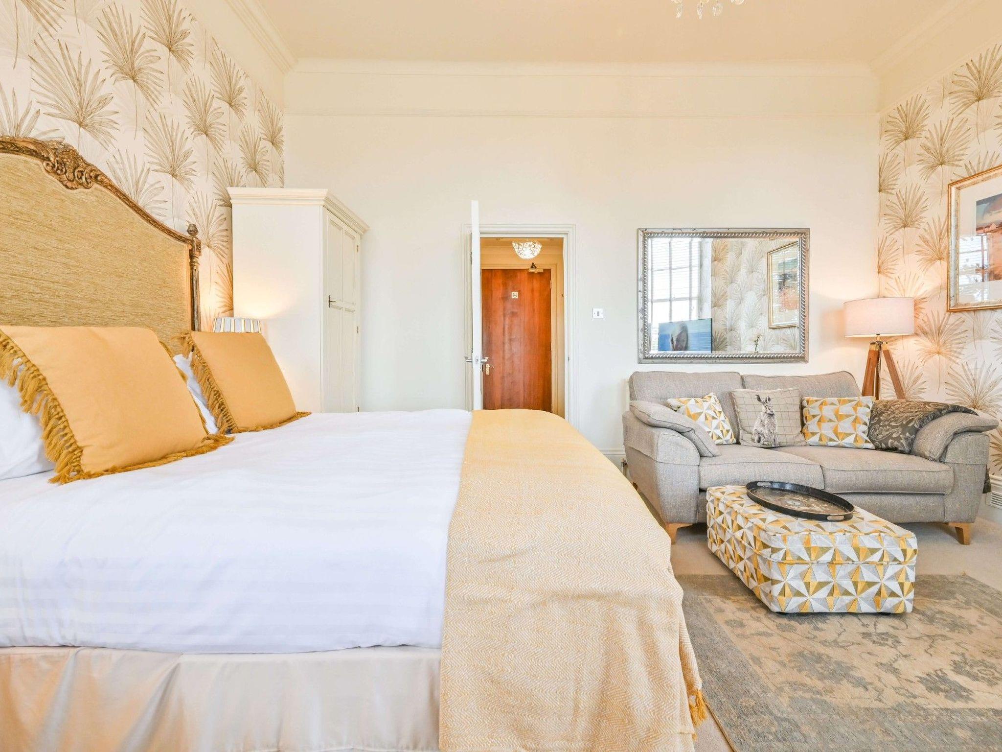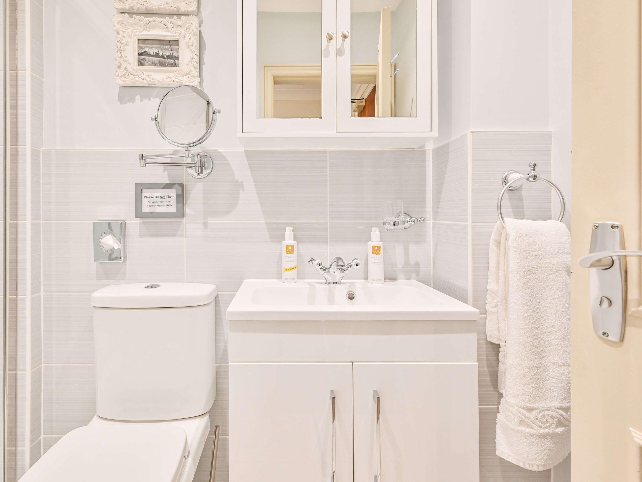 With more than 31 square meters of space, the apartment is surprisingly spacious and it benefits from a large bay window with distant sea glimpses. There is a luxury king sized bed (5 foot width) and a wardrobe. All bedding and towels are included in the rate and for guests staying for more than seven nights we undertake a complimentary bedding and towel change as well as a light clean. The apartment also features a seating area with a sofa and side tables as well as a dining table and chairs where guests can also work if on business. Free super-fast WIFI is included in the rate. In addition, the apartment has a separate kitchen which has an electric oven with a four plate electric hob. There is also a microwave, coffee maker, dishwasher and a fridge. We supply guests with a complimentary welcome pack of teas, coffees and milk etc. The property has a communal laundry room (at garden level) with coin operated washers and dryers. We supply guests with complimentary detergent. There are ironing facilities here too Finally, there is a shower room with electric shower, wash basin and toilet.