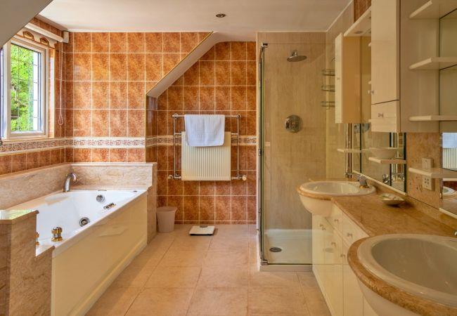 The house sleeps up to twelve adults, with additional beds available for children, and includes six individually styled bedrooms—four with en-suite bathrooms. High-quality linens, towels, bathrobes, and toiletries are provided throughout. The top-floor bedrooms enjoy the most spectacular sea views, with the master suite featuring a super king bed, private balcony, and a luxurious en-suite bathroom complete with jacuzzi bath and double vanity.
