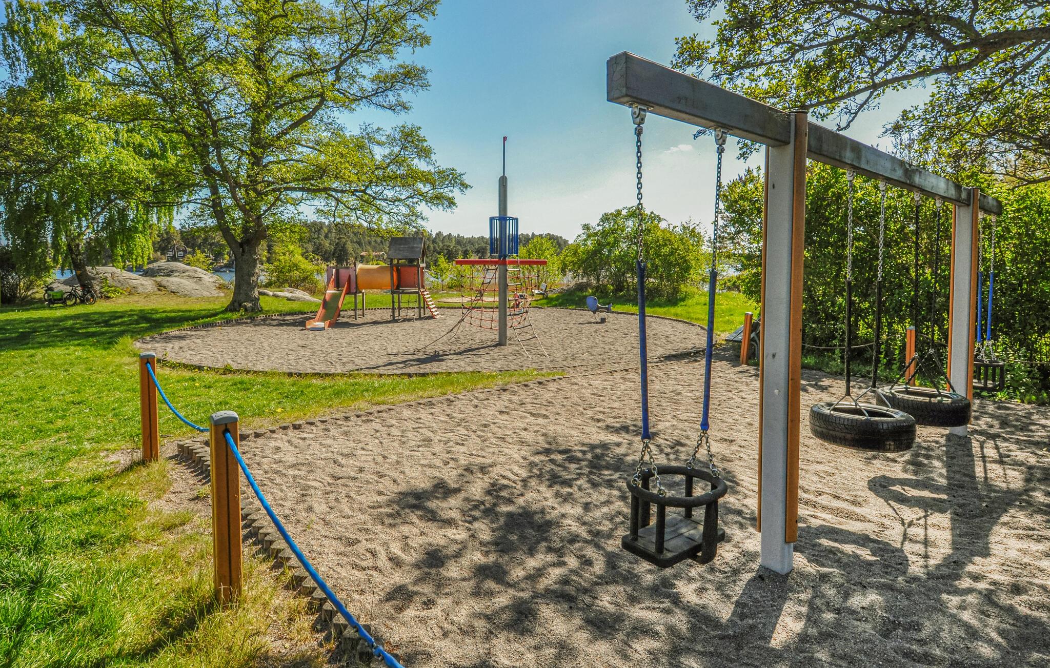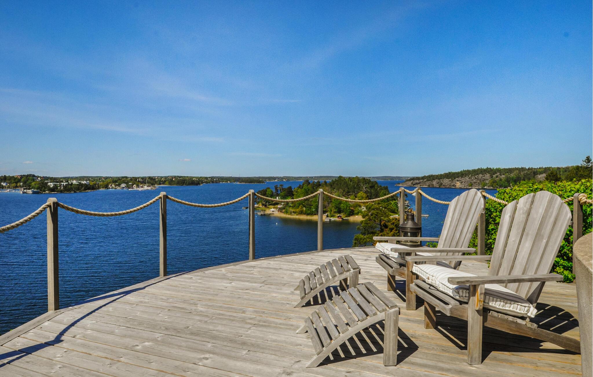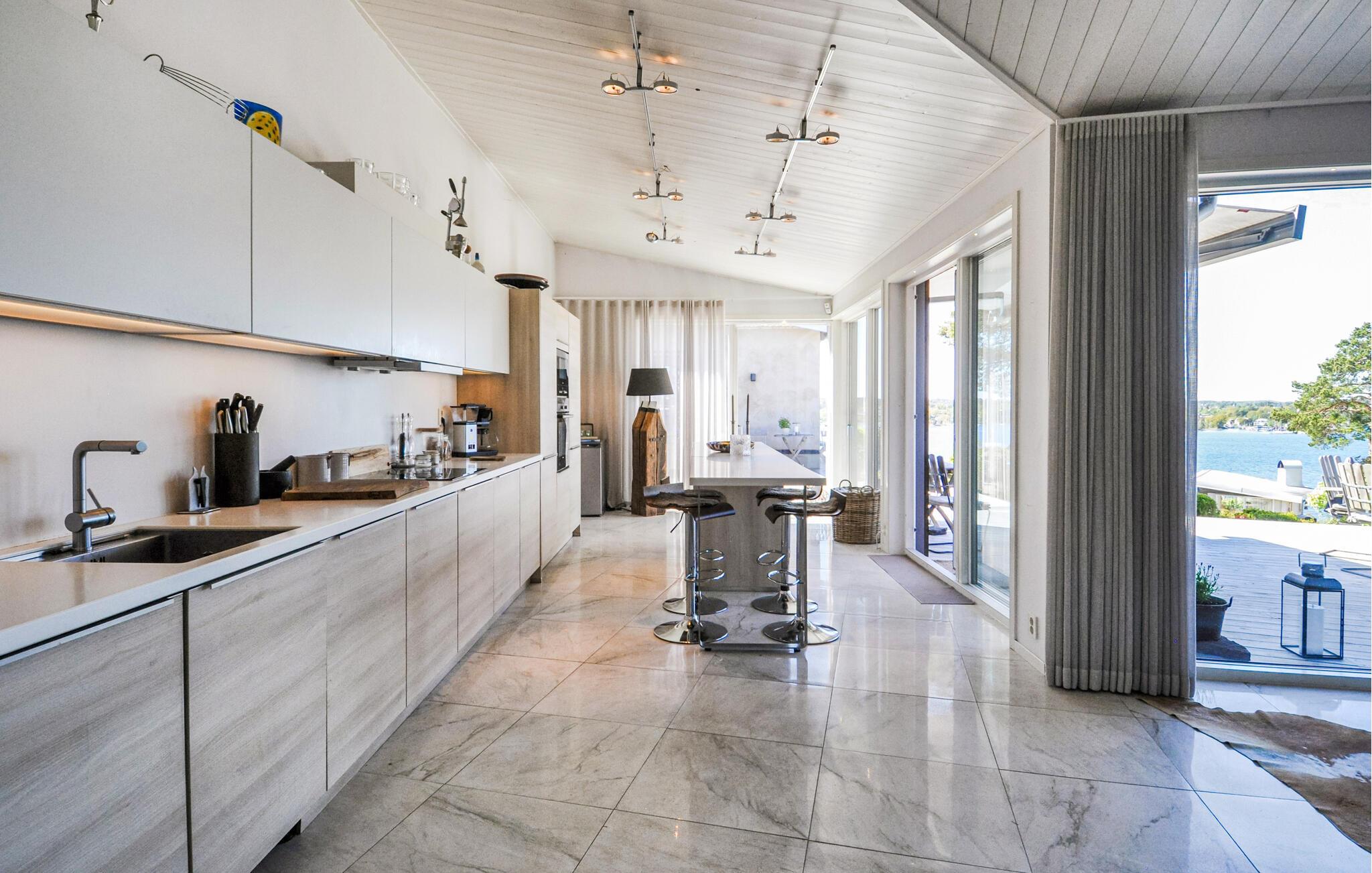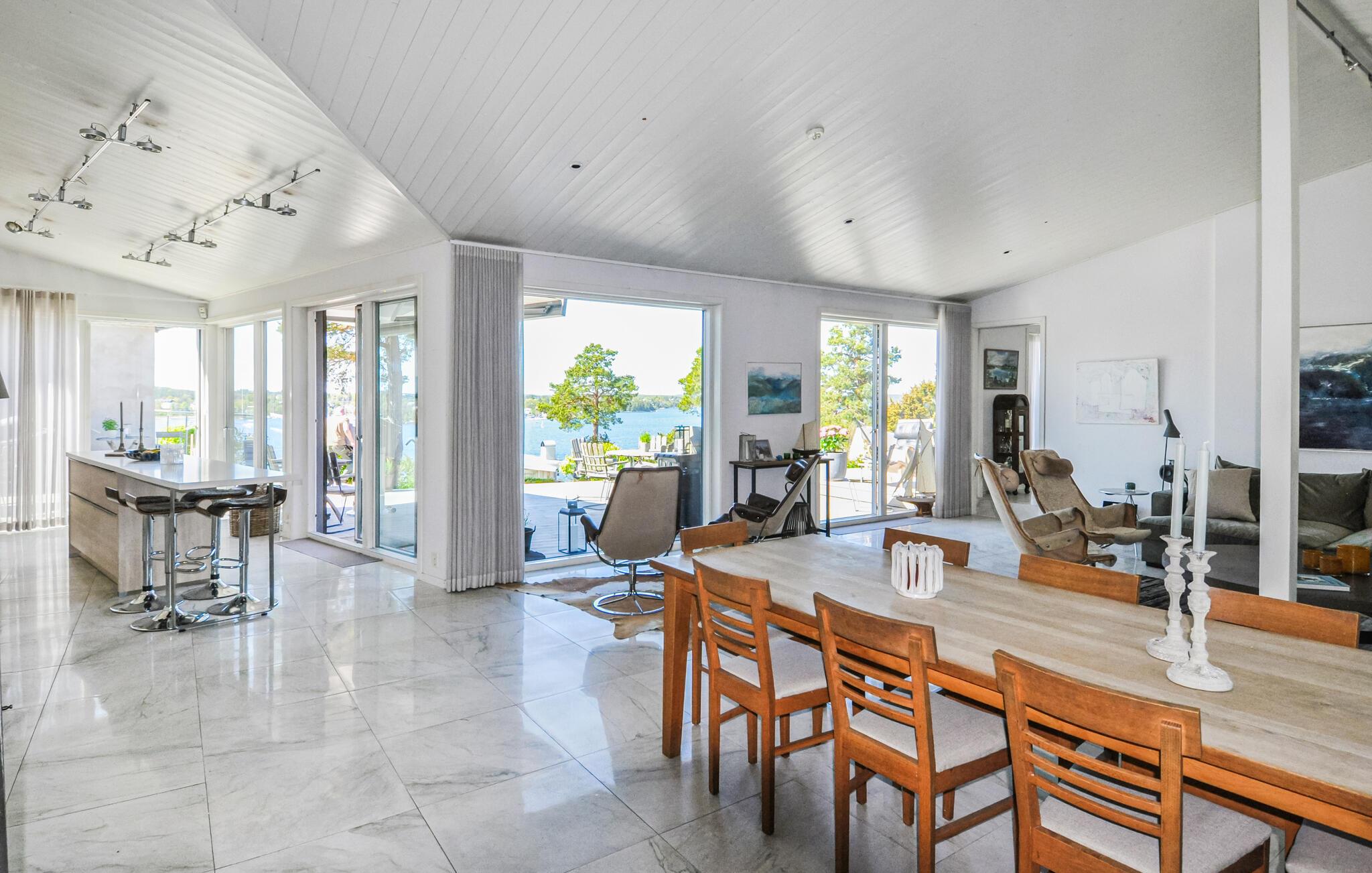 Nyd luksuriøse ferier med panoramaudsigt og direkte adgang til skærgården. Tilbring en eksklusiv ferie på øen Algö i dette rummeligt designede feriehus med enestående udsigt over vandet. Kombinationen af moderne arkitektur, naturlige omgivelser og gennemtænkt komfort i hovedhuset skaber de ideelle betingelser for uforglemmelige dage ved havet. Bliv budt velkommen af lyse værelser, store glasfacader og en åben planløsning. Slap af på komfortable designermøbler med udsigt over bugten, eller nyd hyggelige timer i det elegante køkken med køkkenbord og spisebord. Læn jer tilbage til sofaen med en bog, eller nyd filmaftener sammen i den smagfuldt møblerede stue. Alle værelser tilbyder adgang til naturen, hvilket skaber et problemfrit samspil mellem inde og ude. Udnyt det brede udvalg af terrasser til morgenmad i morgensolen, solbadning i en liggestol eller en dukkert i spabadet med vidunderlig udsigt over skærgården. Vælg mellem rolige retræter og åbne områder til sociale sammenkomster. Besøg Saltsjöbaden, kun få kilometer væk, med dens restauranter, svømmemuligheder og nærhed til en golfbane. Tag ture til Stockholms centrum, som er let tilgængeligt, eller udforsk skærgården med båd.