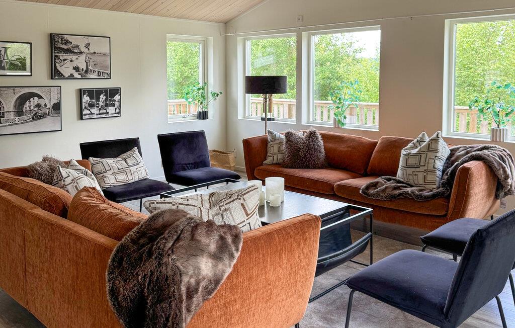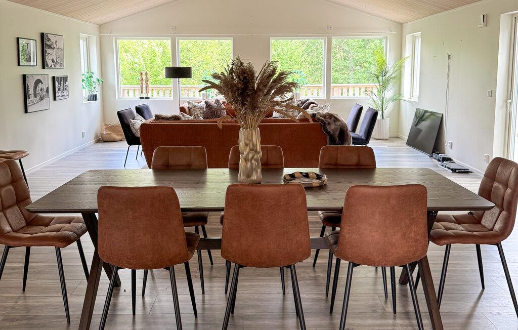 Glæd jer til det rummelige område med stue og spisestue, hvor de store vinduer lukker masser af dagslys ind og giver en smuk udsigt til det grønne. Hyg jer sammen i de komfortable sofaer, og nyd dejlige stunder i den hjemlige atmosfære. Ved det lange spisebord er der plads til alle til fælles måltider, og den moderne indretning skaber en behagelig stemning.