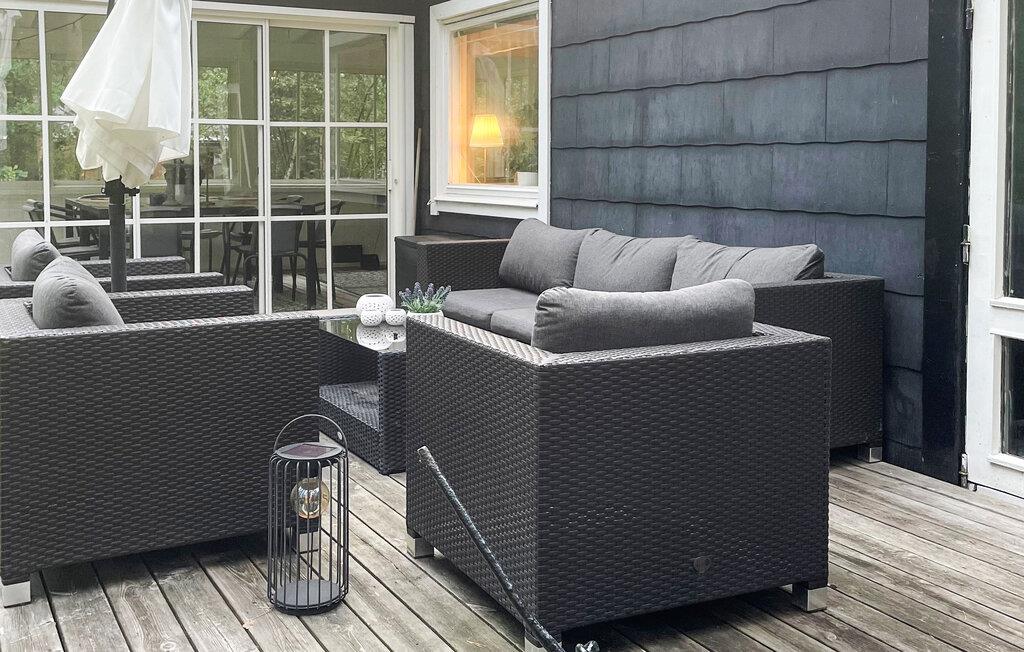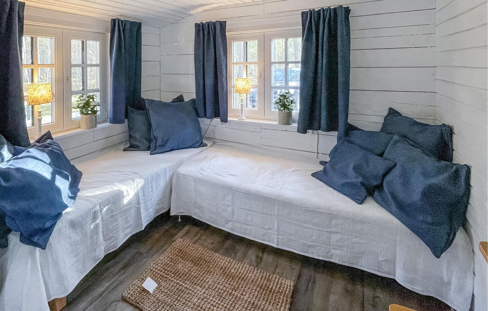 Oplev afslappende dage i et landskabeligt attraktivt område, tæt på hav og sandstrand. Den hyggelige stue er indrettet med komfortable møbler, der skaber en afslappet atmosfære. Se en god film om aftenen, eller læs en spændende bog i den bløde sofa. Det naturlige lys og den smukke udsigt over landskabet bidrager til den indbydende stemning.