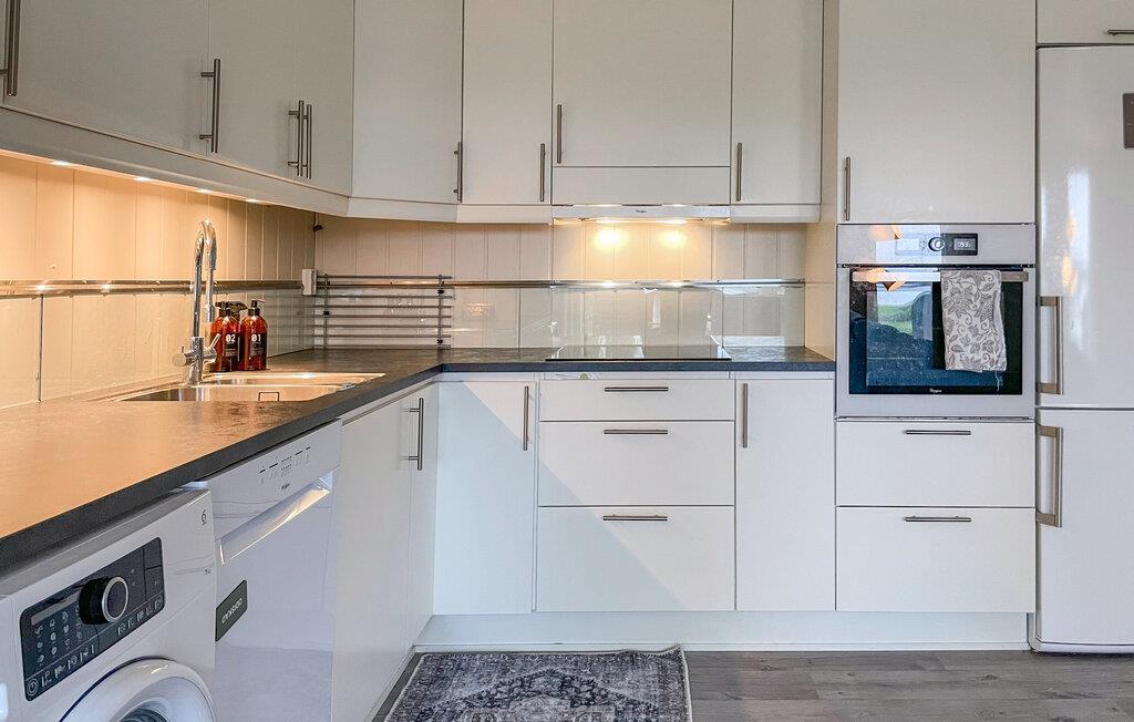 Inde i huset venter en rummelig og hyggelig stue med direkte adgang til terrassen. Læn jer tilbage på den komfortable sofa og lad blikket vandre gennem de store vinduer, der fylder rummet med naturligt lys. Det moderne, lyse køkken er veludstyret og lægger op til at tilberede jeres yndlingsretter.