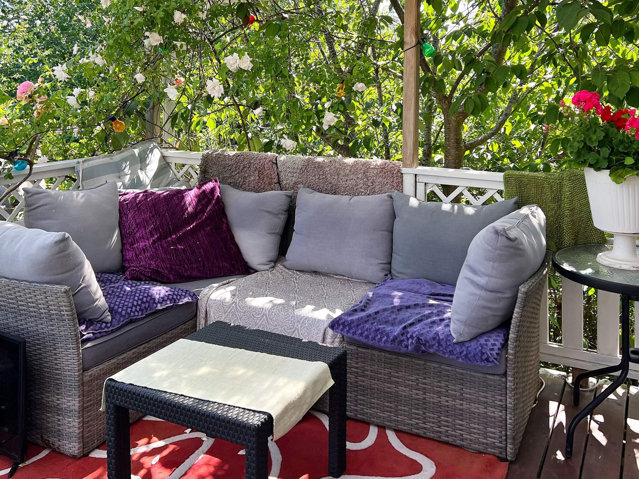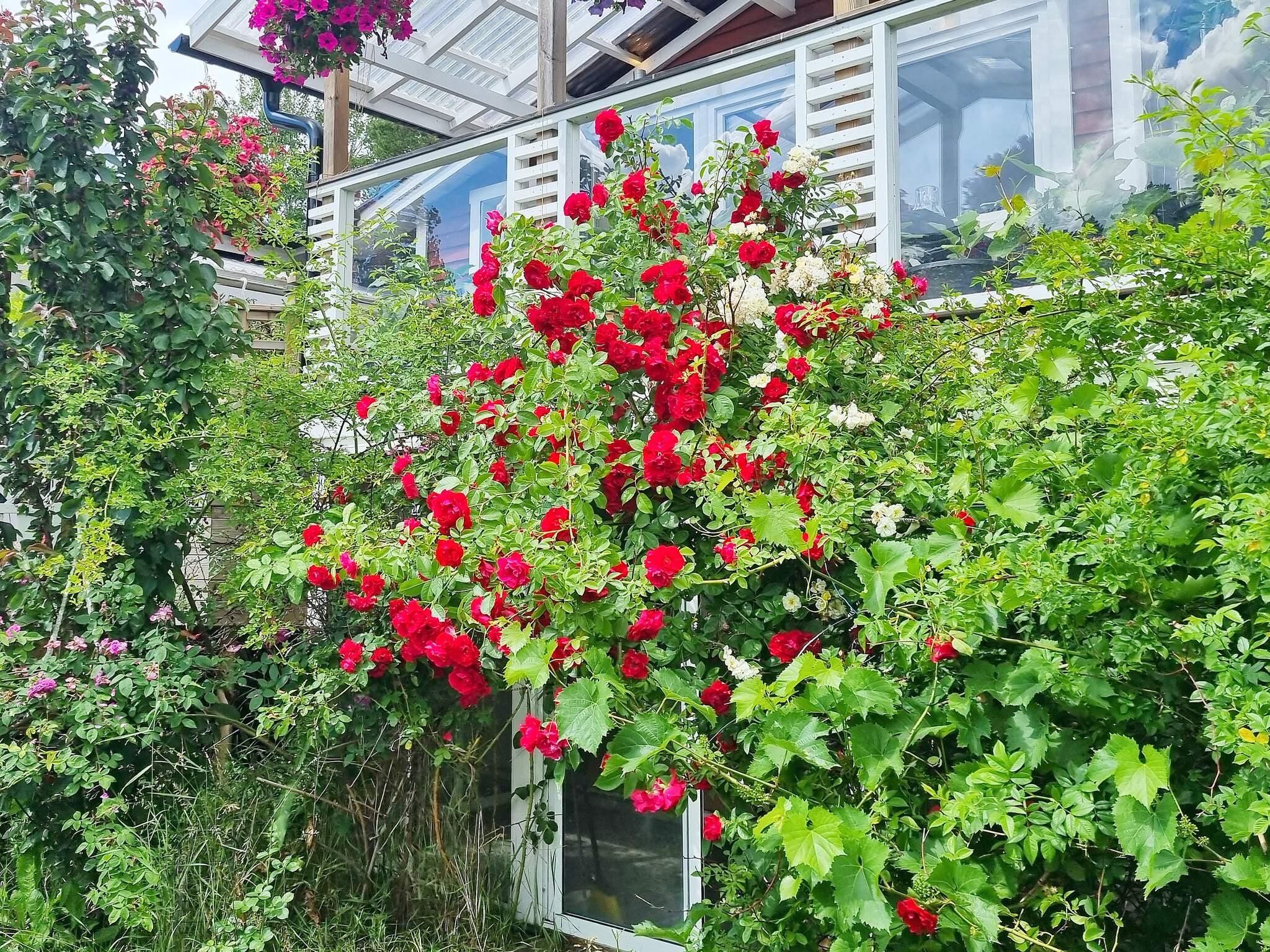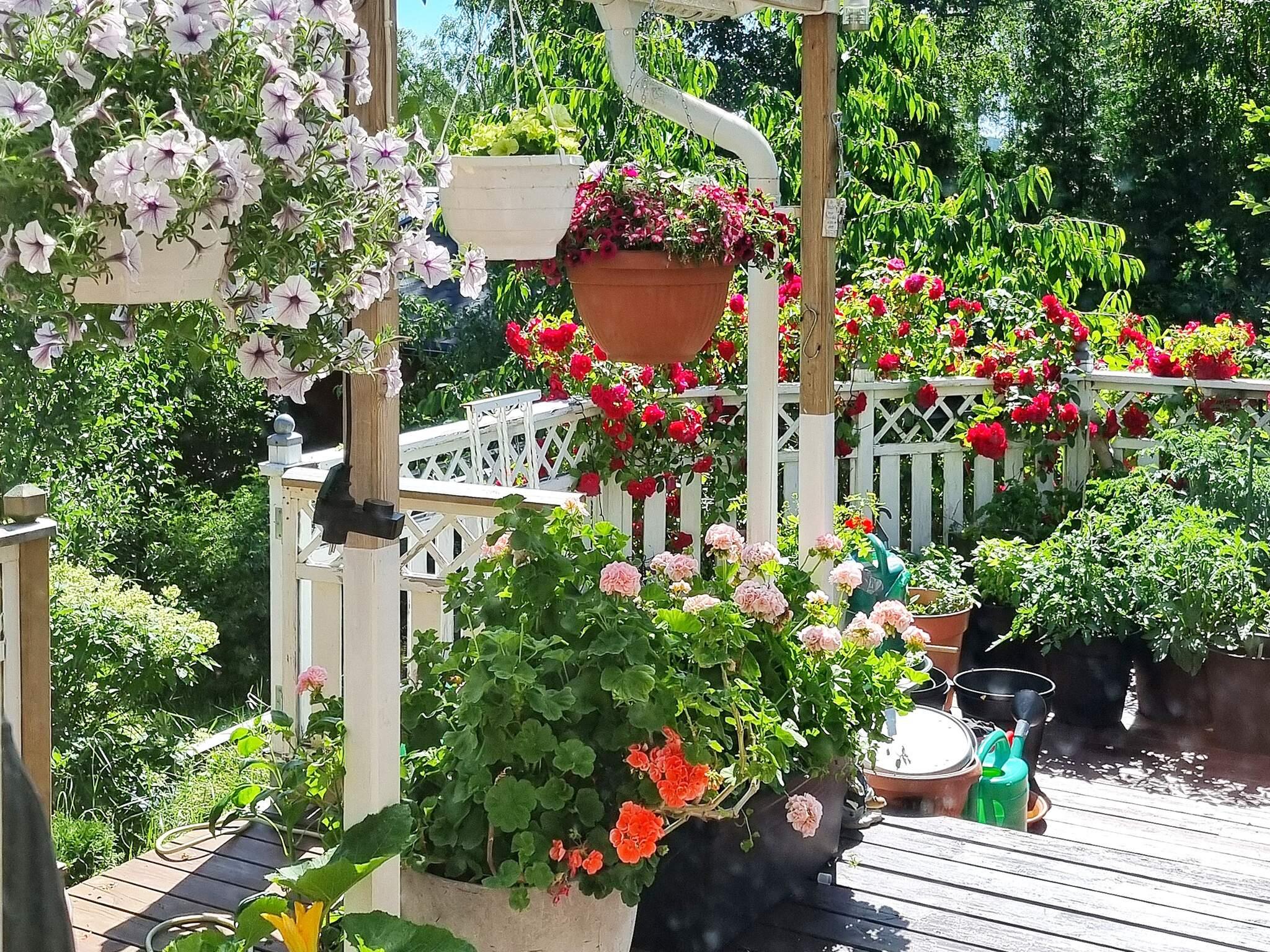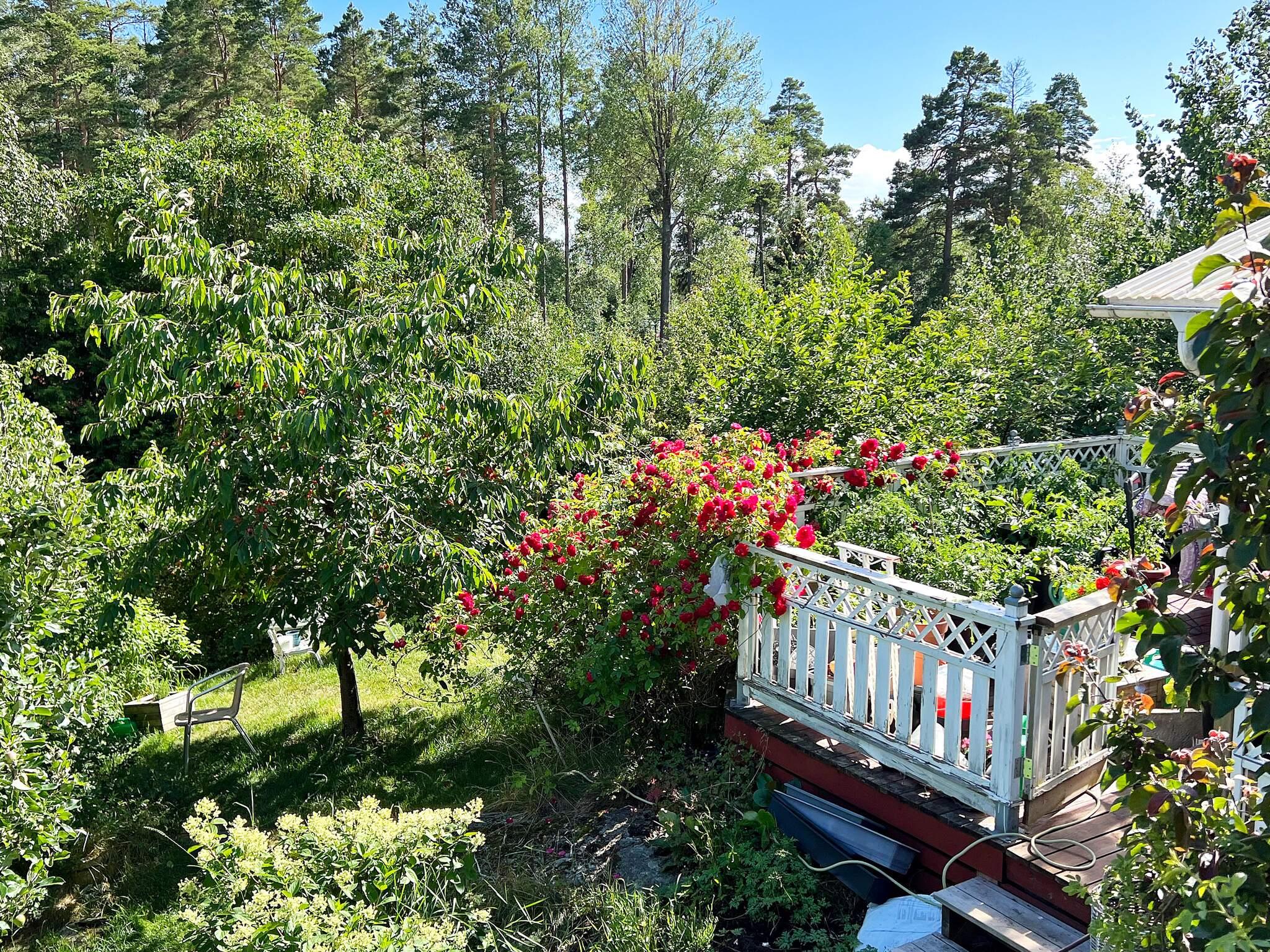 Ägaren älskar blommor och har byggt upp en fantastisk oas av rosor och andra doftande och vackra växter i trädgården. Här finns också både äppelträd, päronträd, plommonträd och körsbärsträd, bara att plocka och äta. På den stora altanen växer det gott om tomater som man också gärna får äta av.