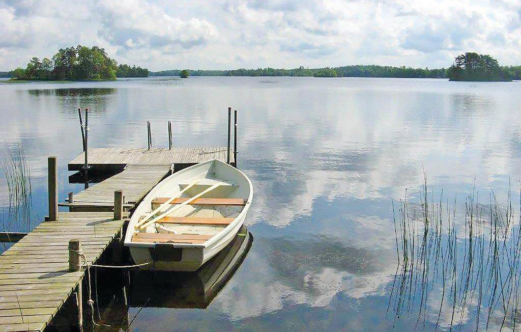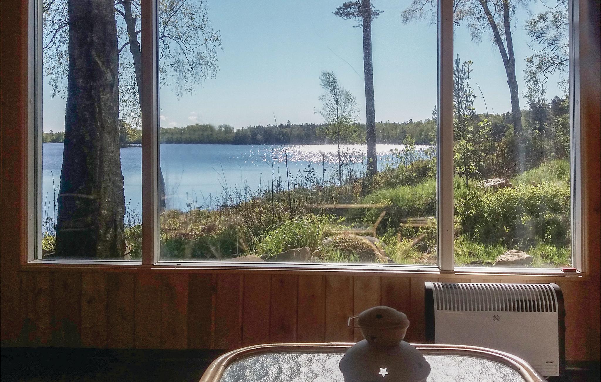 Huset ligger på en odde kun 25 m fra stranden. Feriehuset ved søen med 14 øer er perfekt for naturelskere og fiskeentusiaster. Både fra den overdækkede terrasse, og fra det rummelige opholdsrum har I en storslået udsigt til søen. Huset med brændeovn er rummeligt, og der er højt til loftet.