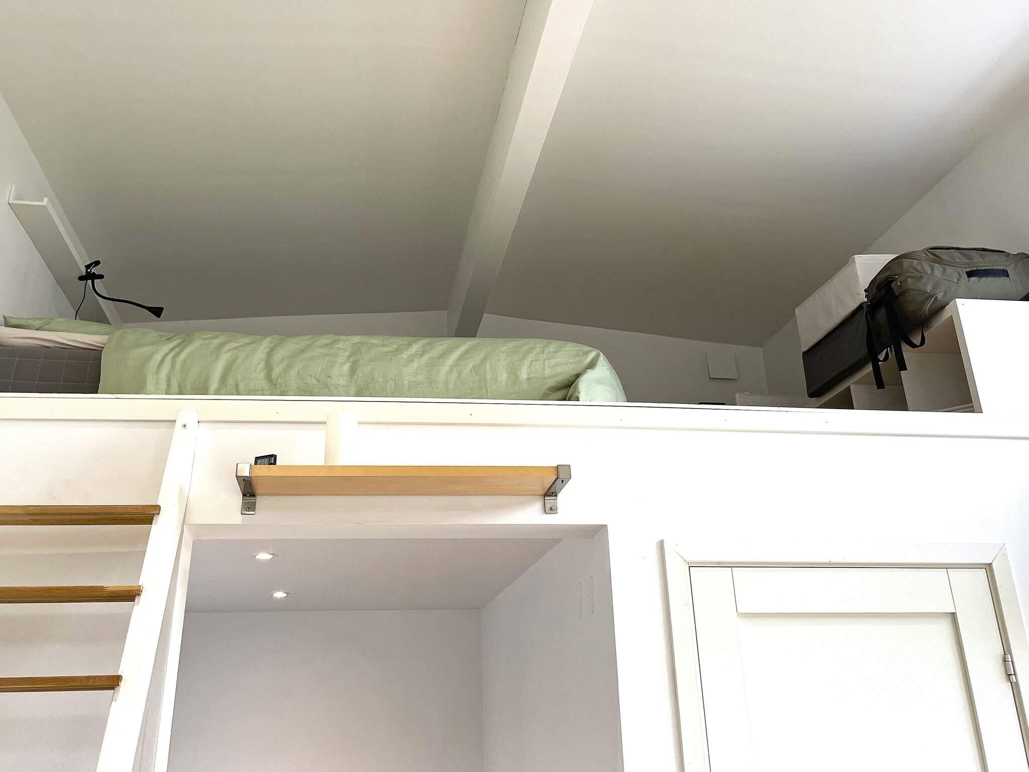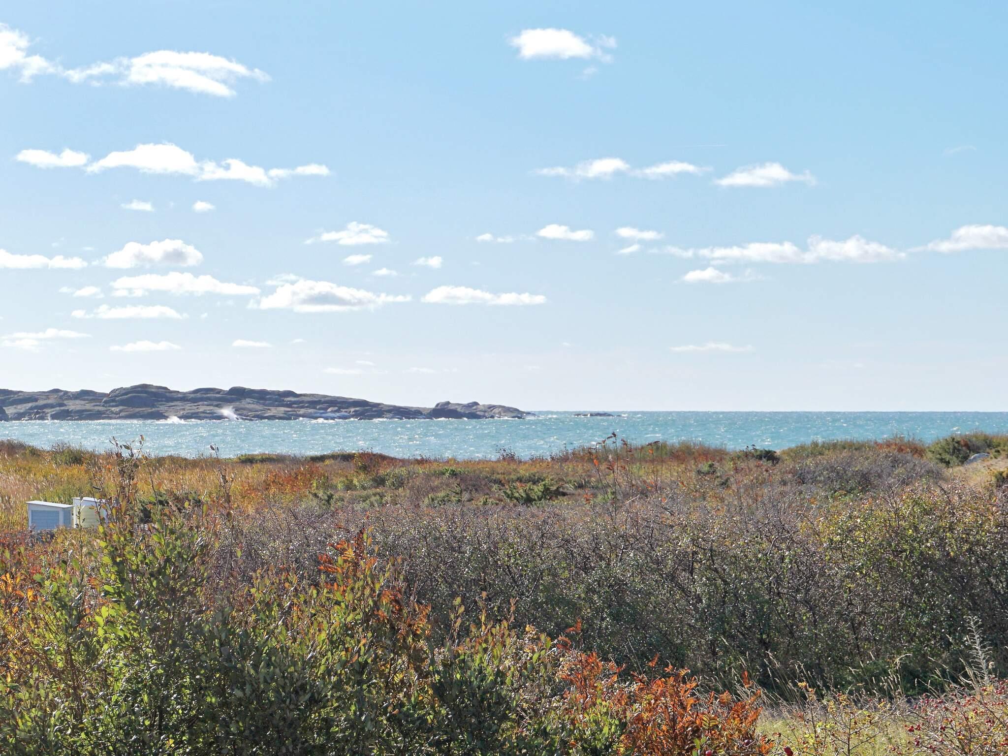 Inne i stugan möts ni av en mindre hall och där hela rummet öppnar upp sig. Allt är ljust och fräscht. Det är öppen planlösning med kök som är integrerat med matplats för 2 personer. Det är högt upp till tak med spotlight. En liten alkov för tv-hörna och soffa finner ni under trappen. Badrummet är kaklat i vitt och har wc/handfat/dusch och tvättmaskin. Loftet är ett sovloft med låg takhöjd med en dubbelsäng för 2 personer. Allt är enkelt och stilrent och smakfullt. Det finns en liten altan för morgonens första kopp med utsikt över havet.