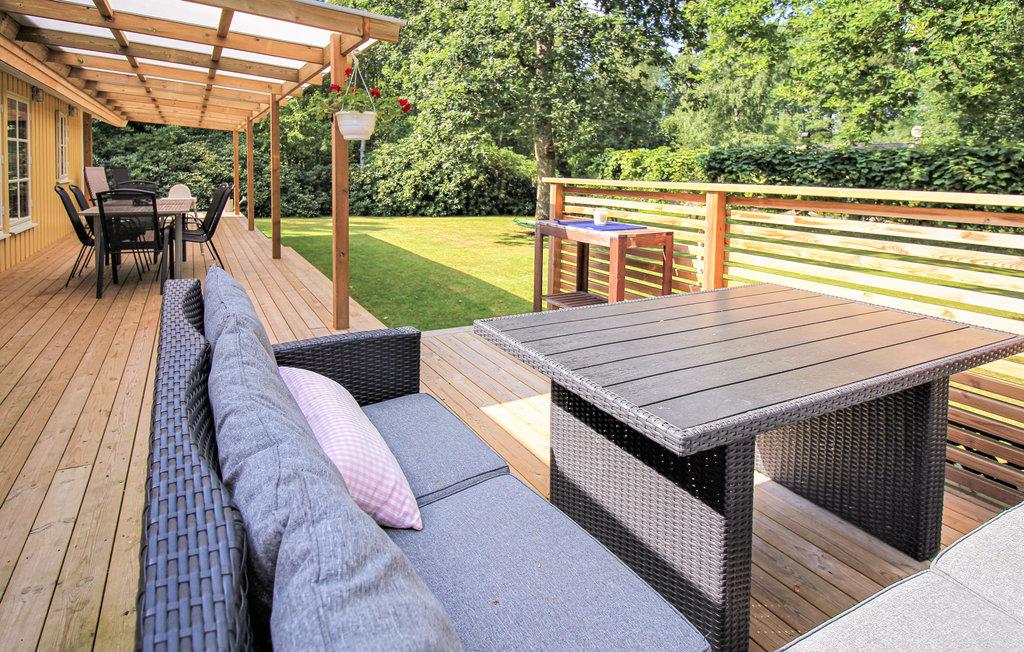 Tilbring en afslappende ferie med jeres store familie i dette hyggelige feriehus nær søen Vemmetropssjörn. Huset emmer af hygge, og I man kommer hurtigt til at føle sig hjemme her. Nyd godt af den store og lyse stue, hvor I kan tilbringe hyggelige timer sammen, lave mad, lege eller bare smække fødderne op. Opholdsstuen er udvidet med en overdækket terrasse og tilbyder et dejligt område til at spise, slappe af og solbade.