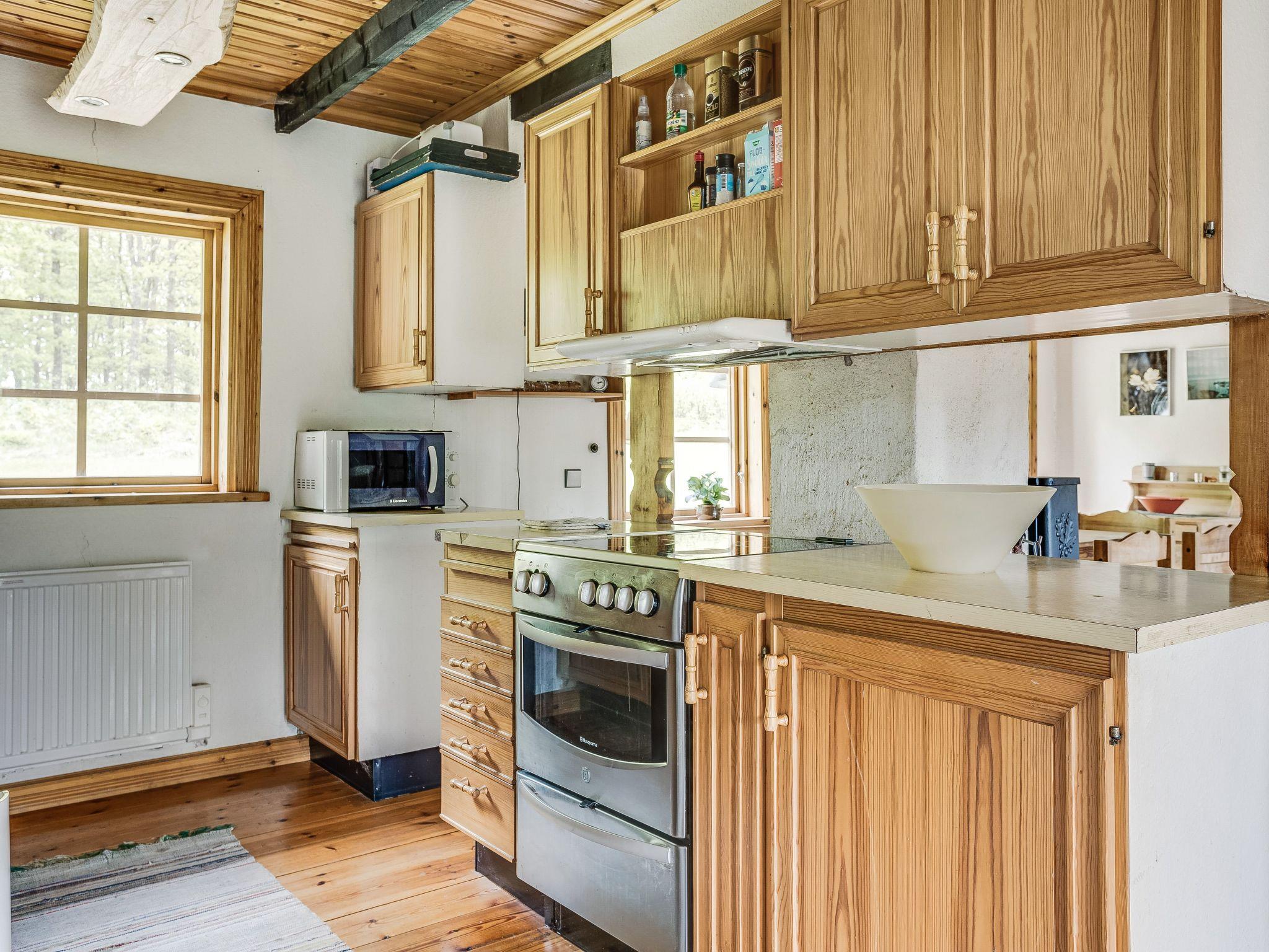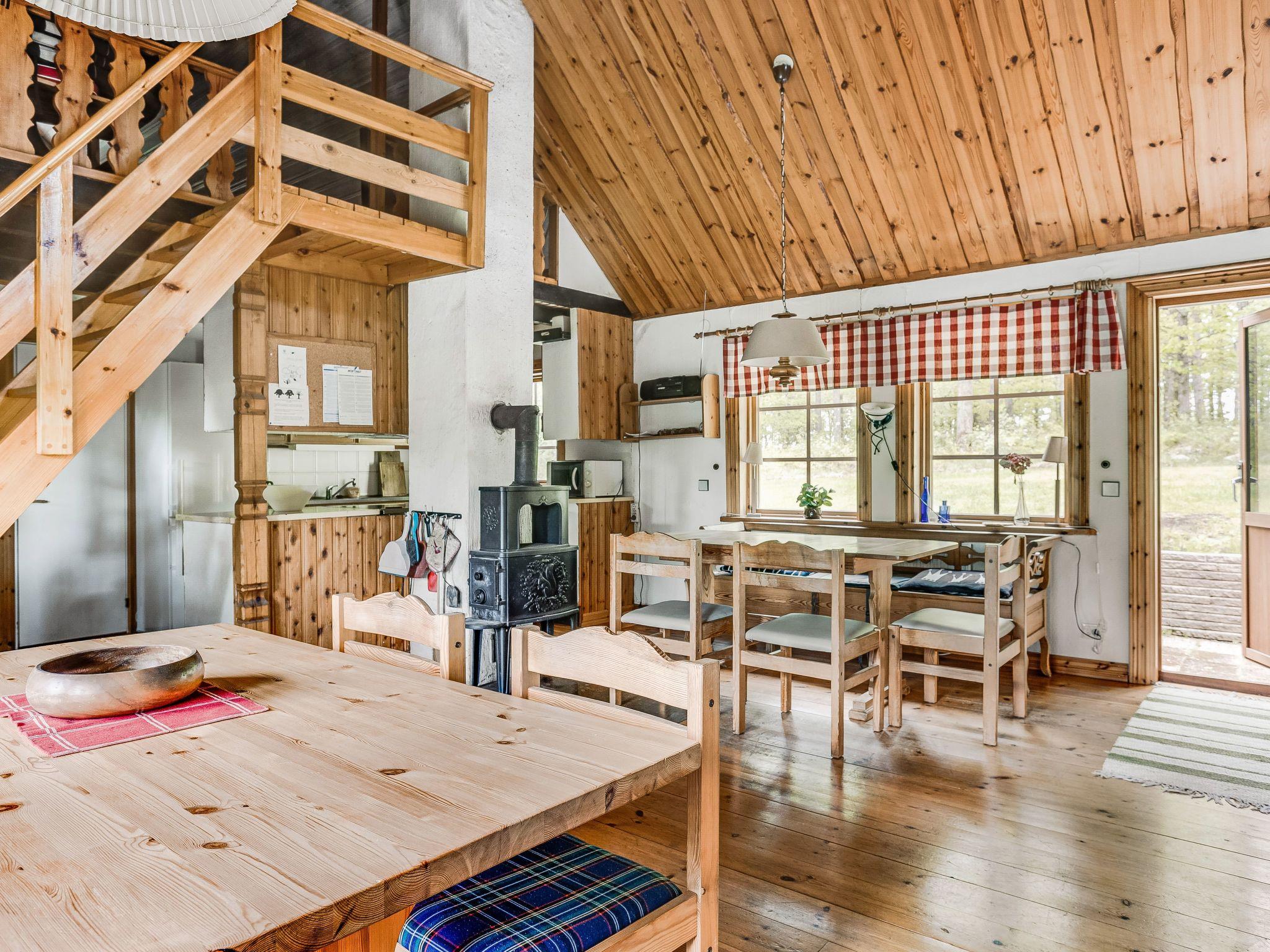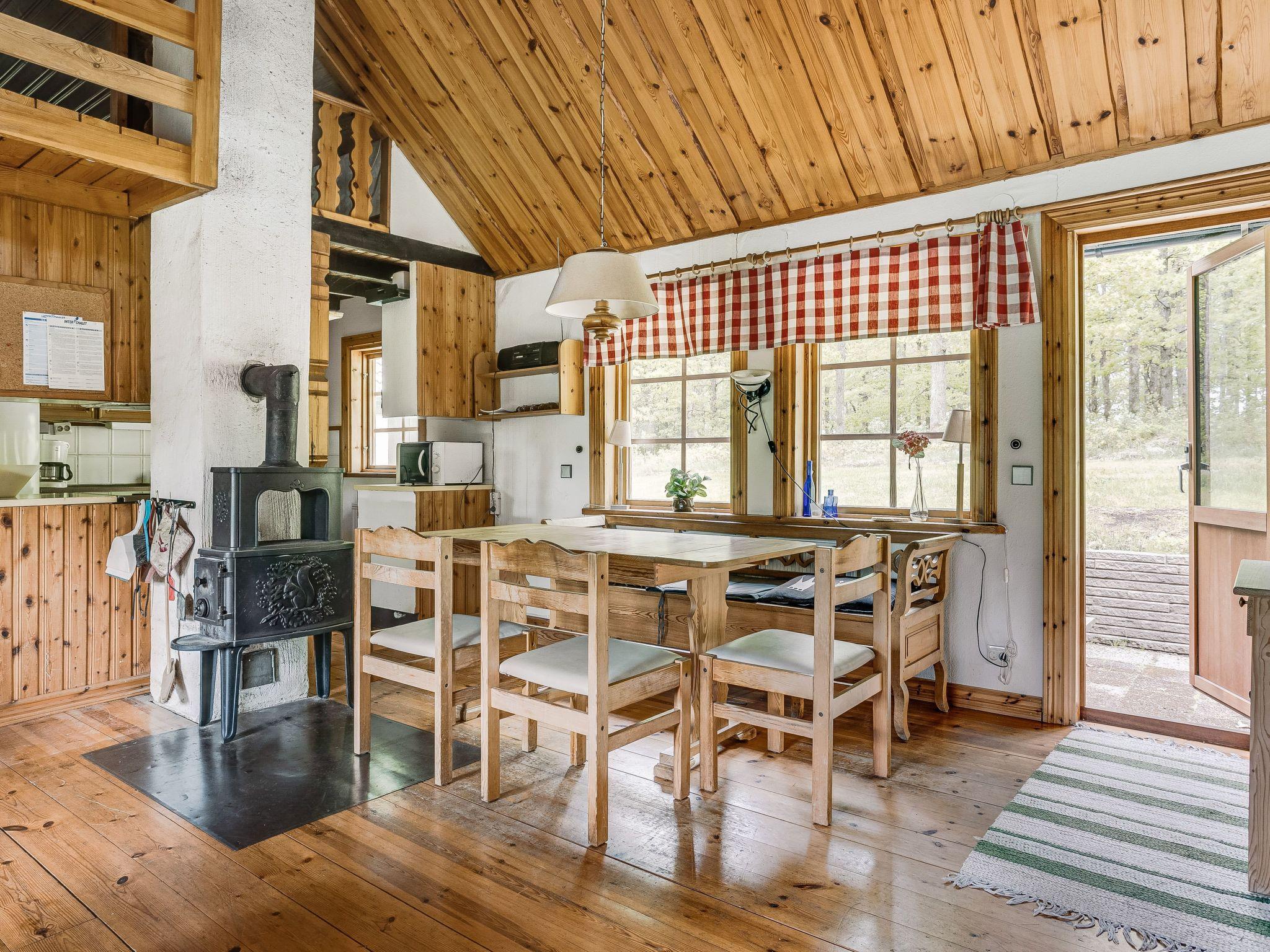 "Ängasjö", 6-room house 110 m2 on 2 levels. Bright, cosy and wooden furniture furnishings: living/dining room with Scandinavian wood stove, dining table and satellite TV. Exit to the garden. 2 rooms, each room with 2 beds. 1 room with 1 double bed. Open kitchen (3 hot plates, oven, toaster, kettle, microwave, freezer, electric coffee machine). Shower/WC. Electric heating. Upper floor: (ladder) open gallery with sloping ceilings with 2 beds. Wooden floors. Terrace furniture, barbecue (portable), sitting area. Facilities: washing machine, iron, children's high chair, baby cot. Please note: non-smoking house. Freezer approx. 60 l. Separate sauna hut (extra). Instead of an enclosed bedroom, some sleeping areas are located in an open-plan area (gallery, alcove, etc.).