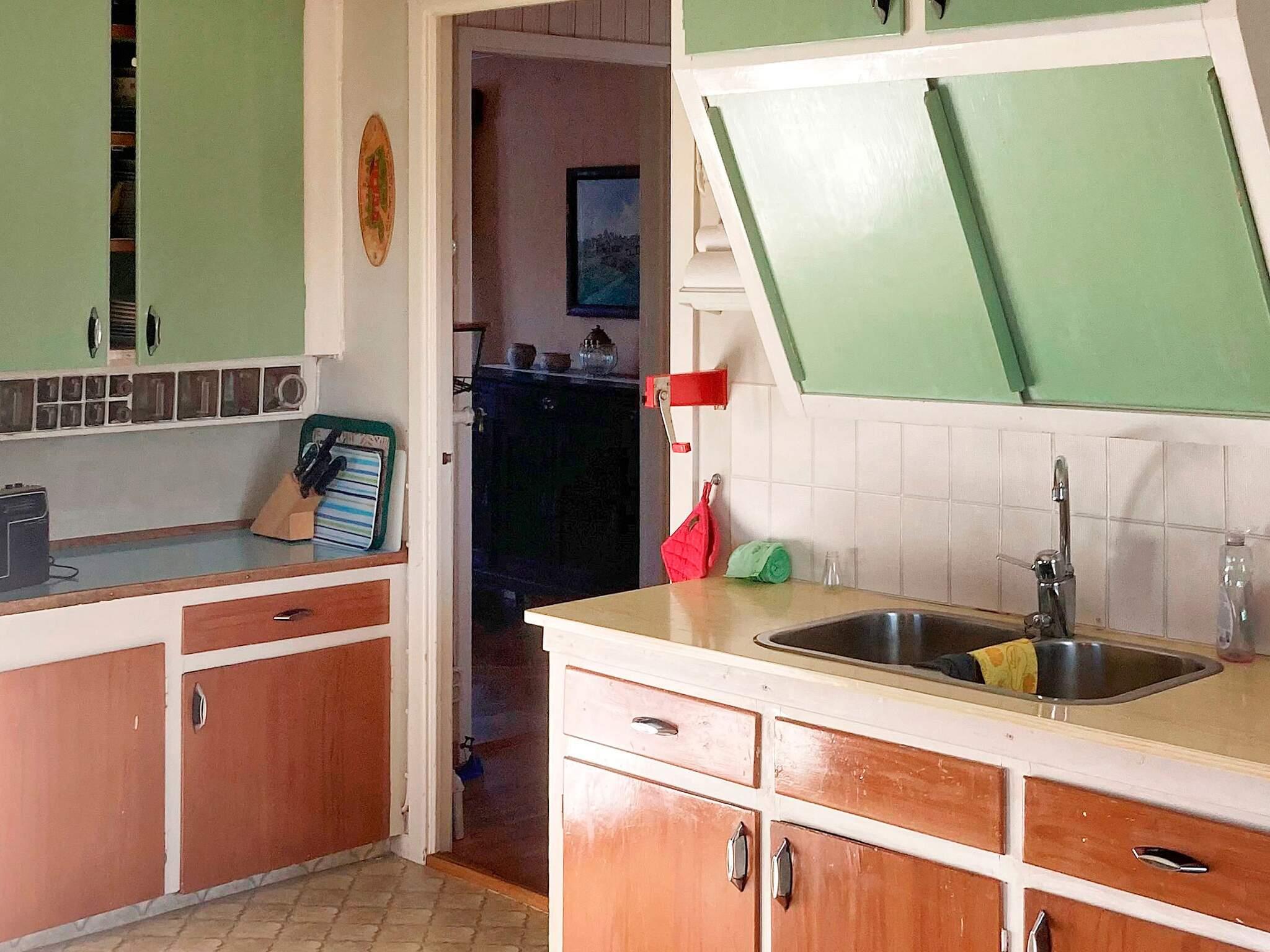Køkken: høj stol, el-komfur, køle-frys, mikroovn, emhætte, kaffemaskine, opvaskemask., vand fra brønd