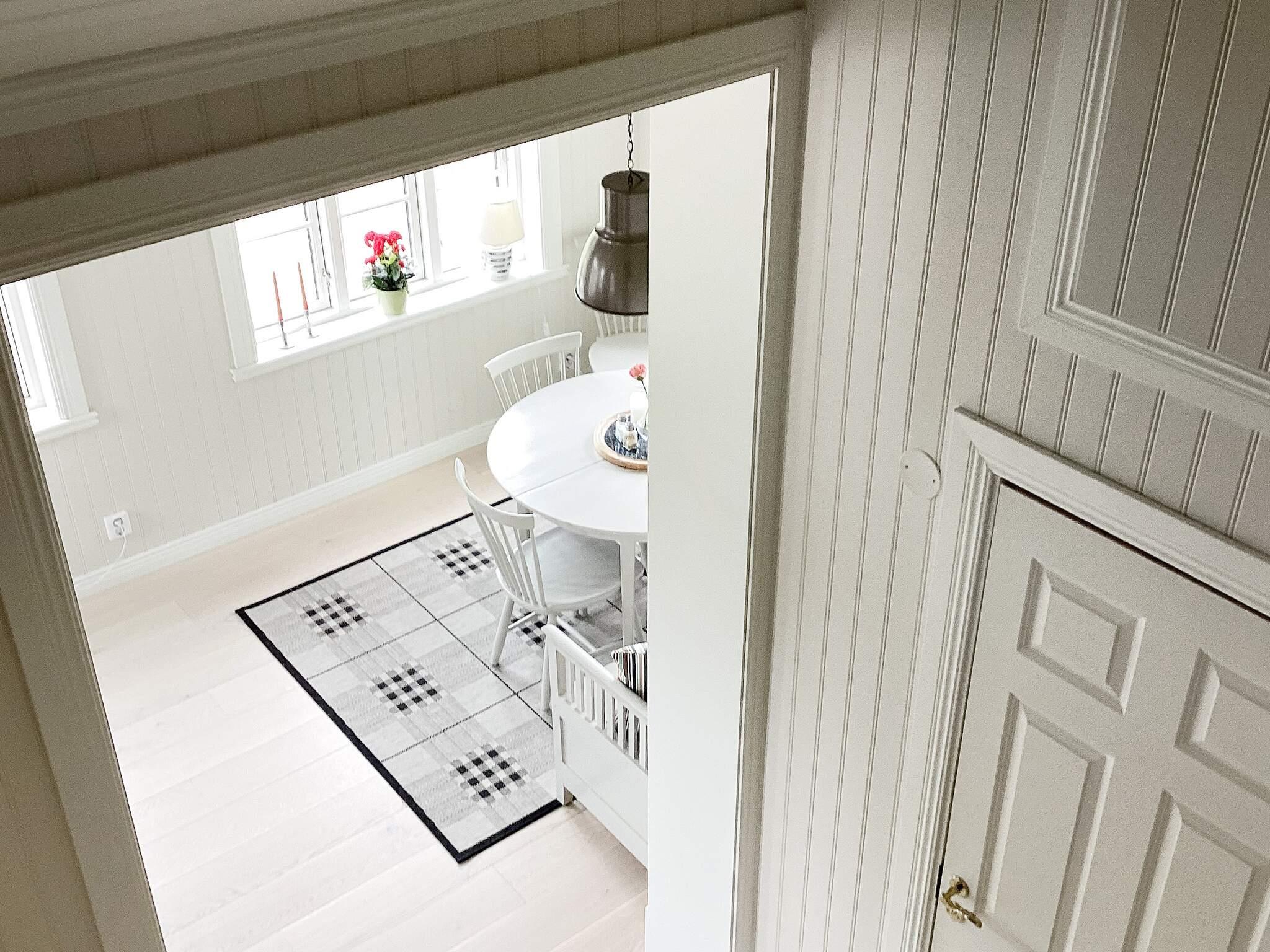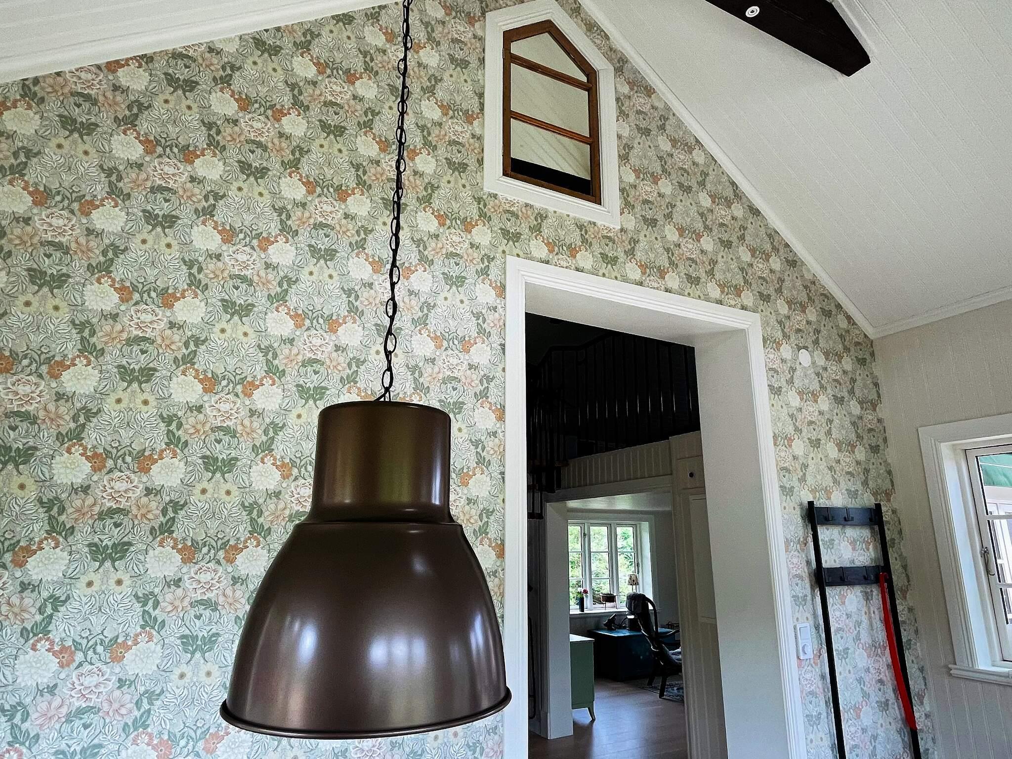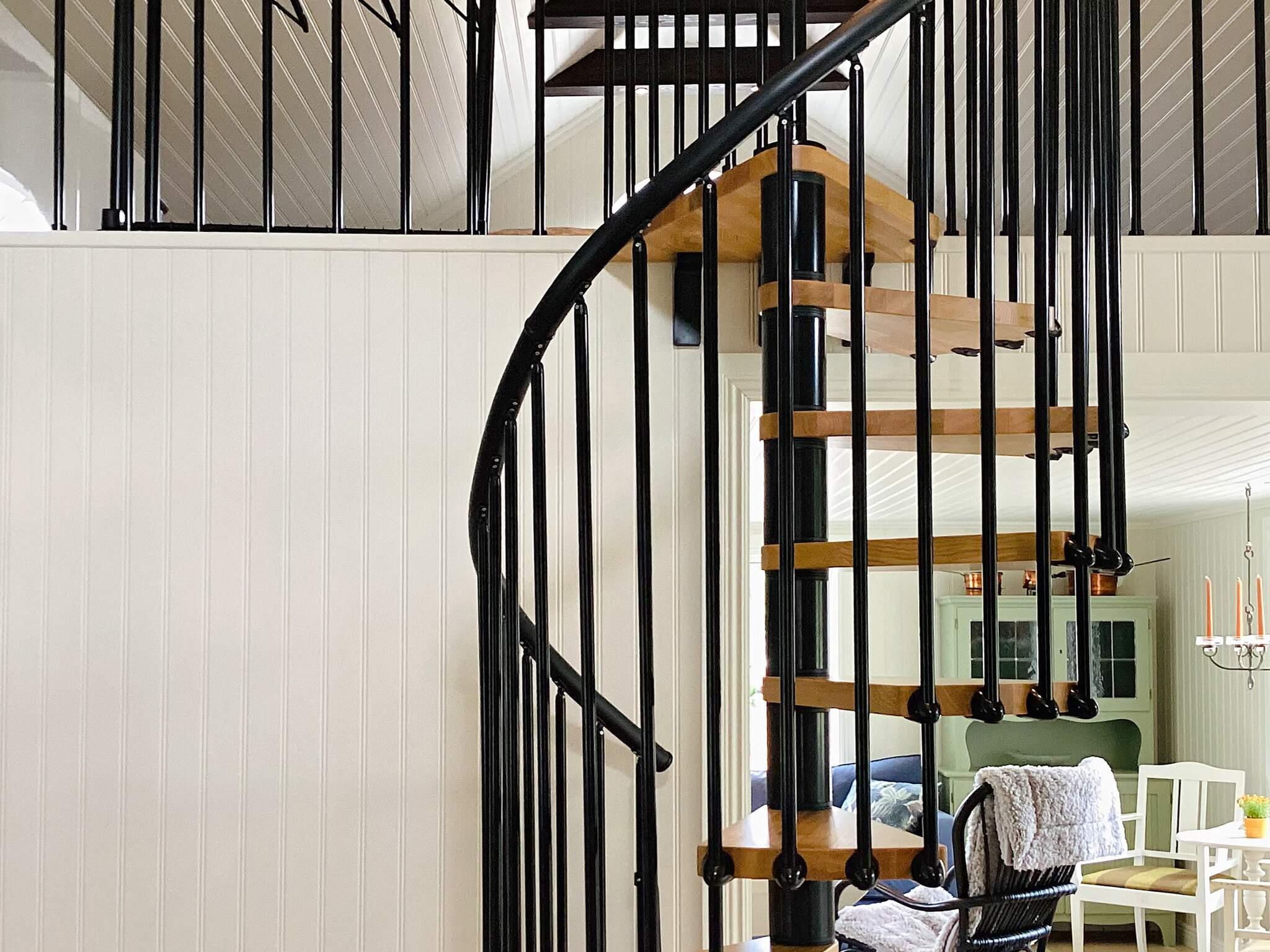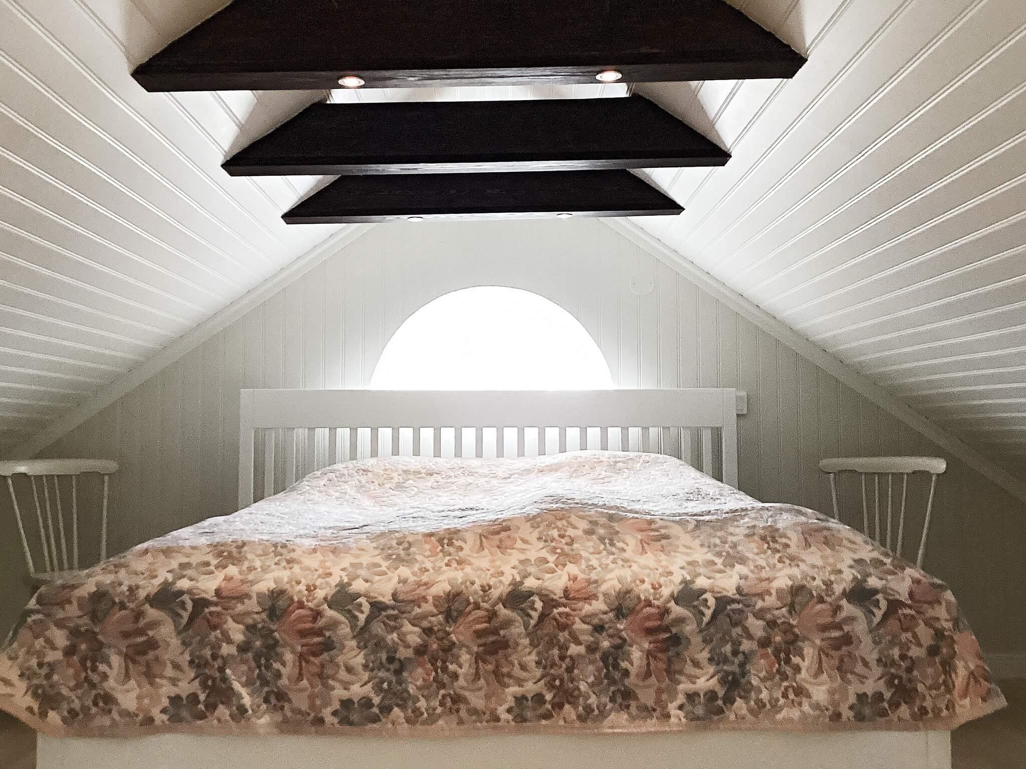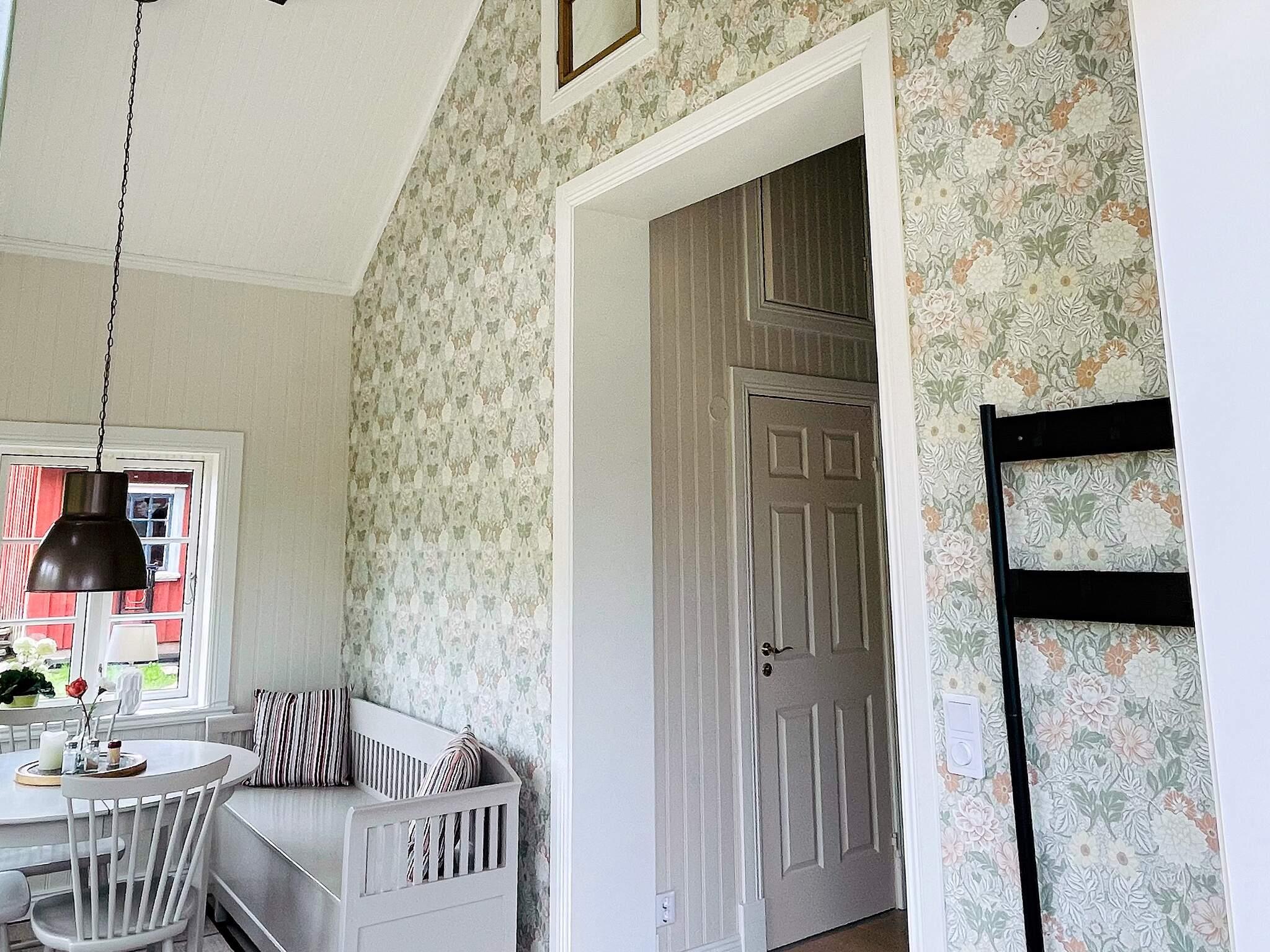 Du välkomnas in i hallen där matrummet öppnar upp sig. Det är högt till tak, upp till nock med snygga bjälkar med spotlight i taket. Till höger är köksdelen där inget saknas. Det är induktionspis, stor kyl och frys. De äldre dörrarna som ursprungligen var till det gamla huset har blivit en snygg detalj till ett maffigt skafferi/skåp. Vardagsrummet är ljust med flera sköna sittplatser för goa kvällar. Tv har ett brett utbud av kanaler och det finns även wifi. Här inne finns fåtöljer och en skön bäddsoffa som blir 160 cm bred. Följ spiraltrappan upp och ni kommer till sovloftet med en stor bred säng på 180 cm. Badrummet är mellan köket och vardagsrummet. Även detta ljust, fint och med duschkabin, handfat och wc.