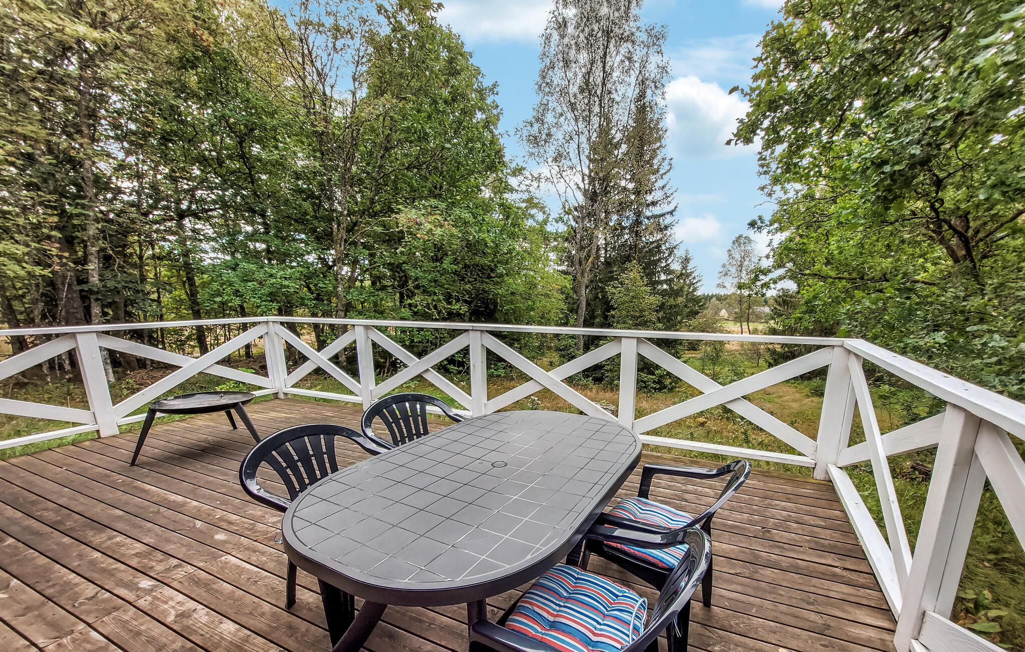 Indlejret i naturen tilbyder jeres charmerende træhus en rummelig terrasse med havemøbler, ideelt til lange aftener i de rolige omgivelser. Nyd skovens stilhed, mens I slapper af på terrassen og betragter naturen. Husets indre er lige så indbydende som de udendørs områder. Den hyggelige opholdsstue er lys og venlig og tilbyder rigelig plads til jeres familie eller venner. Læn jer tilbage i de komfortable lænestole og nyd fælles aftener med en film, en god bog eller sjove selskabsspil. Saml jer ved spisebordet til hyggelige måltider. I kan også gøre det hyggeligt ved brændeovnen og lytte til den afslappende knitren fra ilden.