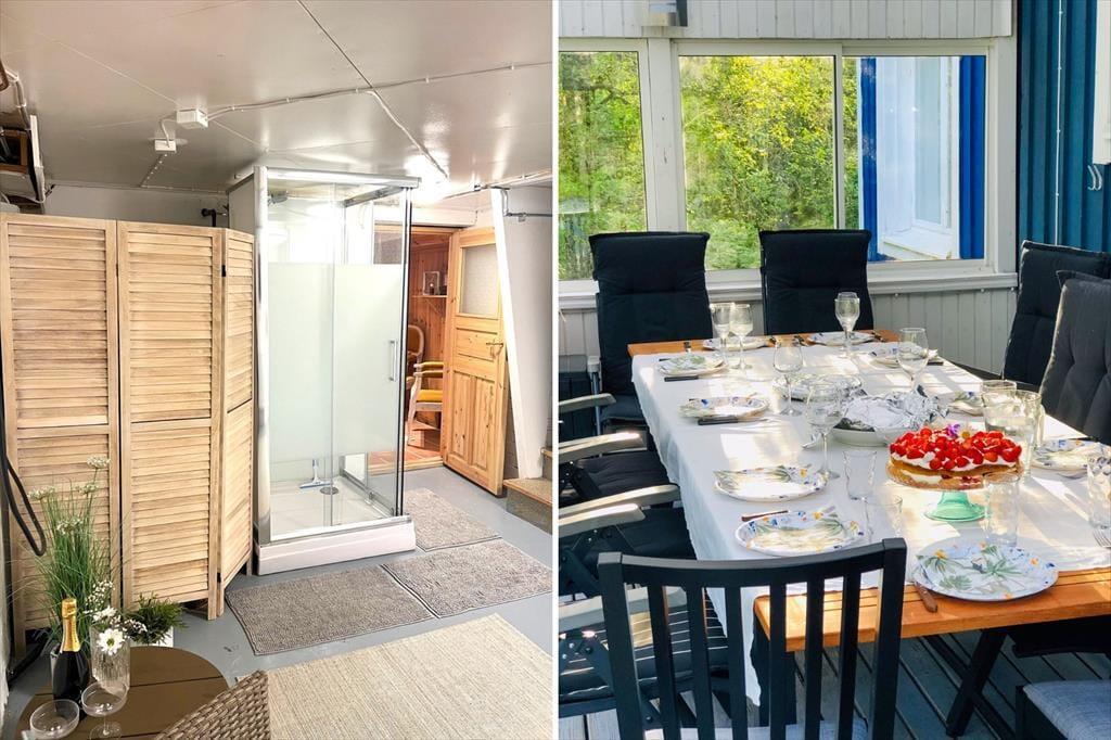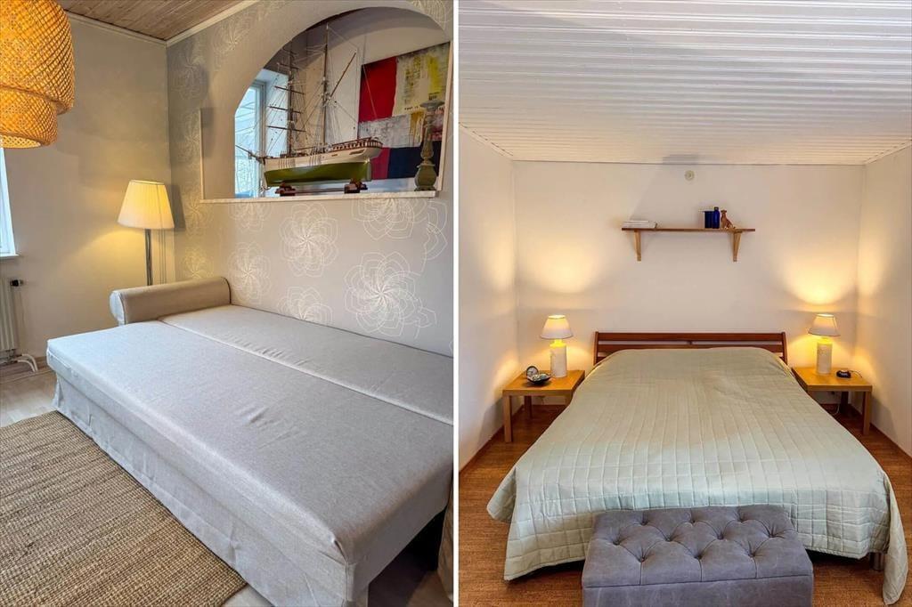 Selv to familier finder god plads i dette ca. 150 m² store sommerhus med plads til op til 8 personer. Huset er opført i 1960, er meget velholdt og løbende renoveret. Det har et åbent køkken med keramisk komfur, separat ovn, køleskab, fryser, mikrobølgeovn, kaffemaskine og brødrister. Den hyggelige stue er udstyret med komfortable polstermøbler, et stort spisebord, fladskærms-TV og CD-afspiller. Herfra kommer du ud i en attraktivt møbleret vinterhave og videre til den åbne terrasse med loungemøbler og terrassevarmer til kølige aftener. De 8 sovepladser er fordelt på tre soveværelser: et med dobbeltseng, et med to enkeltsenge og et med både en dobbeltseng og to enkeltsenge. Det moderne flisebadeværelse har bruseniche, toilet og håndvask. I kælderen findes et vaskerum med vaskemaskine og husets egen sauna. Gæsterne har desuden adgang til Wi-Fi og en kulgrill.