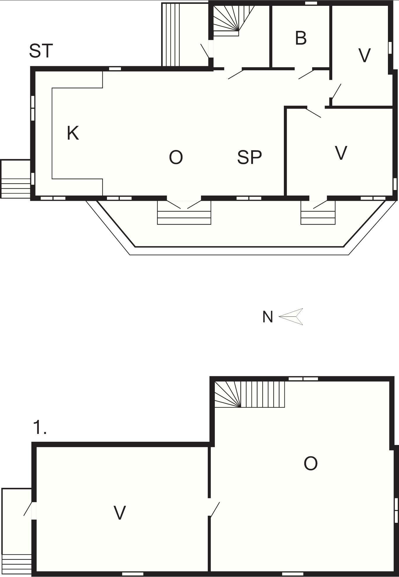 Ovanvåningen, som är en vindsvåning, har snedtak och lite lägre takhöjd men är stor och rymlig. Här finns ett vardagsrum till, tex om man vill dela upp sällskapet i film mys för barnen och ett glas vin och samtal för de vuxna på nederplan. Här finns även det tredje sovrummet med en 140 säng för 1-2 personer samt två enkelsängar. Här finns gott om plats för alla om man reser 8 personer, och bra möjligheter till att sova lite mer var för sig om man skulle resa två sällskap tillsammans.