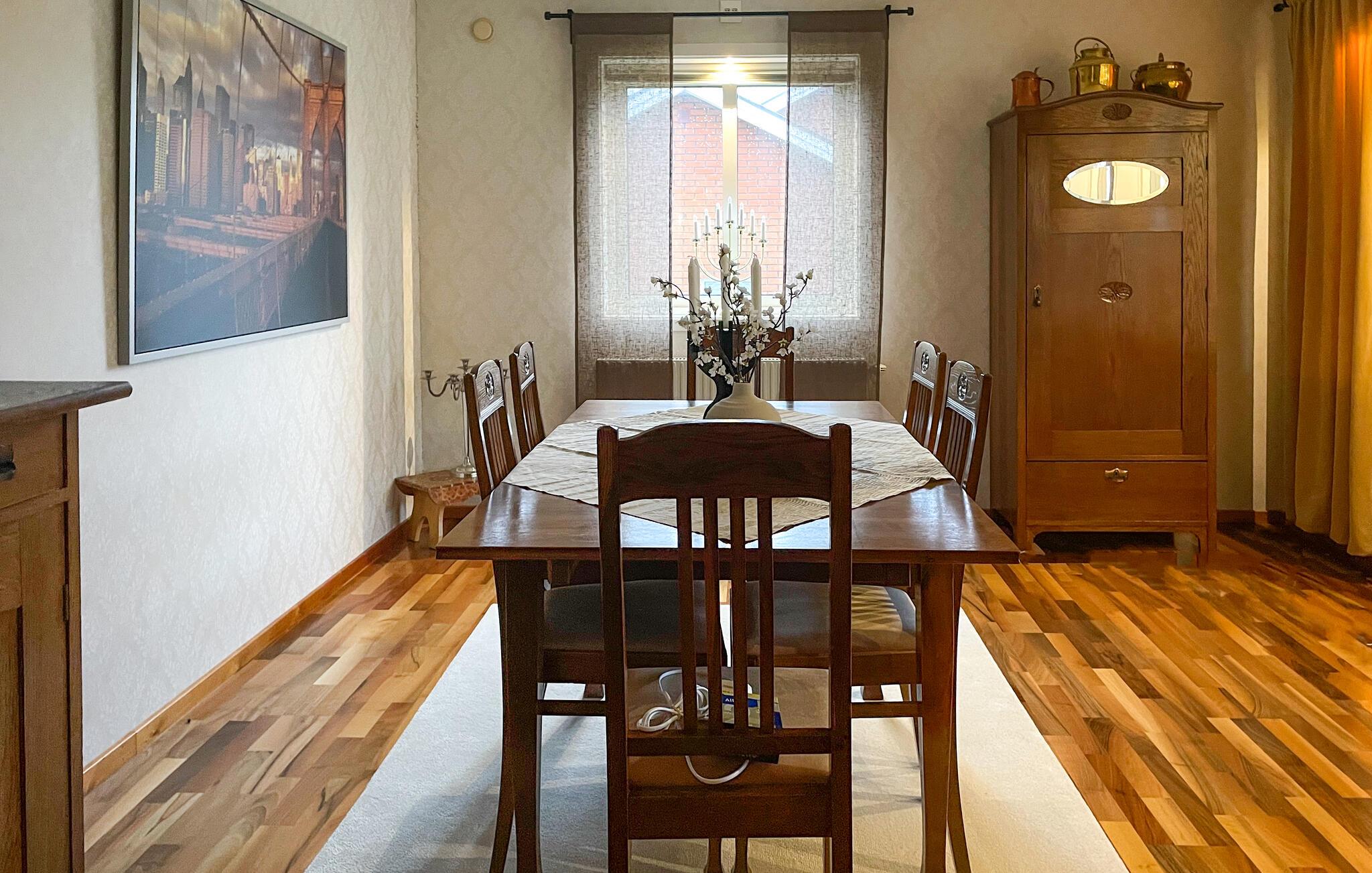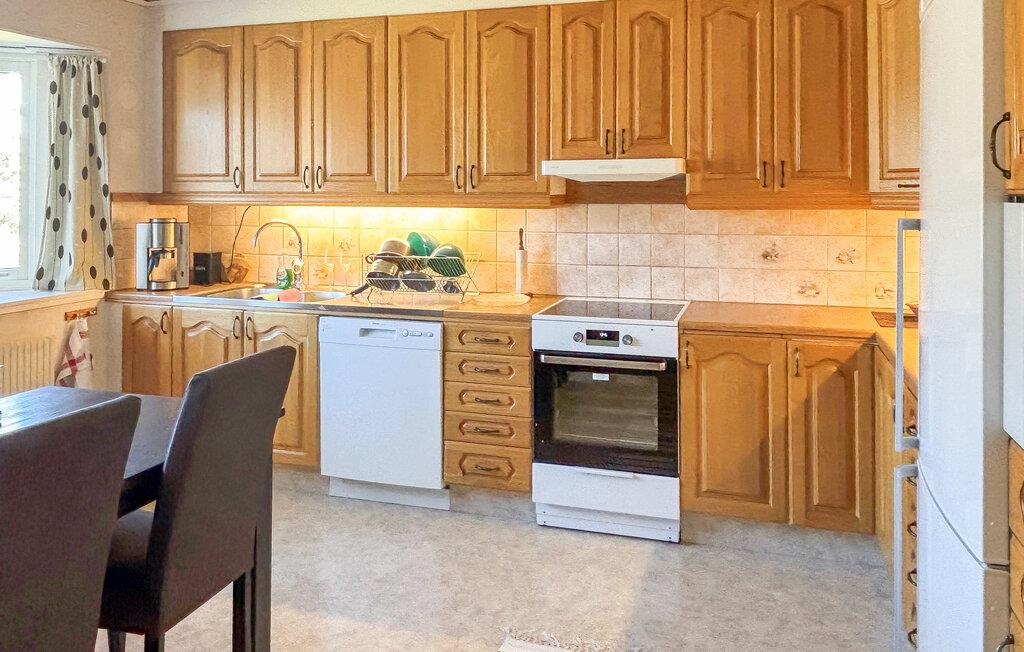 Nyd jeres næste ferie i dette hyggelige feriehus, det ideelle tilflugtssted for familier og par, der leder efter en afslappende pause fra hverdagen midt i et idyllisk landskab. Den smagfulde indretning er noget særligt med varme trætoner og kærlig dekoration. Den rummelige opholdsstue med sit komfortable sofaområde og stort spisebord byder på masser af plads til tid sammen. I kan tilberede jeres lækre retter i det åbne køkken og derefter nyde dem ved det tilstødende spisebord. udestuen er et højdepunkt i huset, ideel til hyggelige aftener i al slags vejr.