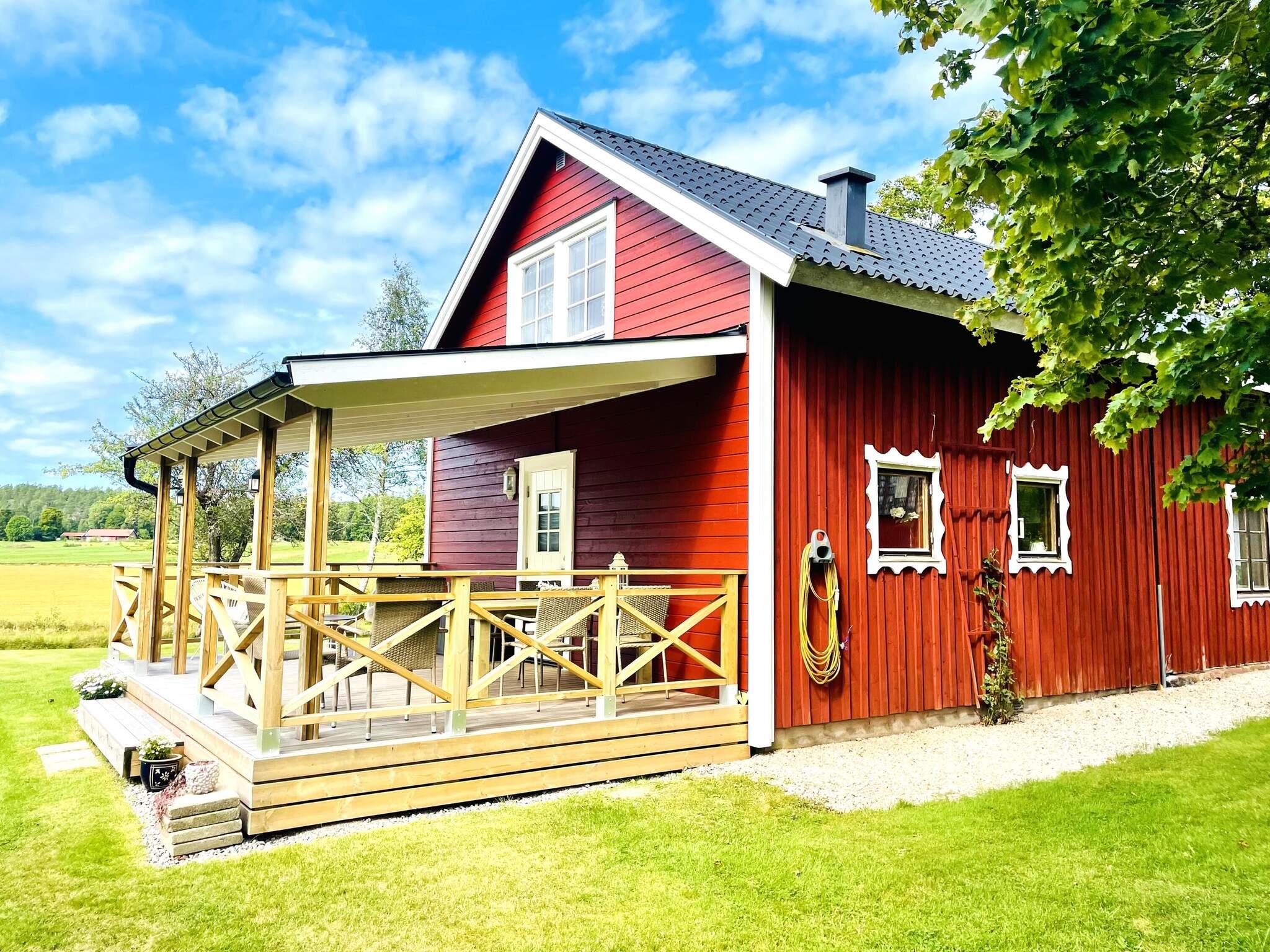 Altanen bjuder på ett matbord, stolar och en kolgrill – den självklara platsen för sommarens middagar och långa kvällar. Här kan du njuta av morgonkaffet medan du blickar ut över ängarna och kanske får du sällskap av rådjur, räv eller till och med skogens konung – älgen! Föredrar du skuggan, finns en mysig terrass under tak på framsidan. På övervåningen väntar två rymliga sovrum. Det ena har en bekväm dubbelsäng (180 cm), det andra har flera bäddar: två enkelsängar (120 cm & 90 cm) samt en bäddsoffa som enkelt blir en dubbelsäng (160 cm). Här finns även ett allrum med soffgrupp och TV, samt ytterligare ett badrum med WC och tvättställ .