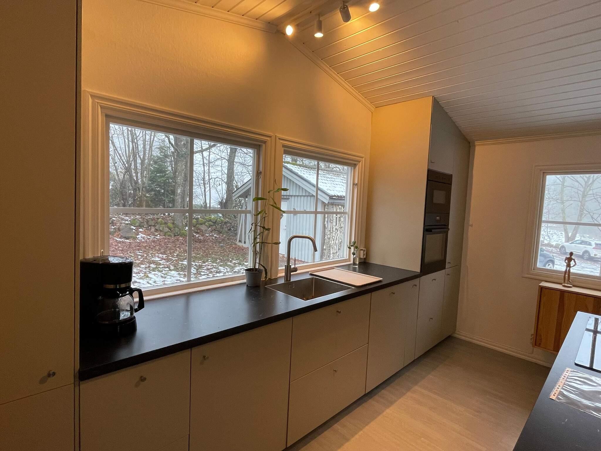 Husets hjärta är vardagsrummet som har panoramautsikt över den härliga trädgården med dammen nedanför. Altandörr ut på det rymliga trädäcket som har stor yta med tak över matplats. Köket är fullutrustat för självhushåll och har köksö att laga mat vid. I köket kan man även samlas för gemensamma stunder i avkopplande fåtöljer eller i en bäddsoffa för två och njuta av brasan som ger en hög mysfaktor och skön värme, ved ingår i begränsad mängd. Ett av sovrummen har 2 enkelsängar och det andra har en dubbelsäng med egen utgång till terrassen. Mycket fräscht badrummet med dusch. Annexet har två ingångar varav den ena leder in i rum med dubbelsäng och bäddsoffa för en person. Här finns också badrum med dusch som man också når från två håll. Tvättstugan med tvättmaskin, torktumlare och kylskåp har även en egen ingång utifrån för bästa tillgänglighet av alla under vistelsen.