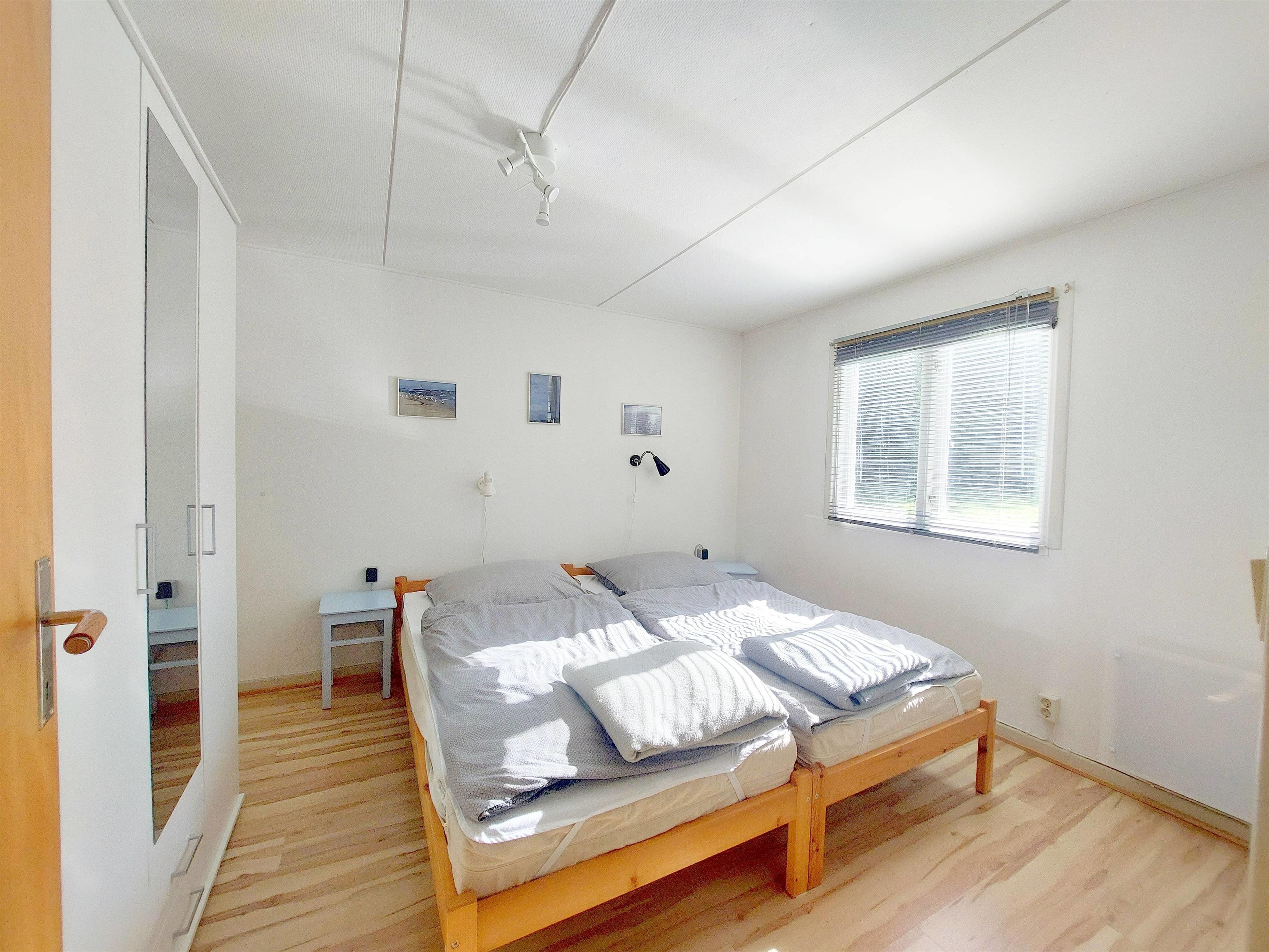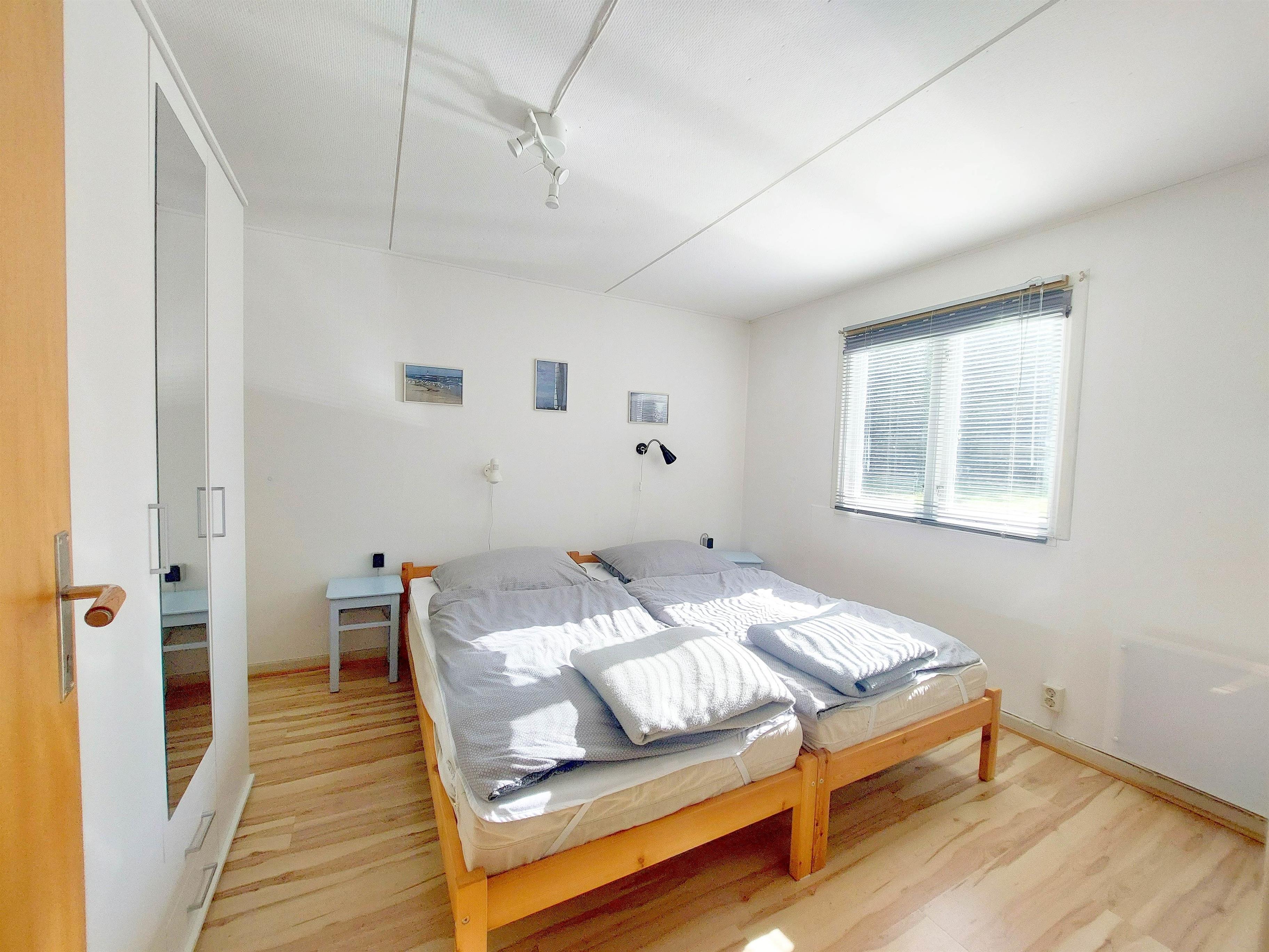 Das Schlafzimmer Nr. 1 enthält 2 Einzelbetten (90 x 200 cm) mit jeweils 1 Matratze, 1 Matratzenschoner, 1 Bettdecke (135 x 200 cm) und 1 Kissen (80 x 80 cm). Die Einzelbetten können nebeneinander oder getrennt voneinander gestellt werden. Außerdem sind zwei Kleiderschränke vorhanden (einer davon in der Wand eingelassen - dort befinden sich auch 2 Sonnenliegen für den Garten oder die Terrasse). Laminat-Boden. Deckenleuchte und 2 Wand-Lese-Lampen. 1 Fenster mit Jalousie und Verdunkelungsstoff und 1 Fliegengitter. Elektrische Heizung. 1 Spiegel am Schrank. 1 Föhn. Einige Bücher sind vorhanden, die während der Aufenthaltsdauer gerne gelesen werden können.