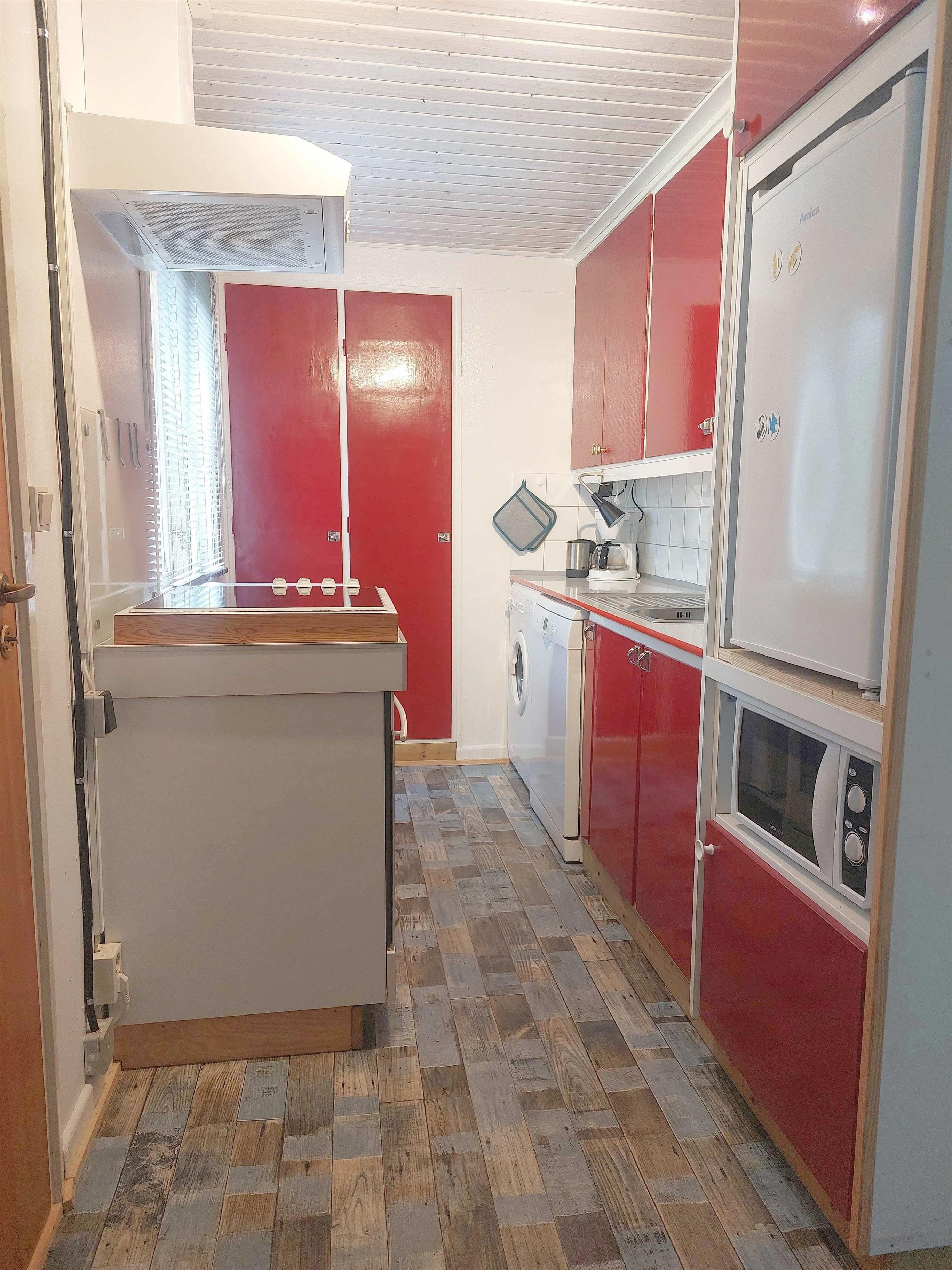 Die Küche bietet 1 Herd mit 4 Kochfeldern und 1 Backofen (beide elektrisch). 1 Dunstabzugshaube über dem Herd. 1 Kühlschrank und 1 kleinen Gefrierschrank. Mikrowelle. Waschmaschine. Spülmaschine. Zur Info: Waschmaschine, Spülmaschine und Mikrowelle können nicht gleichzeitig, sondern nur separat, betrieben werden. Pulver-Kaffeemaschine (Filter Gr. 4). Dolce-Gusto-Kapsel-Kaffeemaschine. Wasserkocher. Handmixer. Toaster. Töpfe, Pfannen, Besteck, Geschirr (Teller etc.), Gläser, Schüsseln, usw., sind vorhanden. 2 Arbeitsplatten. 1 Spülbecken mit 1 schwenkbaren Wasserhahn (heißes und kaltes Wasser) mit Tropffläche und 1 Geschirr-/Abtropfkorb. 1 Deckenleuchte, 1 Arbeitsplattenleuchte. Elektrische Heizung. 1 Fenster mit Jalousie und 1 Fliegengitter. PVC-Boden. Mülleimer. Staubsauger. Besen. Schaufel und Kehrbesen. Bodenwischer und Eimer. Reinigungsmittel. Spülschwamm/-tuch. Spülmittel. Waschmittel (meist Pulver), Spülmaschinen-Tabs.