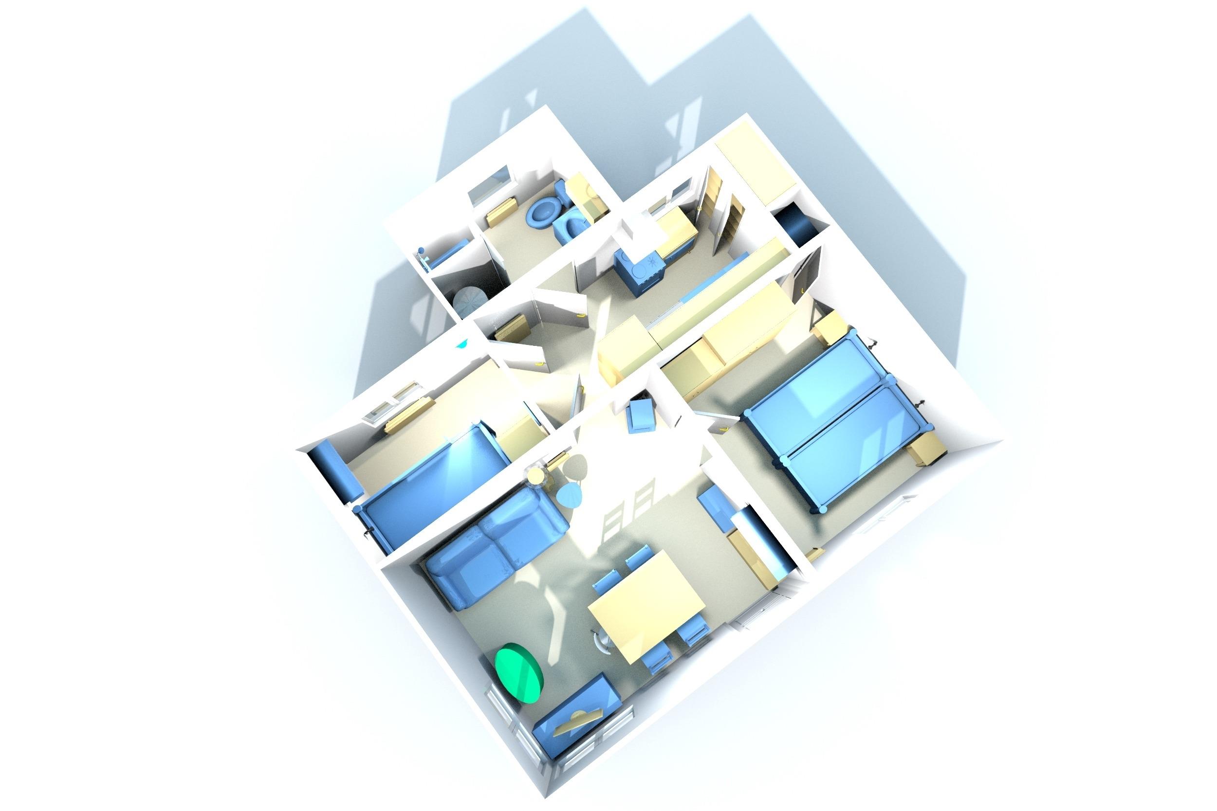 Es verfügt über 5 Zimmer: Ess- und Wohnzimmer, Schlafzimmer 1 und 2, Küche, Badezimmer.