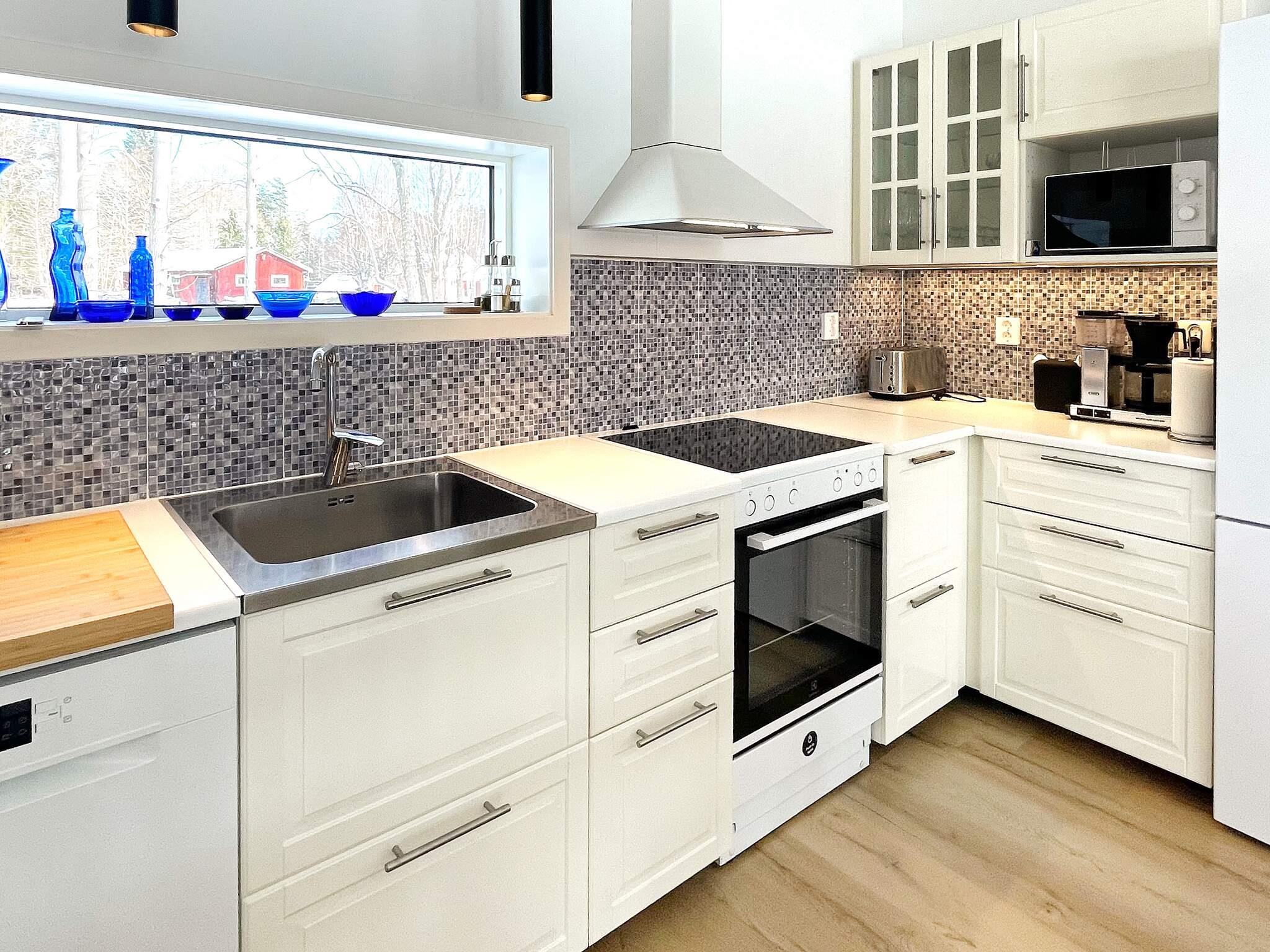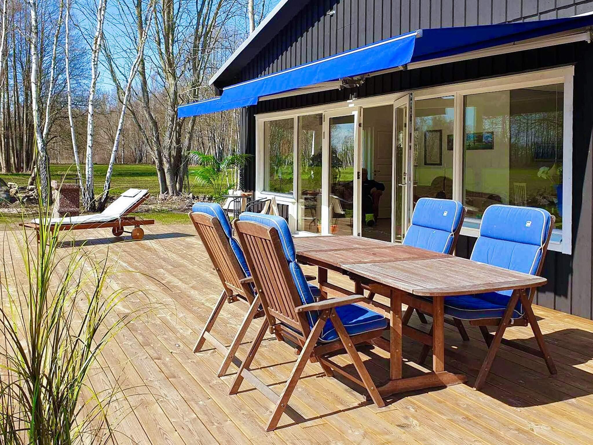 Huset har ett öppet sällskapsrum med kök, matplats och vardagsrumsdel samt stora fönsterpartier ut mot altanen. Ni har två sovrum, det ena med en dubbelsäng, det andra med en enkelsäng och en familjevåningssäng där nedre bädden är 120 cm. Det finns även en vikbar extrabädd att tillgå om ni önskar. Kontakta servicekontoret i så fall.