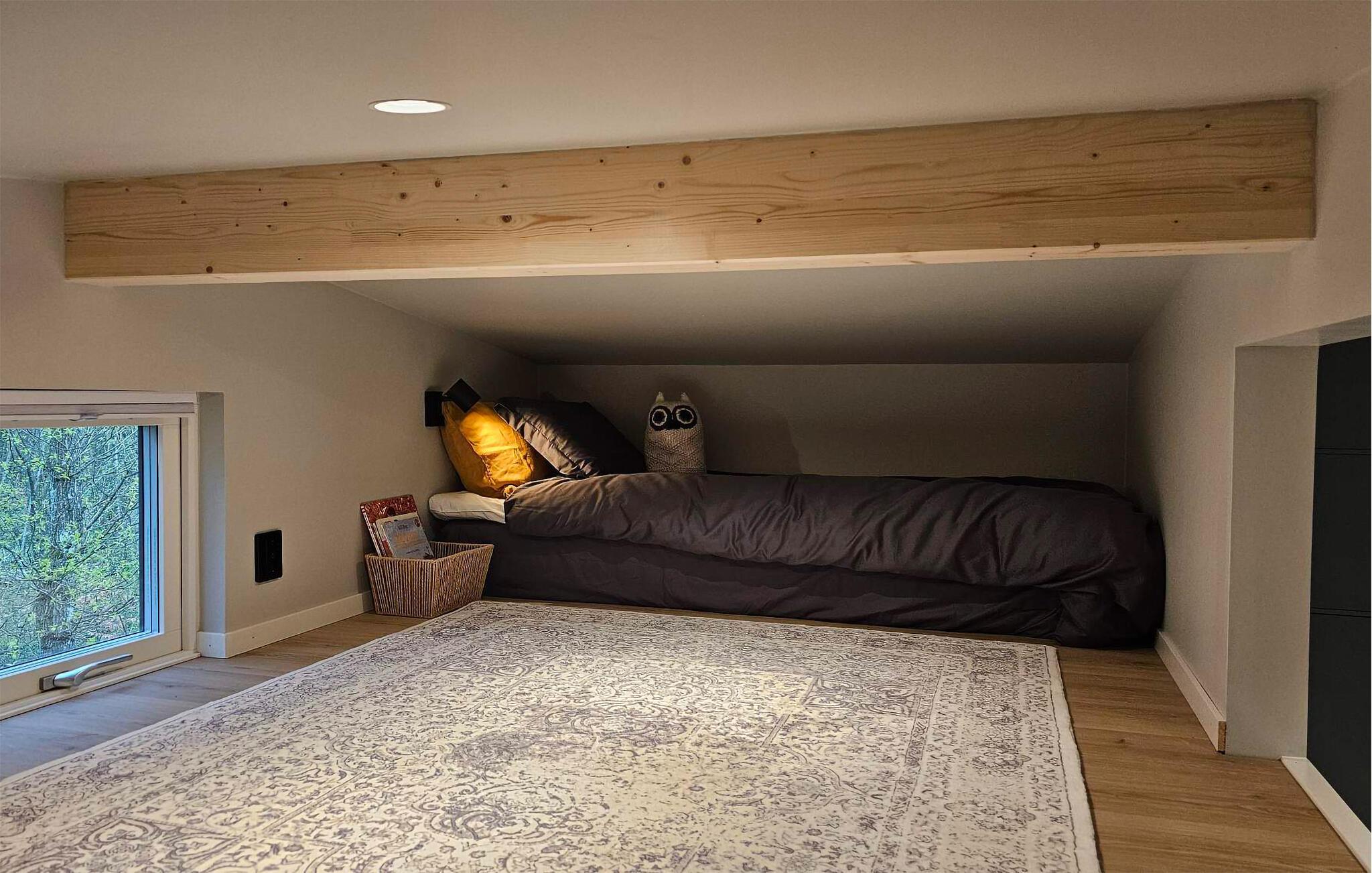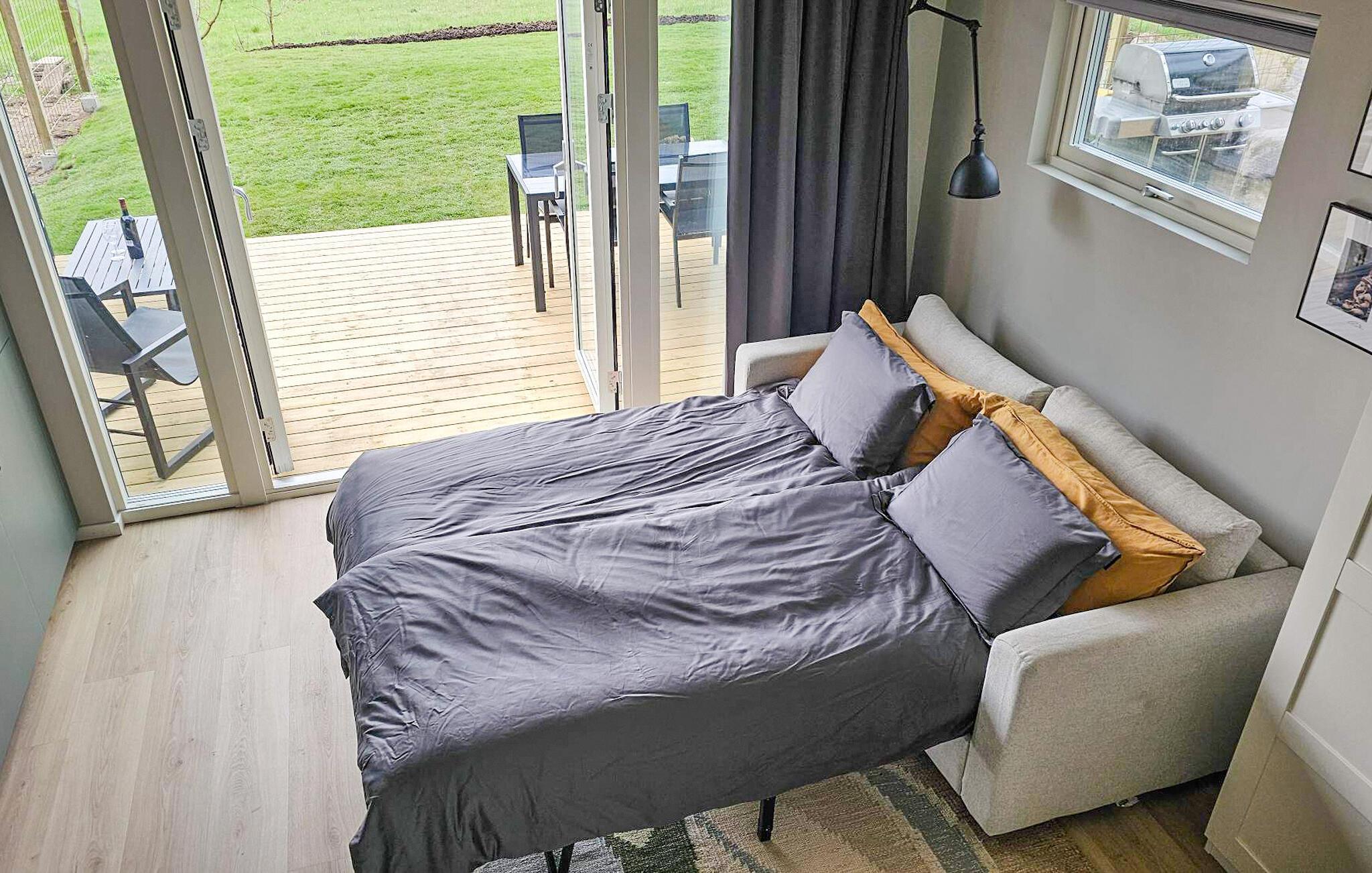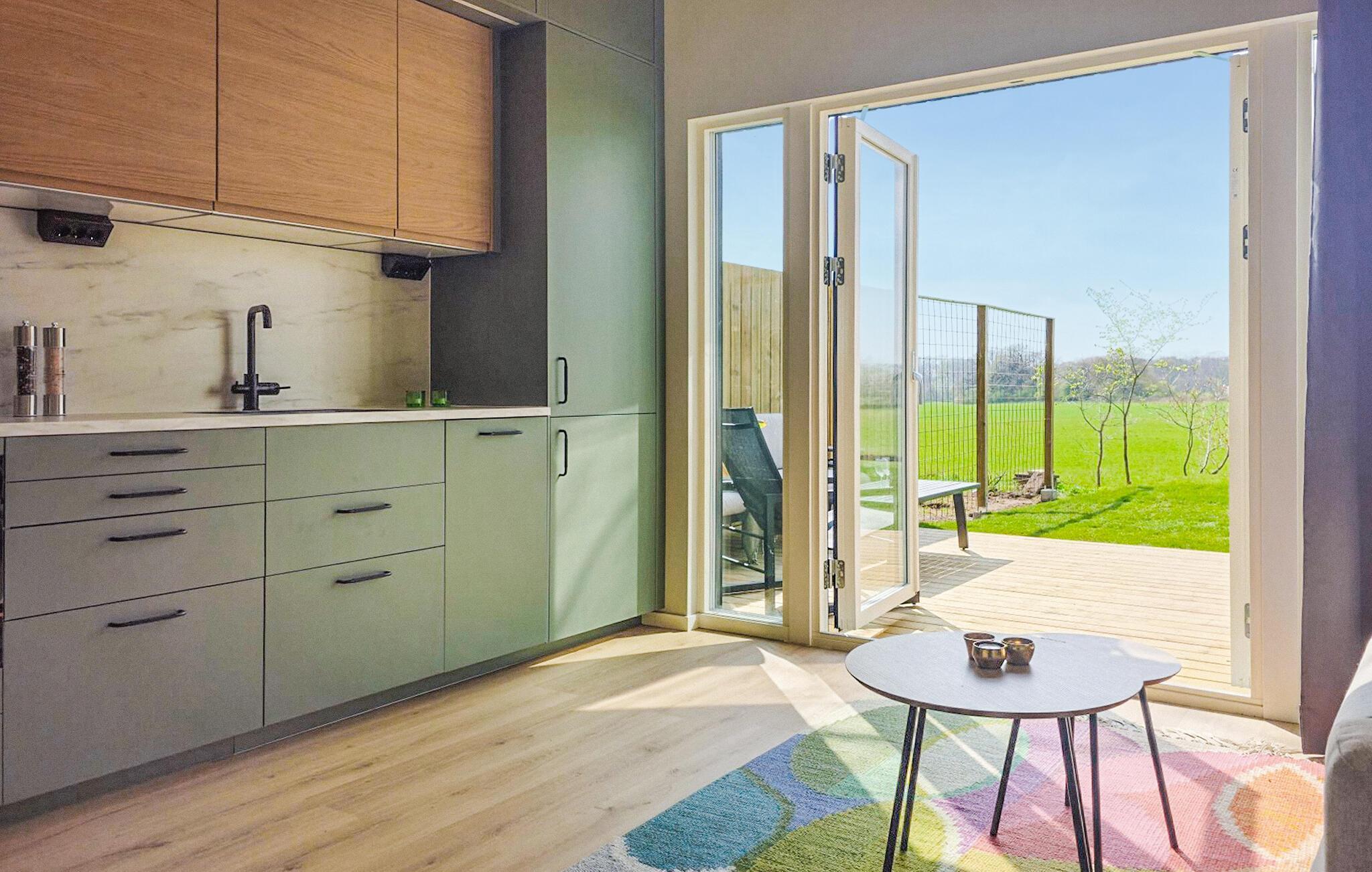 Dette stilfulde minihus er det ideelle sted at finde ro, være aktiv udendørs og nyde to af de smukkeste naturreservater i Skåne i fulde drag. Her har I fri udsigt mod vest, hvor solen går ned over åbne marker, og rådyr ofte passerer lige forbi vinduet. Slap af i den lyse opholdsstue med en hyggelig sofa og tv. Lav mad i det moderne udstyrede køkken med stilfulde fronter, og nyd jeres måltider ved spisebordet eller direkte ude i det grønne. Sov godt i den komfortable dobbeltseng, eller brug den hemsen, som især er populær blandt børn.