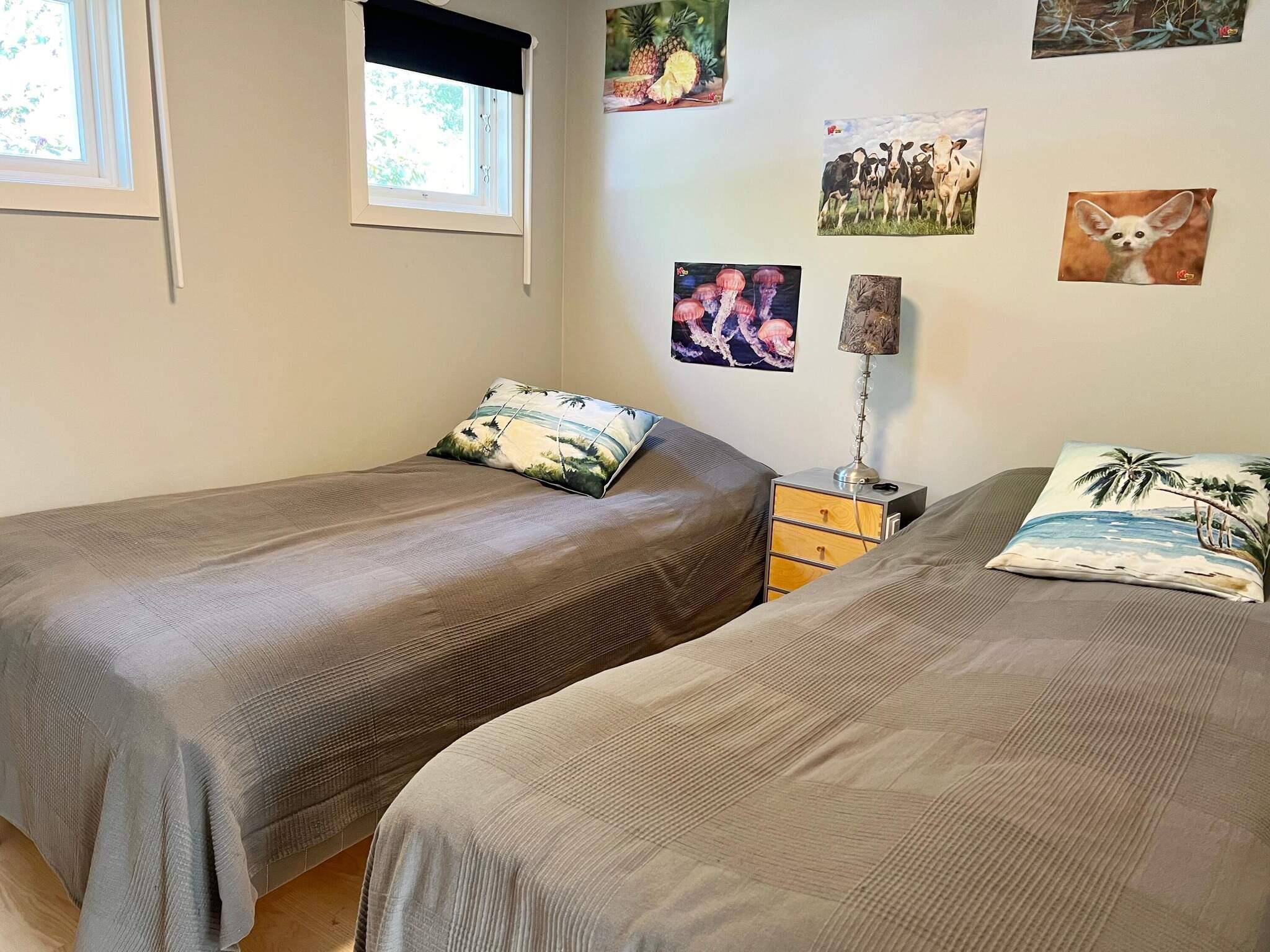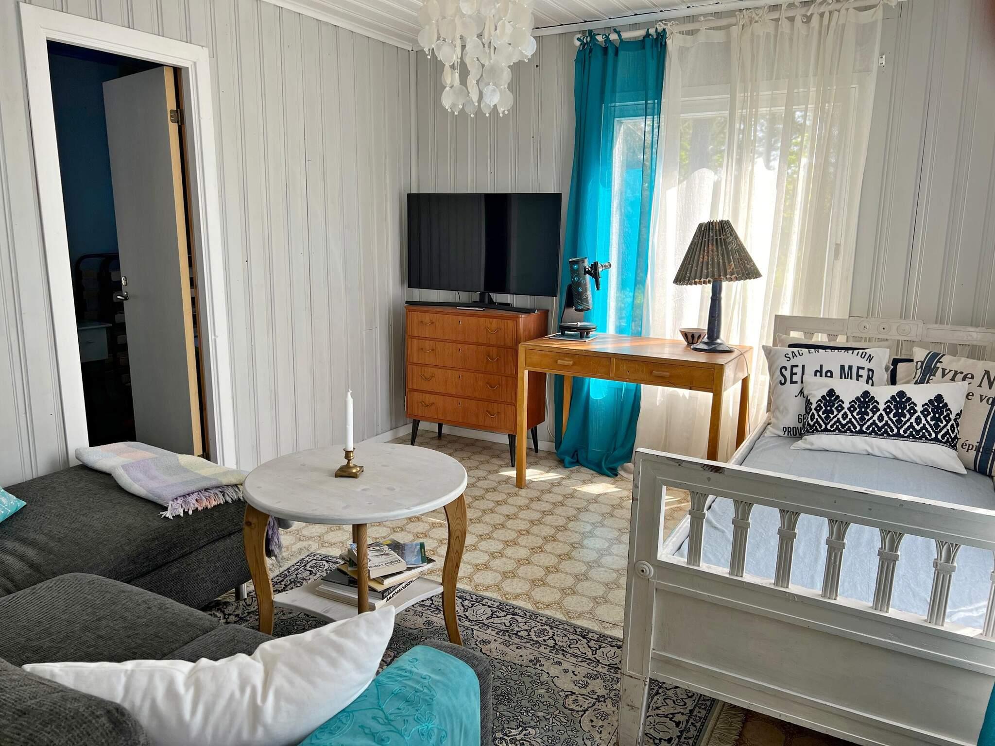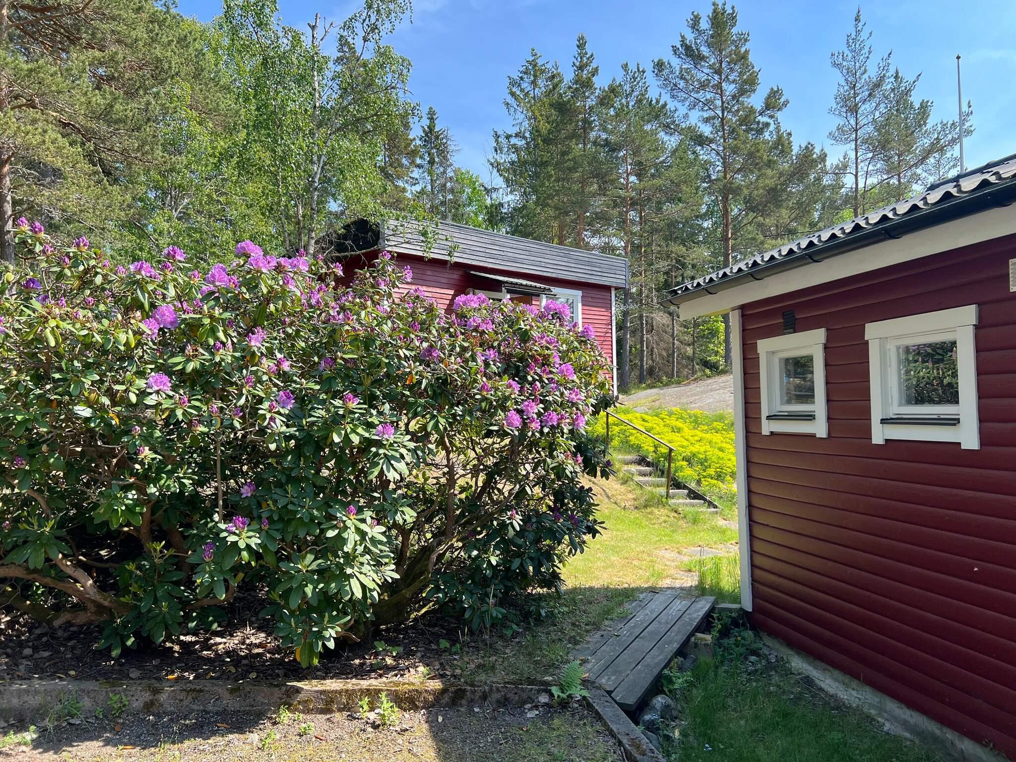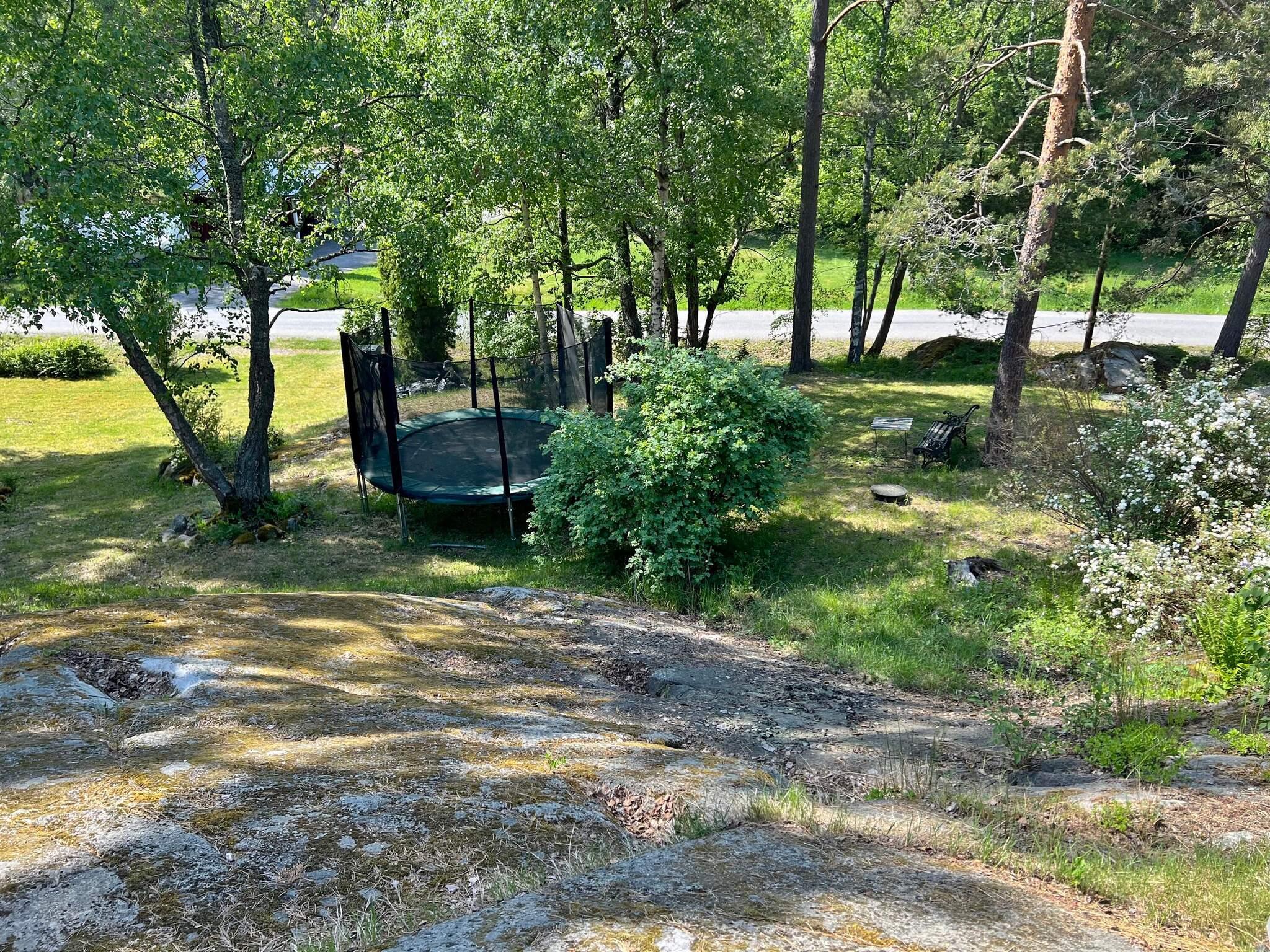 Lite högre upp på fastigheten ligger gäststugan som har ett dubbelrum och ett rum med enkelsäng. Denna stuga har inget badrum, men det finns en enkel toalett för nattbruk. Fastigheten är en härlig skogstomt med kullar, träd och buskar. Längre ner på tomten finns en liten gräsmatta och en studsmatta.