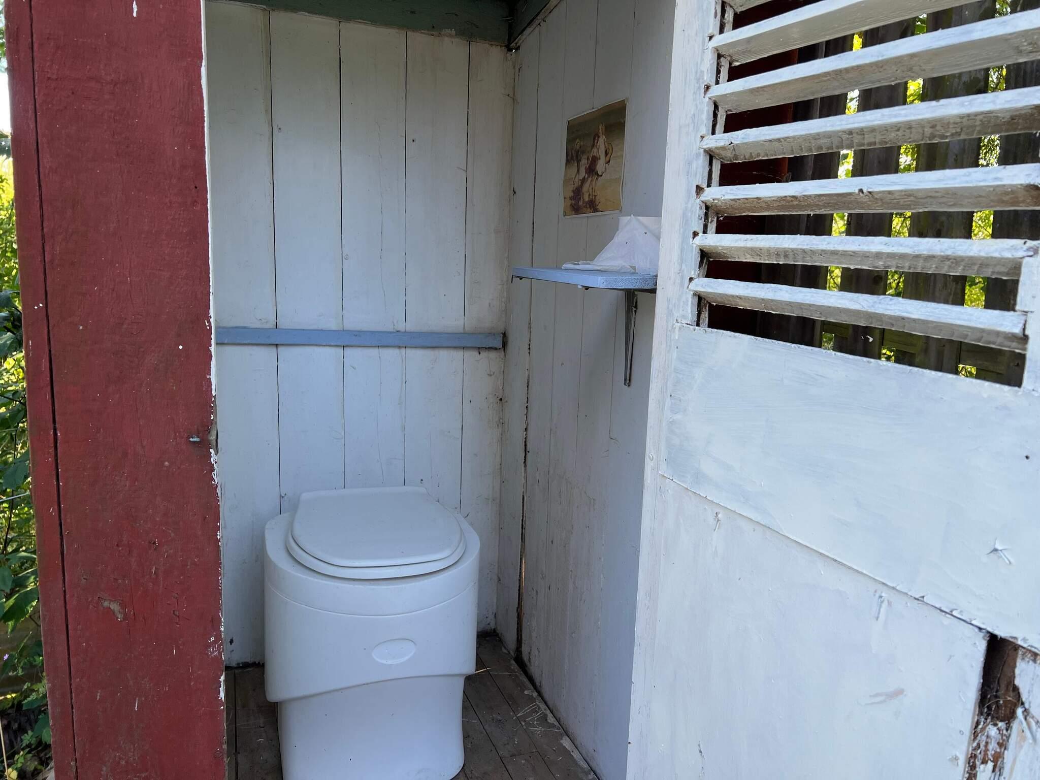Dusch och toalett är ute, så härligt att duscha ute på sommaren. Toaletten är en torrtoa i ett lite hus bredvid. Huset har en stor altan; halva med tak och halva utan tak, trevligt att sitta ute oavsett väder. En stor grönskande tomt med utemöbler och grill för trevliga kvällar. Huset ligger högt och delvis insynsskyddat.
