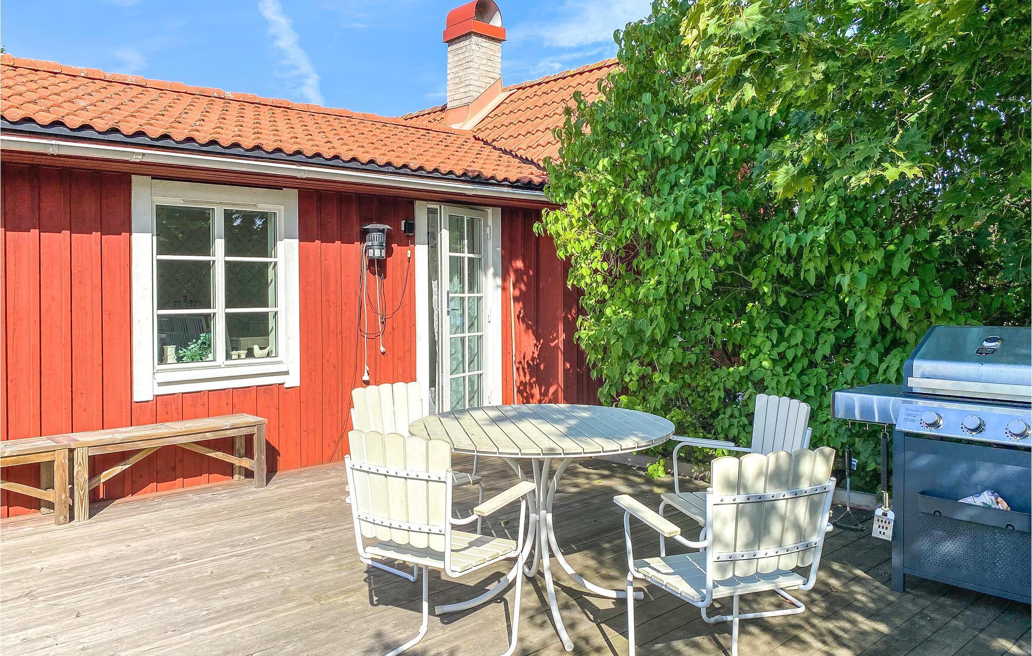 Det typiske, røde svenske hus har en træterrasse, så I kan gå i solen hele dagen og afslutte aftenen med at grille og lege.