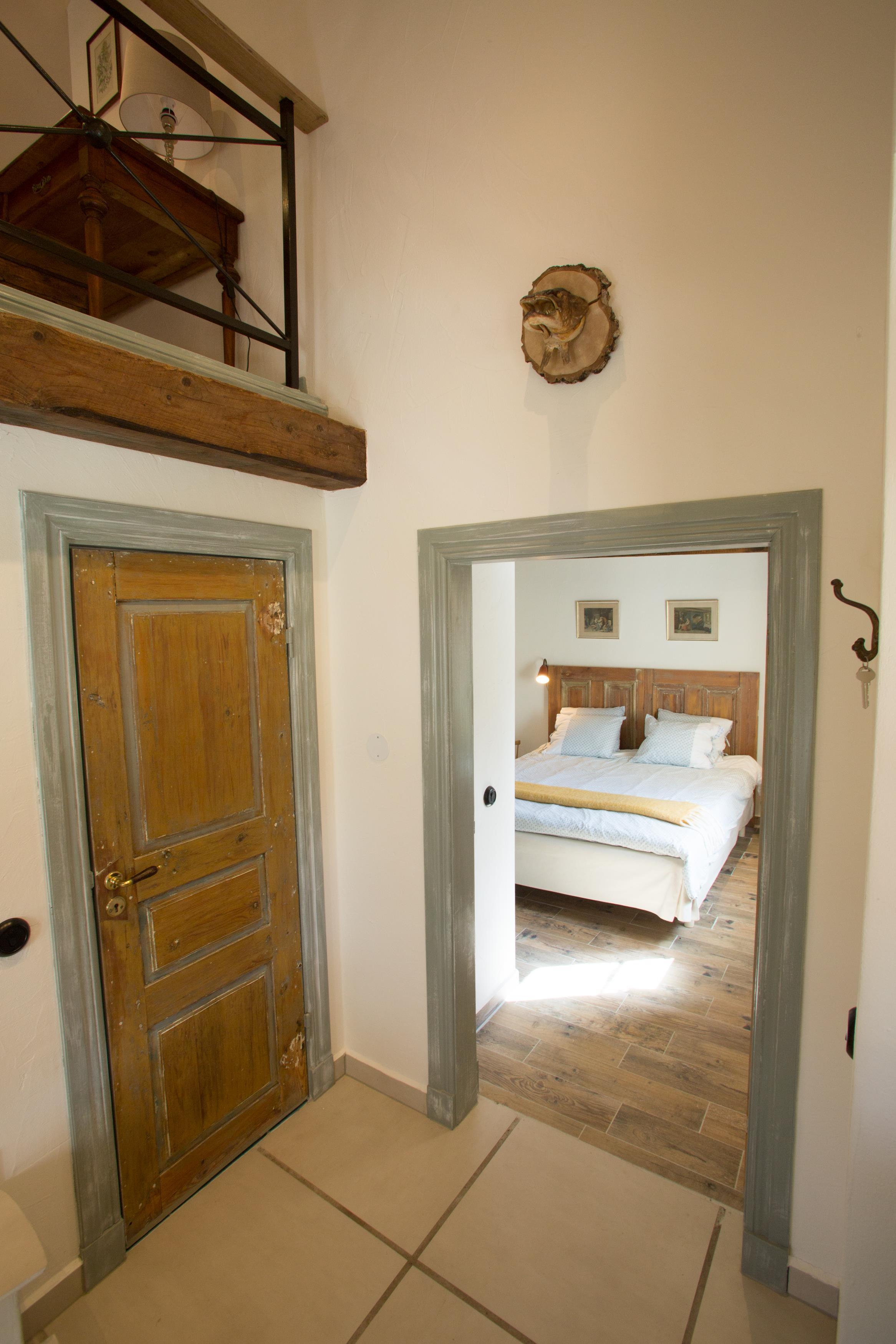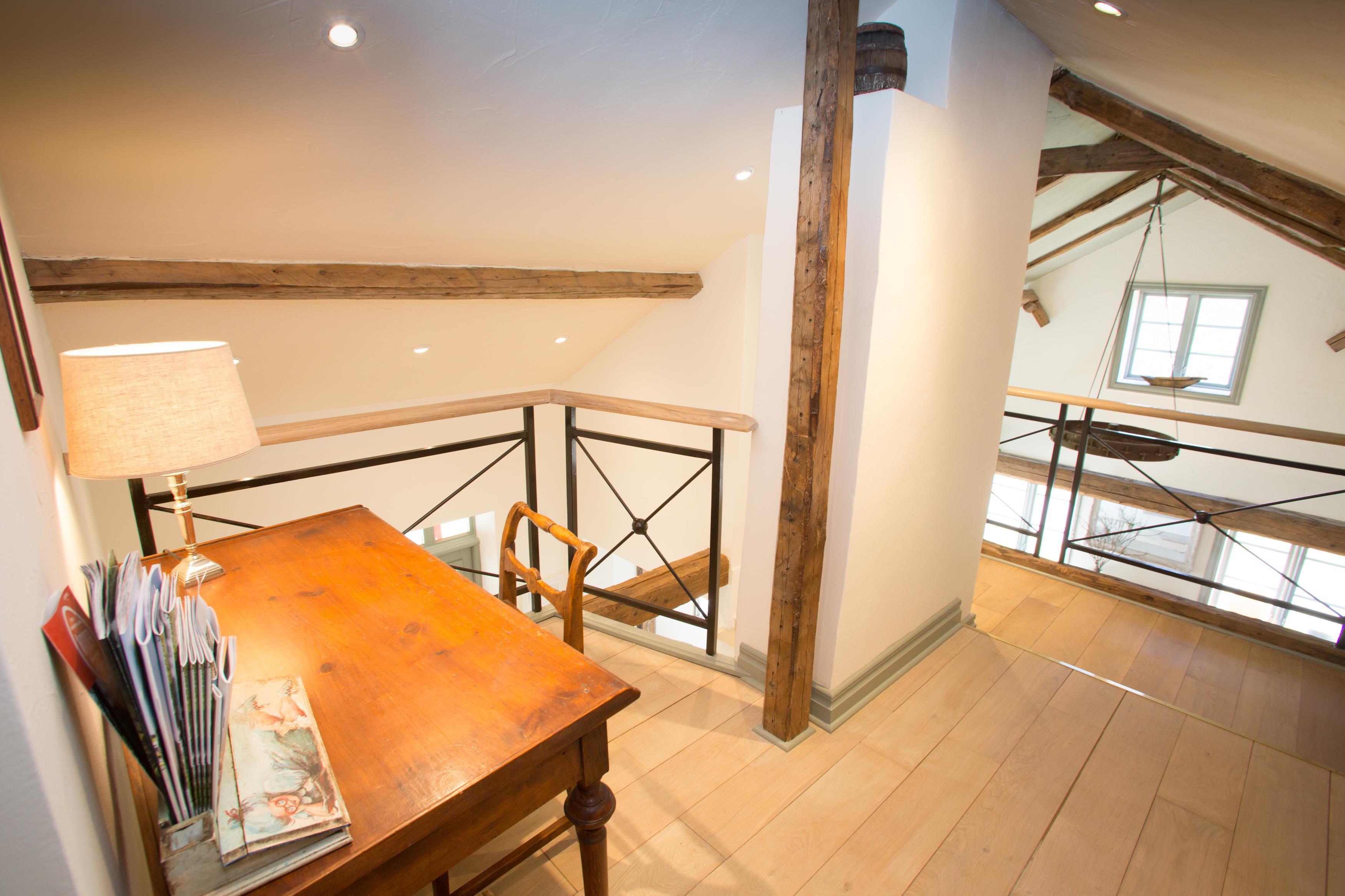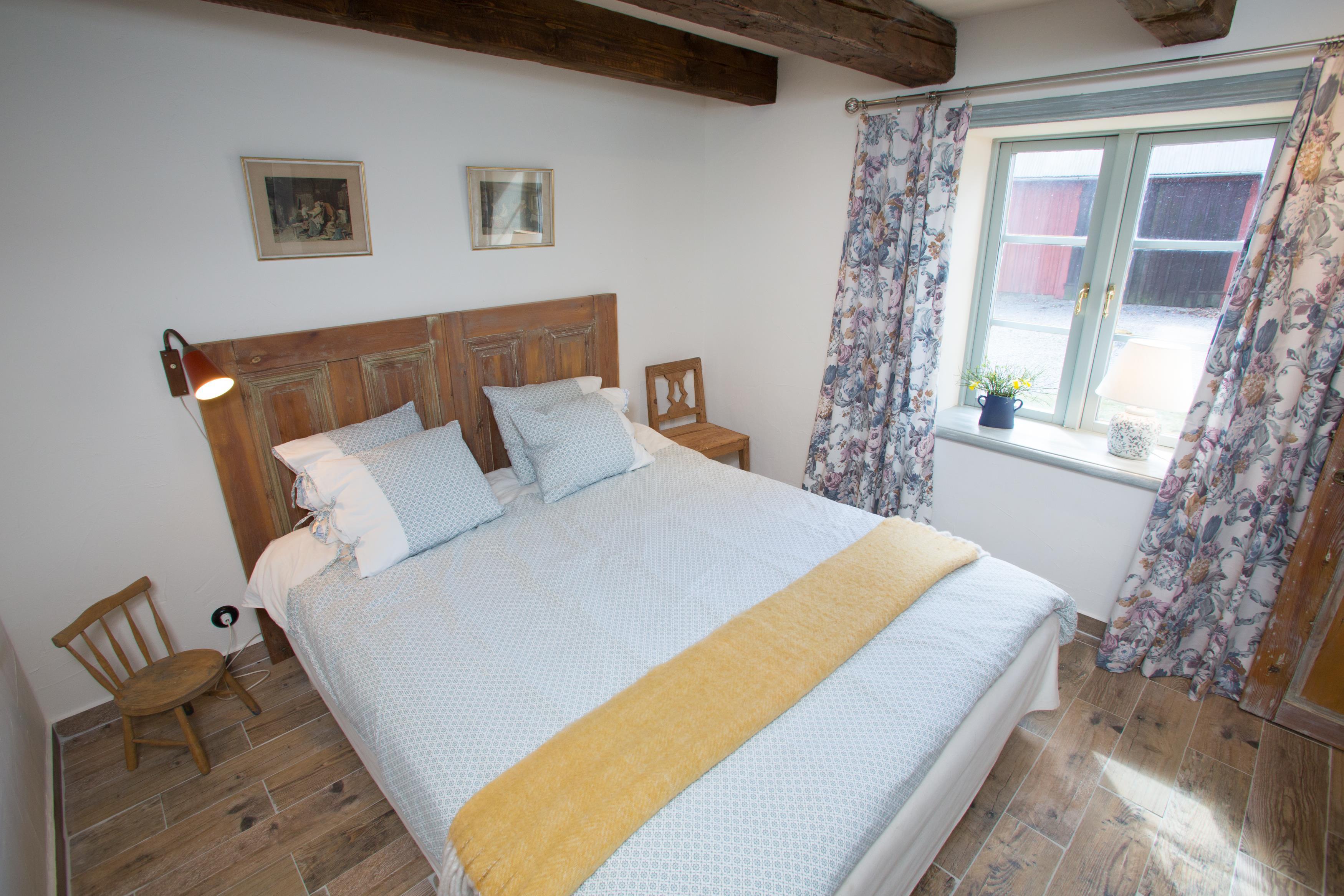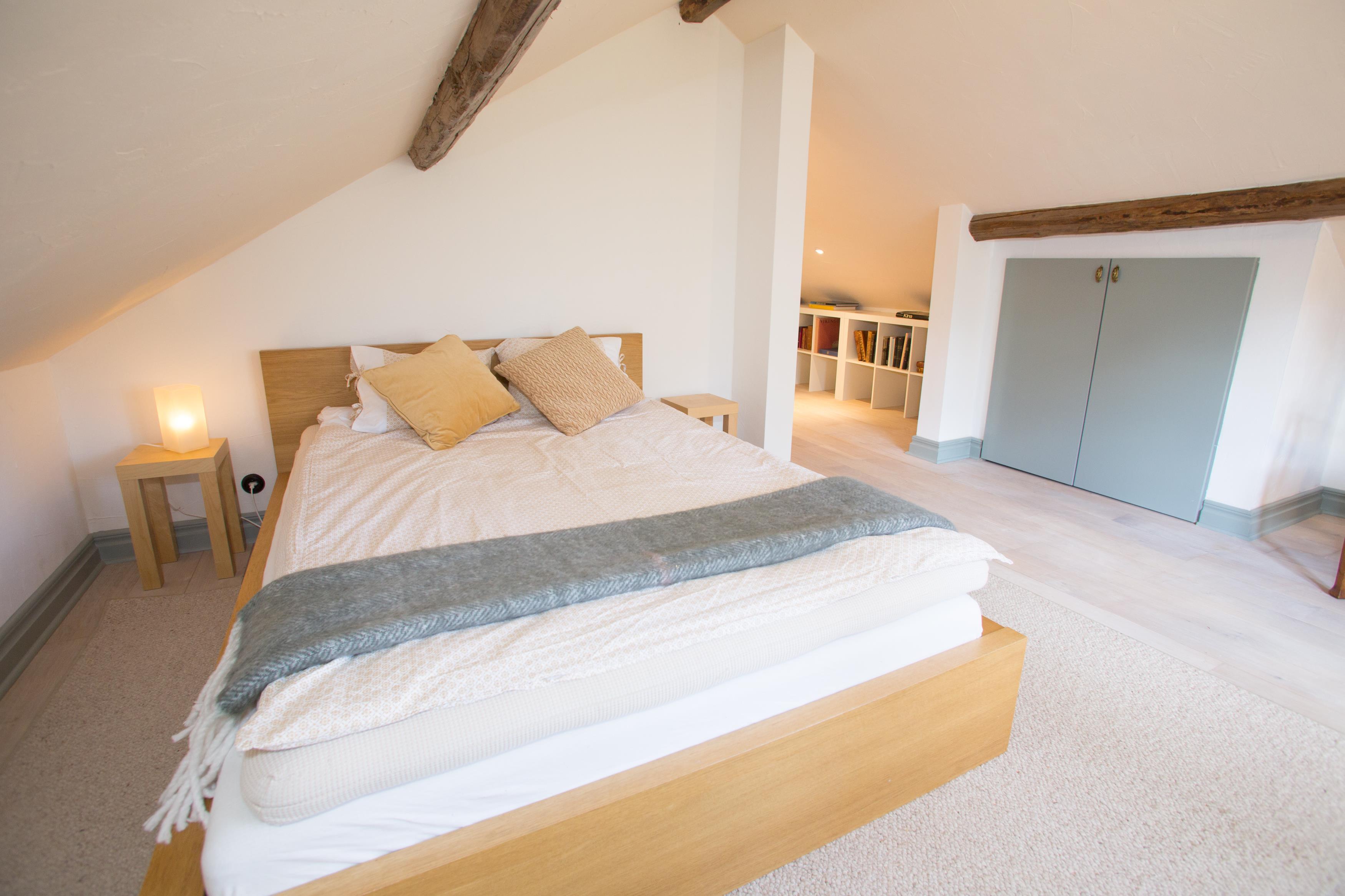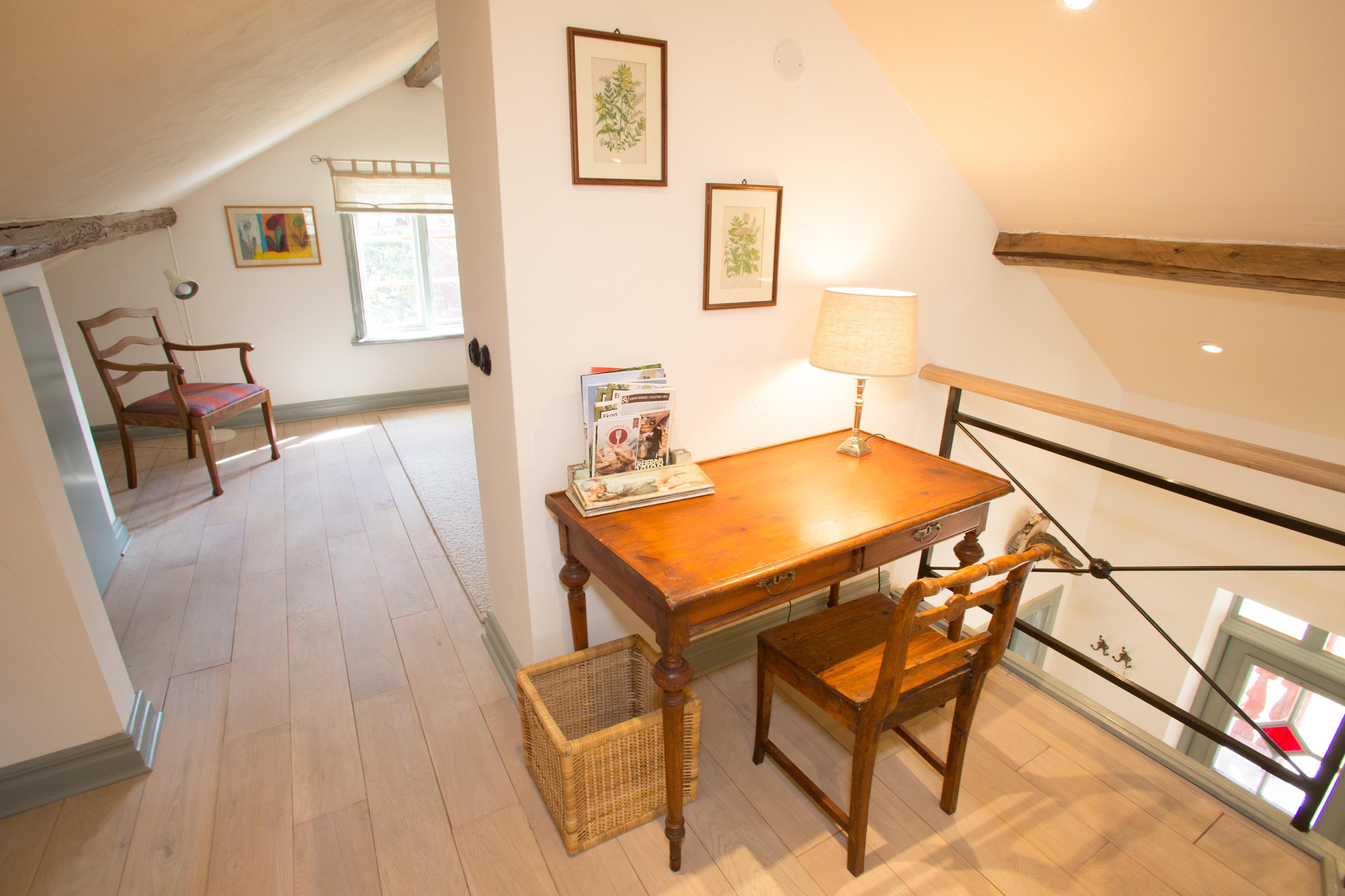 På første sal, oven for trappen, er der indrettet en arbejdsplads med skrivebord, så dette hus er også meget velegnet, hvis der er nogen, der har brug for måske at arbejde eller studere i et par timer, selv om I er på ferie. Heroppe er der også et soveværelse med en dobbeltseng (140 cm bred). Der er ingen dør ind til dette soveværelse.