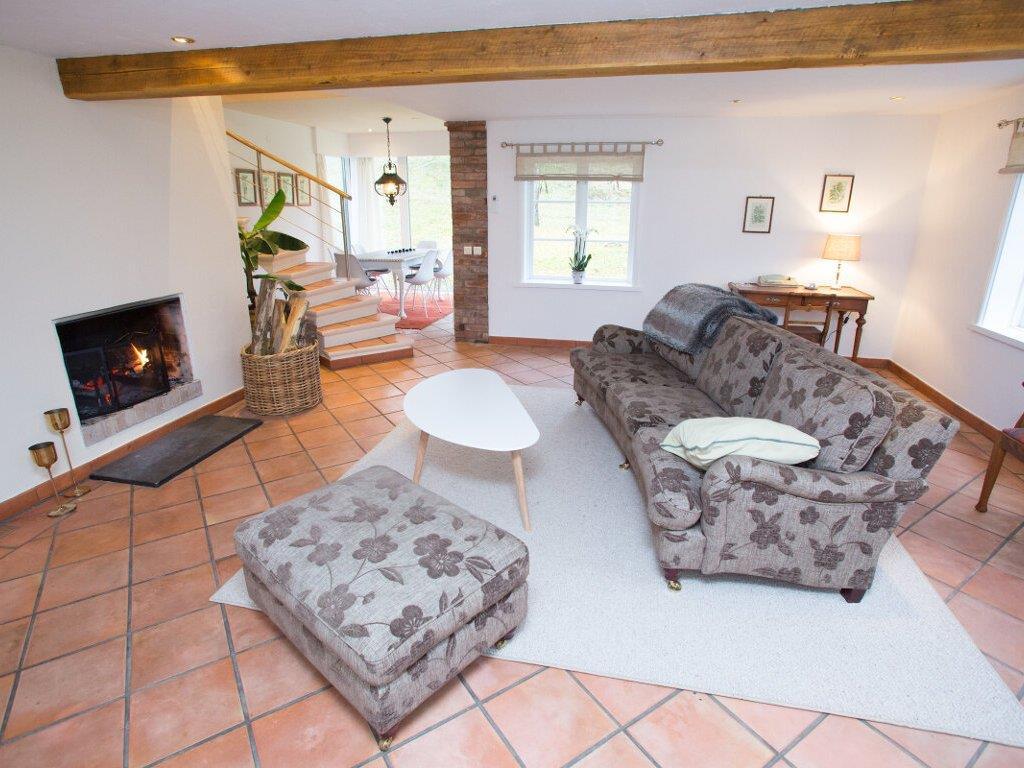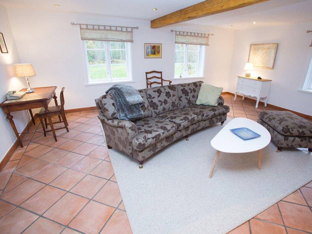 I stueetagen er der et meget veludstyret køkken med siddepladser og en spisestue med store vinduer, så i næsten kan spise ”ude i det grønne”. Møblerne i stuen er behagelige at sidde i, og der er en åben pejs, der giver både hygge, varme og en skøn atmosfære. Der er klinker på gulvet og gulvvarme, så der altid er en jævn og behagelig varme og et behageligt indeklima. Der er også toilet i stueetagen.