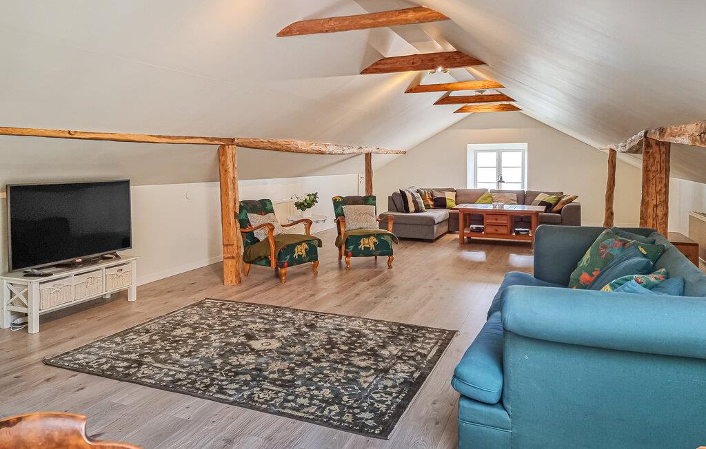 Lad jer byde velkommen af ??den lyse og venlige atmosfære i jeres feriehus. Udnyt den store stue ovenpå, slap af i den store hjørnesofa og nyd stimulerende samtaler i behagelige lænestole. Beundr de rustikke træbjælker, der giver rummet en særlig karakter. Nyd den lyse spiseplads under ovenlysvinduet, og skab hyggelige timer med familie eller venner. Tilbered lækre måltider i det moderne udstyrede køkken. Udnyt den store arbejdsflade, lav mad sammen og nyd jeres måltider ved træbordet.