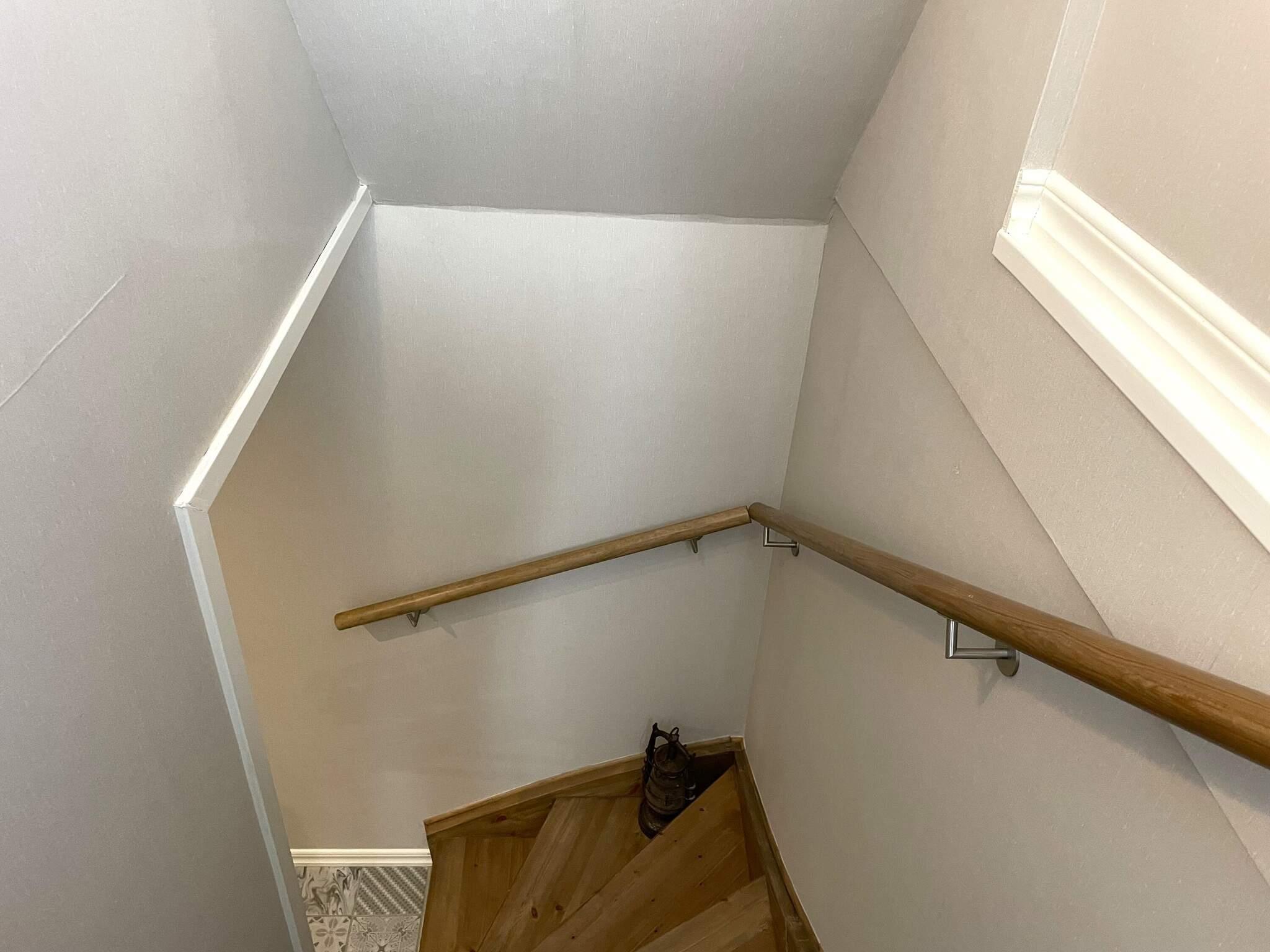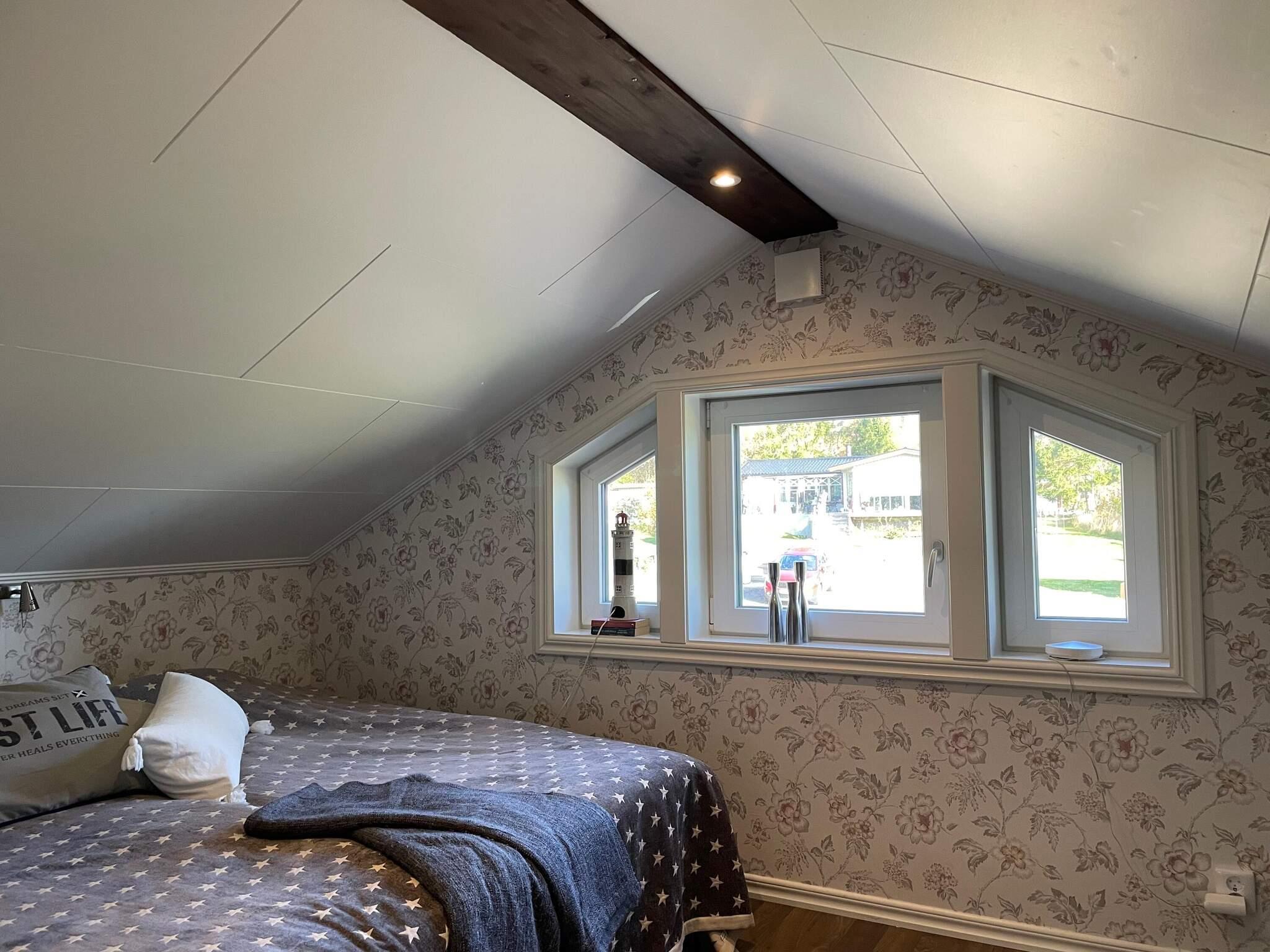 Trappen upp leder er till själva boendet. Här kommer du rakt in i det trevliga allrummet med ljus och hemtrevlig stil. Träbalken i taket har spotlight och fåtöljen man ser är även bäddbar, som kan bli en enkelsäng. Köksbordet har plats för 4 personer. Det finns det mesta du kan behöva i detta välutrustade kök. Kyl med frys samt mikrovågsugn. Längst in är sovrummet med en dubbelsäng på 180 cm. Det finns också en extra bädd, en resårmadrass som man nyttja som är under dubbelsängen. Lägenheten har ett mysigt snedtaket med en öppen planlösning men du kan gå raklång i stort sett i hela boendet. Boendet är en lägenhet som delar tomt med husägarna som är mycket trevliga. På baksidan finns en altan där man kan njuta av stilla kvällar med sjöbris. Ett stenkast på knappt 3 min promenadavstånd kommer du ner till en av alla de härliga badplatserna som finns.