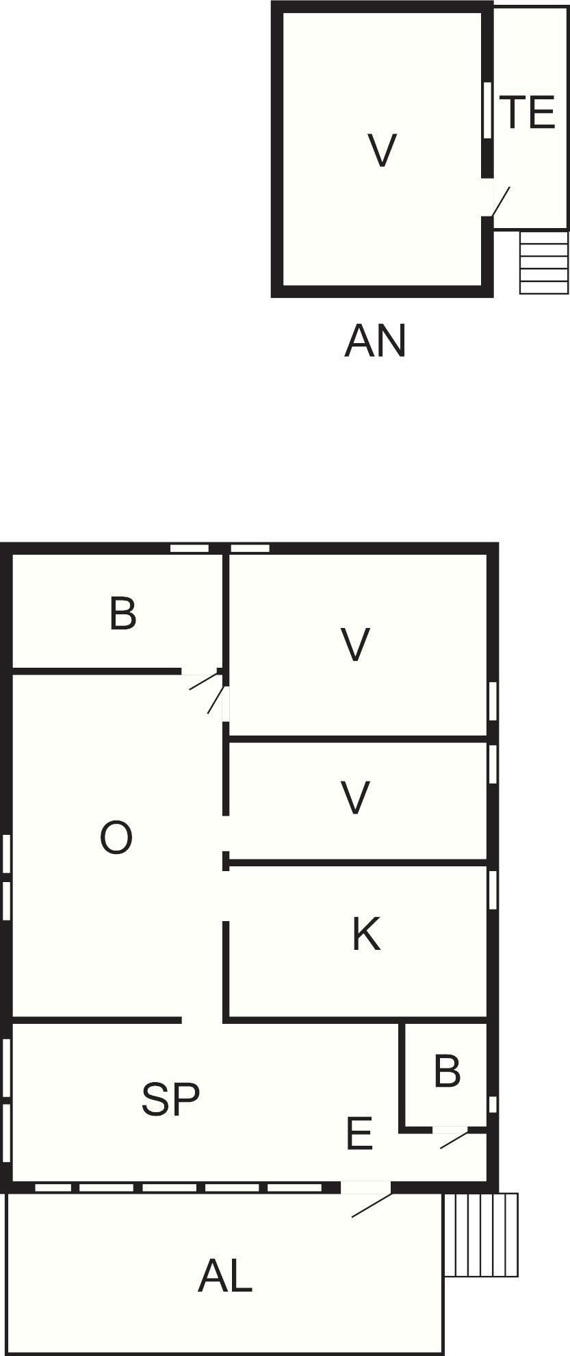 Stugans entré är från en rymlig altan. Vid entrén finns duschrummet, hallen och ett vardagsrum med matbord. Köket är välutrustat med allt ni behöver för er semester. Ett sovrum har en dubbelsäng och ett en enkelsäng. Badrummet har wc och tvättställ. Vardagsrummet i stugans mitt har bekväma sittmöbler och stor modern TV. Här finns gratis wifi. Altanen under tak vid entrén har matbord och utemöbler samt grill. Intill finns gäststugan som har en våningssäng och gott om plats. Utanför finns en liten terrass.