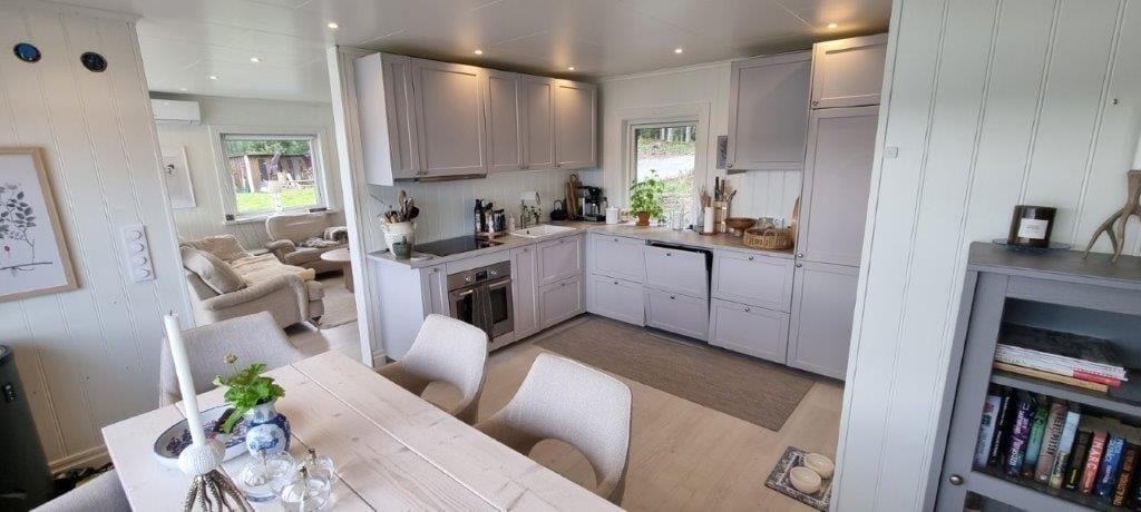 Det moderne sommerhus, opført i 2021, byder på cirka 70 m² beboelsesareal med moderne komfort i naturskønne omgivelser. Derudover står to separate gæstehuse på hver 16 m² til rådighed – ideelt for familier eller vennepar, der ønsker at holde ferie sammen. Der er i alt tre soveværelser fordelt på tre bygninger. I hovedhuset findes et soveværelse med dobbeltseng, og i hvert af de to gæstehuse står yderligere en dobbeltseng til rådighed. Det åbne køkken er veludstyret med elektrisk komfur, ovn, køle- og fryseskab, opvaskemaskine, mikrobølgeovn, kaffemaskine samt et spisebord med en fantastisk udsigt over søen – ideelt til selvforplejning. Stuen har en hyggelig sofagruppe, en brændeovn, et tv og internet. Store panoramavinduer giver en uforstyrret udsigt til vandet. Fra opholdsrummet har du adgang til en vinterhave og en stor veranda med flere siddepladser – det perfekte sted at nyde udsigten hele dagen. Badeværelset er udstyret med toilet, bruser og vaskemaskine. En centralvarme og gulvvarme på badeværelset sørger for behagelige temperaturer året rundt.