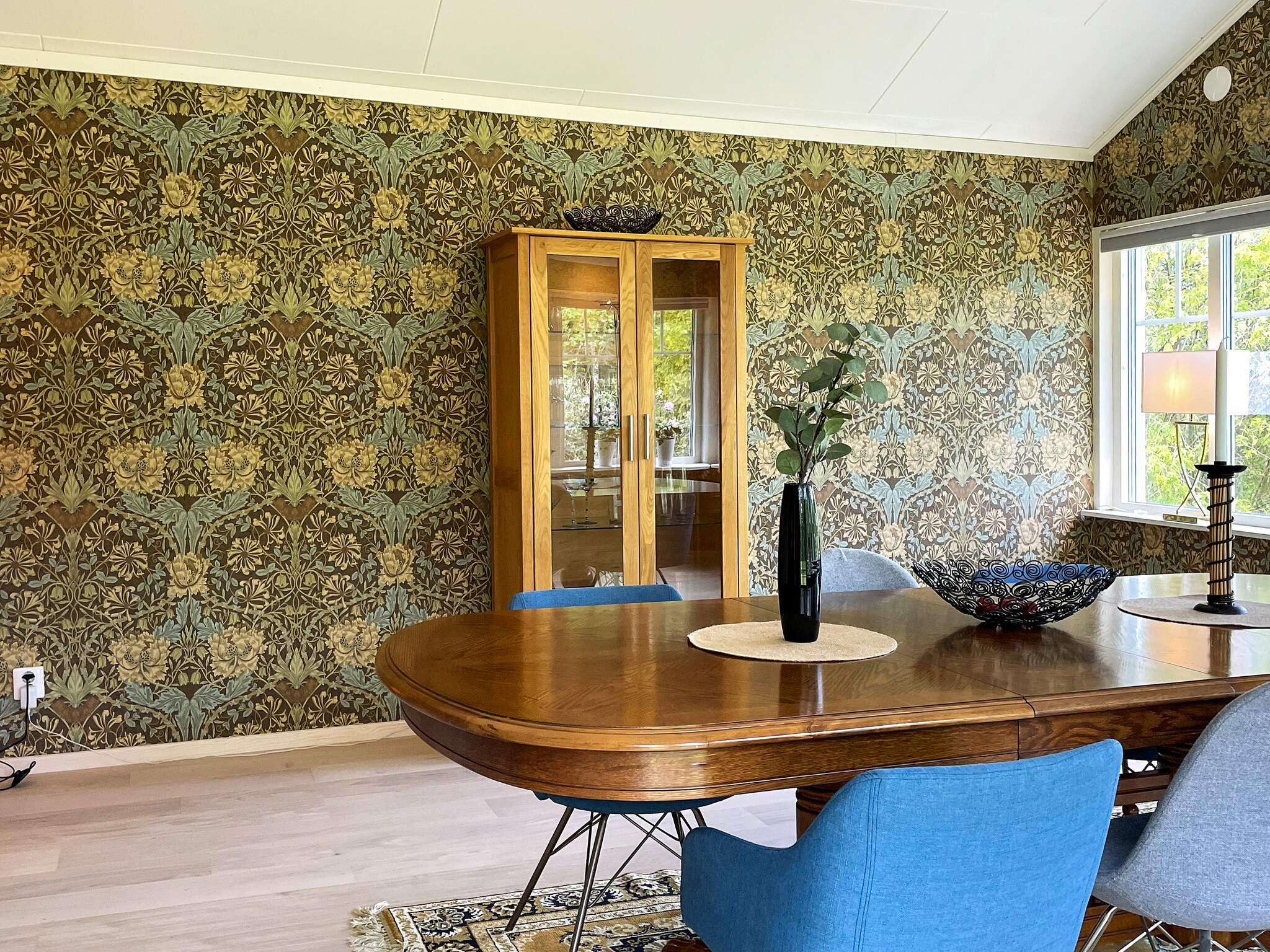 Direkt till vänster av entrén är köksdelen med spis, micro, kyl och frys. Här finns det mesta du kan behöva. Till höger finner du matplats för minst 6 personer. I vardagsrummet står en kamin som värmer gott om kyliga kvällar. smart-Tv med fåtöljer och en bäddsoffa står här intill.