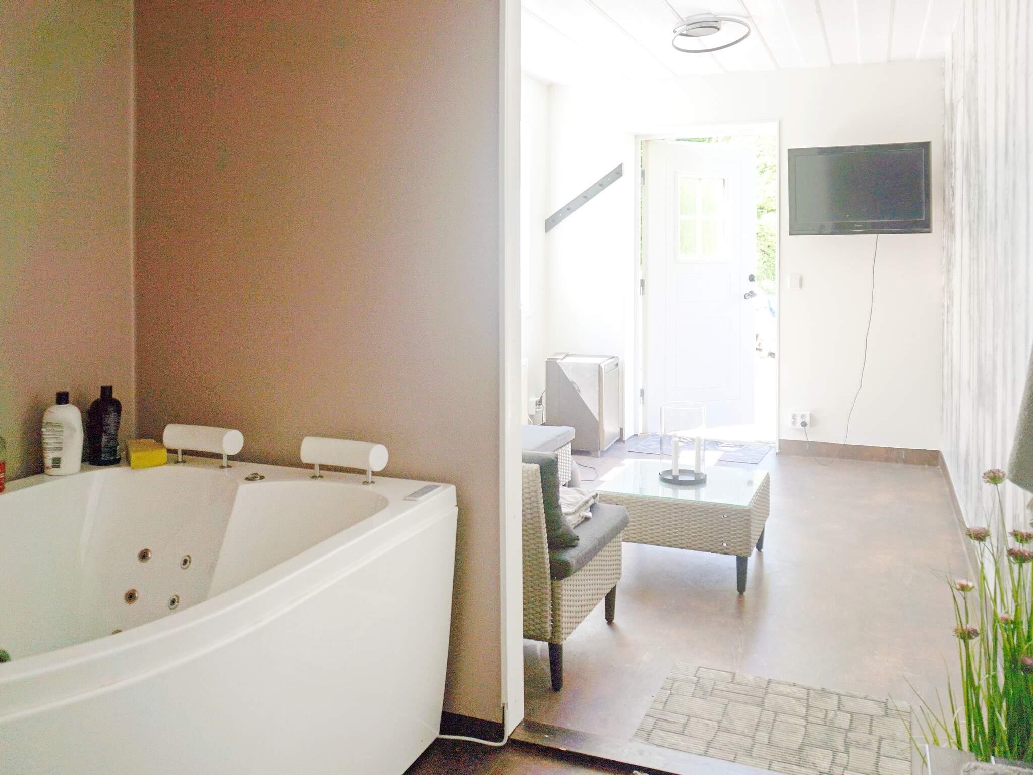 Huset är ett sutteränghus och i nedre plan, som nås utifrån på baksidan, finns ett SPA ni får låna/hyra på förfrågan men som även disponeras av ägaren. Här kan ni njuta av infraröd bastu kombinerad med traditionell bastu samt ett härligt bubbelbad för bokning. Slå er ner i loungedelen med en god dryck eller varför inte ute i en bekväm stol blickandes över ängen.